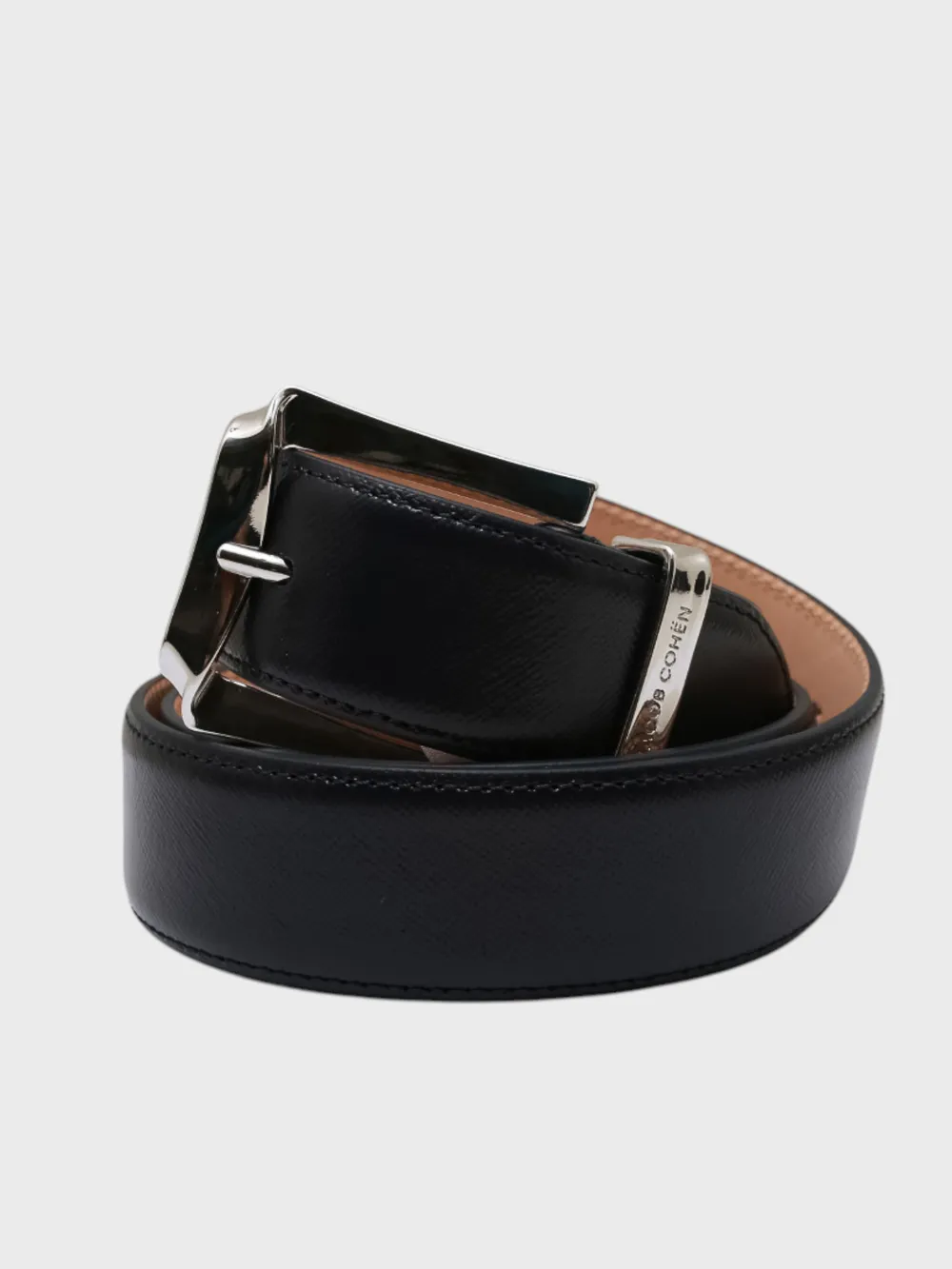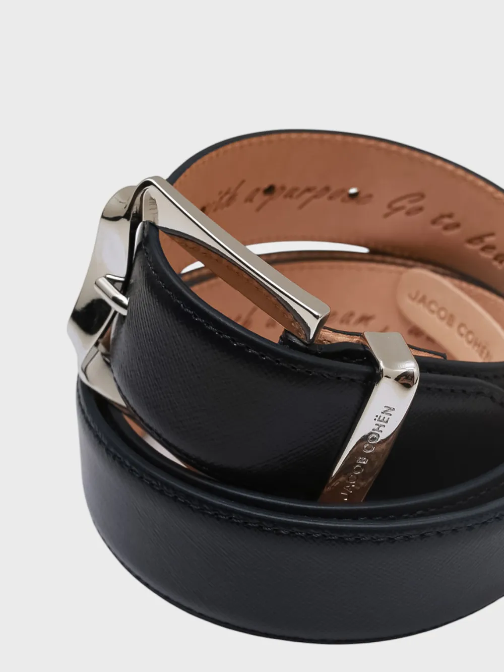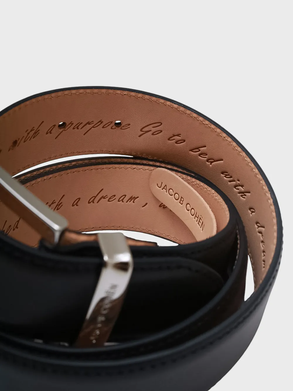 Ремень Jacob Cohen выполнен из высококачественной кожи с двухсторонним дизайном. С одной стороны ремень имеет черный цвет с текстурой, а с другой — коричневый гладкий слой. Модель дополнена металлической пряжкой серебристого цвета с выбитым логотипом бренда "Jacob Cohen", которая обеспечивает надежное крепление. Особенностью этого ремня является обратная сторона, где нанесено вдохновляющее цитатой: "Go to bed with a purpose, wake up with a dream" (Ложись спать с целью, просыпайся с мечтой). Этот ремень идеально подходит для создания как делового, так и повседневного образа, добавляя элемент индивидуальности и стиля.