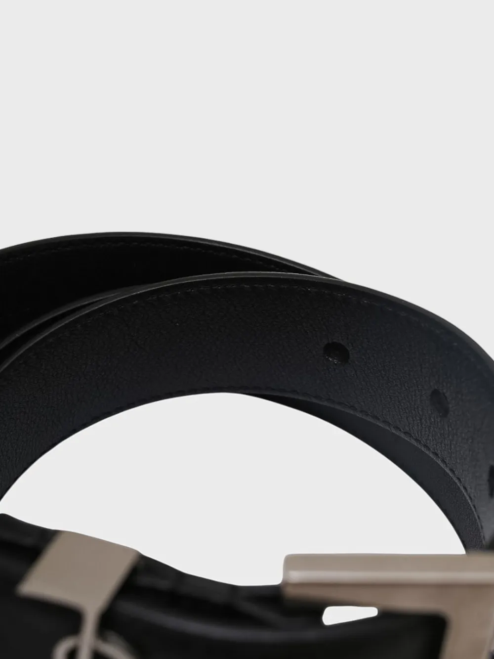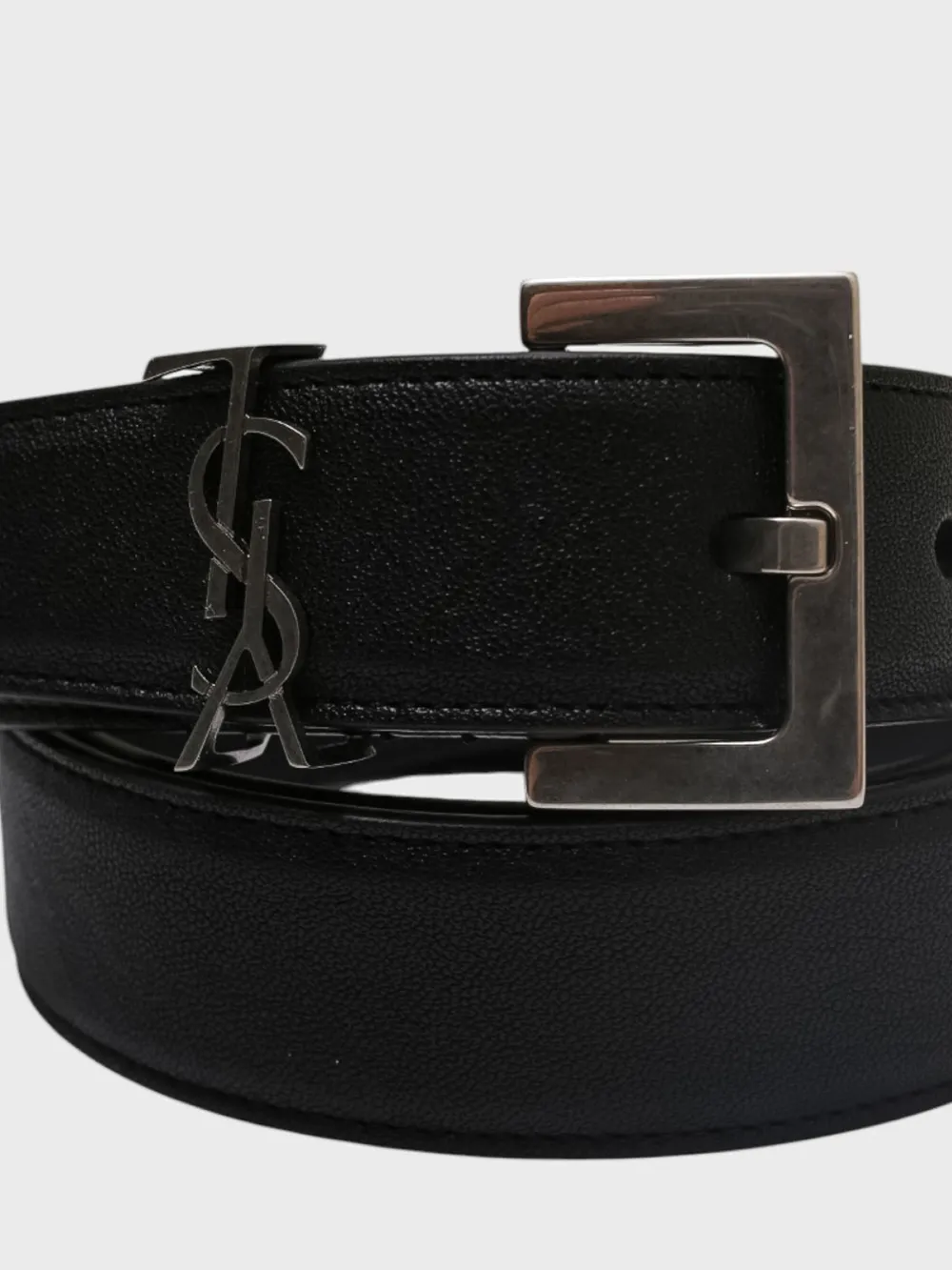 Ремень Saint Laurent выполнен из высококачественной черной кожи с фактурным граненым текстурным покрытием. Дизайн акцентирован крупным металлическим логотипом "YSL" на пряжке, которая сочетает матовый и полированный эффекты. Модель дополнена прочной застежкой и внутренней подкладкой для комфорта. Классический черный цвет и элегантное исполнение делают этот ремень универсальным аксессуаром, подходящим как для повседневного, так и для делового стиля.