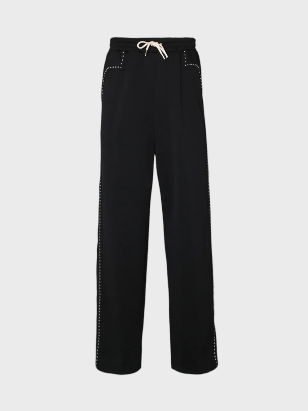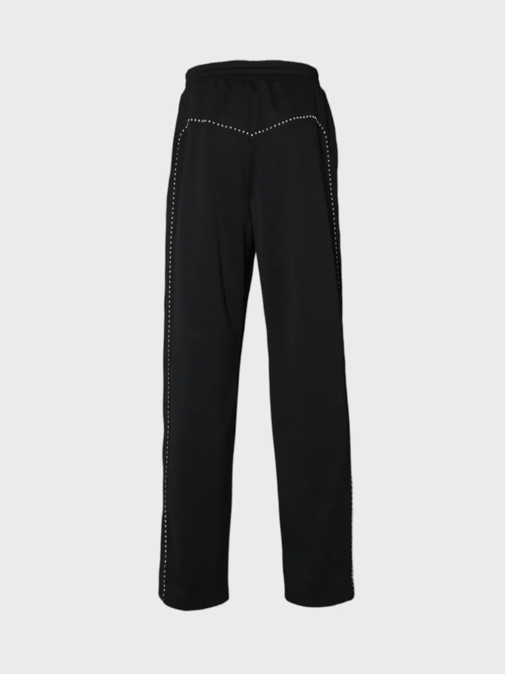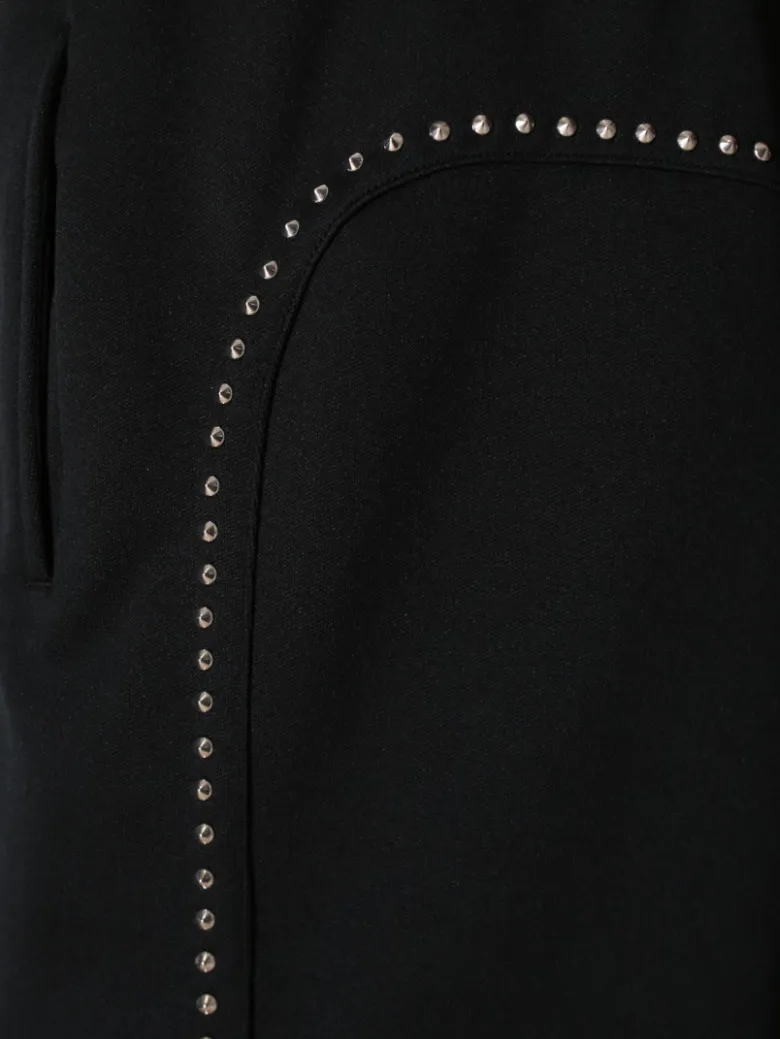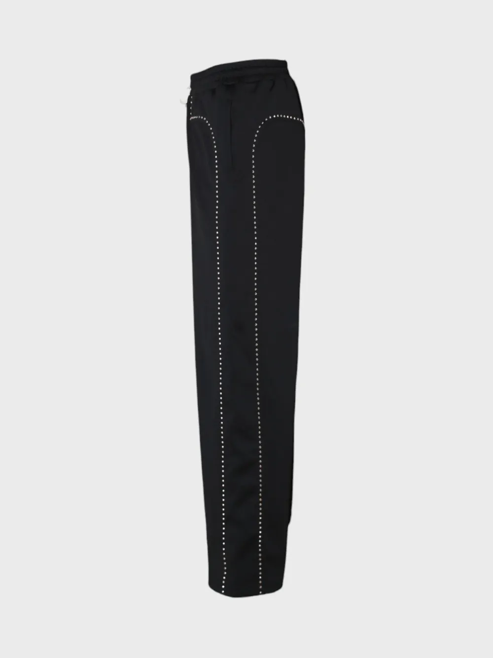 Брюки Celine выполнены из мягкого, высококачественного материала черного цвета. Модель имеет прямой крой и эластичный пояс с шнурком для регулировки размера. Особенностью этих брюк является декоративная отделка в виде рядов маленьких металлических заклепок или страз, расположенных по бокам и на карманах. Этот элемент добавляет изделию современный и стильный акцент, придавая ему более модный и уникальный вид. Брюки отличаются комфортной посадкой и универсальностью, подходящей как для повседневной носки, так и для создания различных образов. Их можно сочетать с различными верхними вещами, начиная от свитшотов и топов до рубашек и блузок, создавая как спортивные, так и более утонченные луки.