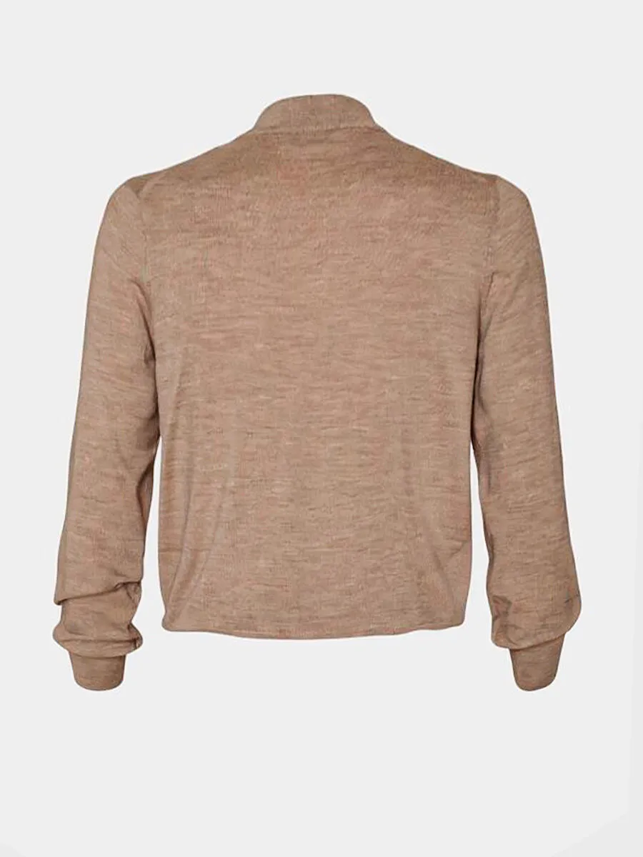 Кофта Brunello Cucinelli выполнена из тонкого шерстяного трикотажа нейтрального бежевого оттенка — сочетание утонченности и комфортной элегантности. Модель с высоким воротником, длинными рукавами и приталенным кроем подчеркивает минимализм и качество исполнения. Гладкая текстура и лаконичный дизайн делают её универсальным элементом гардероба, идеальным для повседневных образов или сочетания с более яркими аксессуарами. Истинное воплощение роскоши и мастерства бренда.