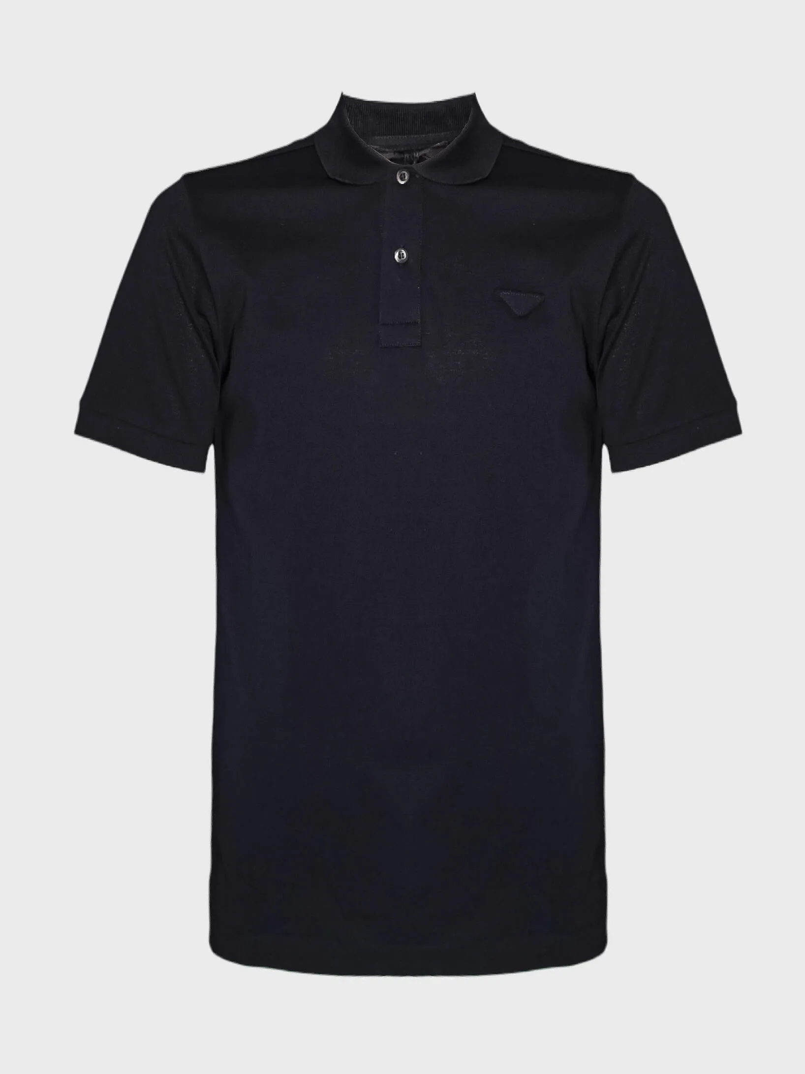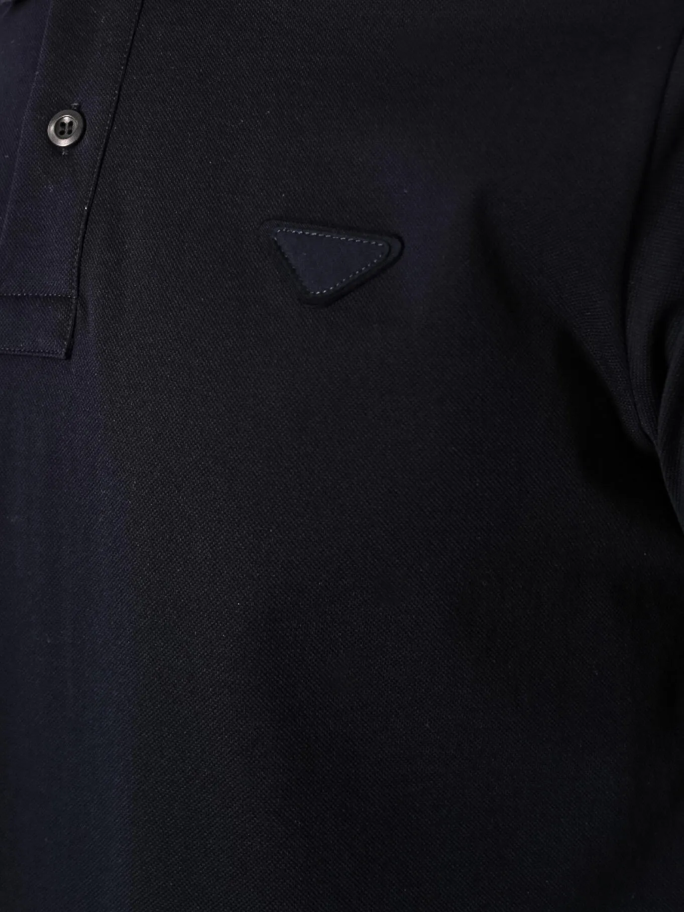 Темно-синее поло Prada, выполненное из мягкого и комфортного материала. Модель дополнена классическим воротником-поло с застежкой на пуговицы. На груди расположены две пуговицы для застежки, а также небольшой треугольный элемент, добавляющий современный акцент к классическому дизайну. Простой силуэт идеально сочетается как с повседневными, так и с более спортивными образами, подчеркивая безупречный вкус владельца.
