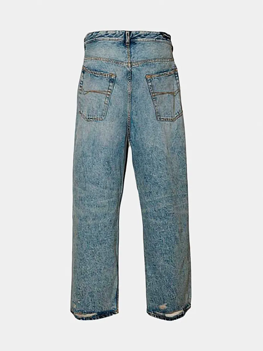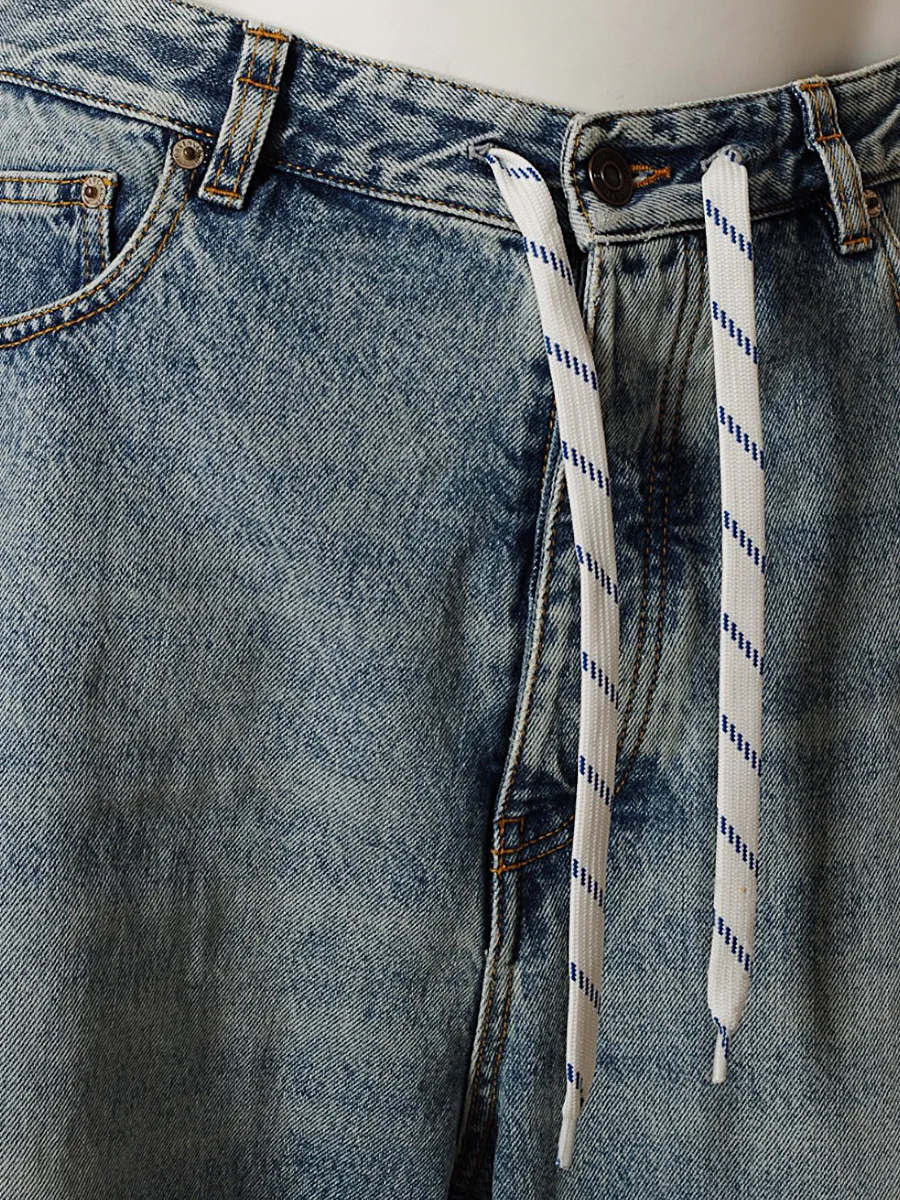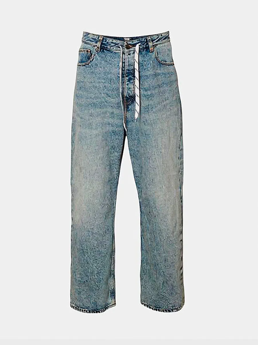 Джинсы Balenciaga выполнены из качественного премиального денима с эффектом потертости и легкой выцветшей окраски. Модель прямого кроя с высокой посадкой дополнена оригинальной деталью — контрастными белыми шнурками на талии, которые добавляют современный уличный стиль. Классическая пятикарманная конструкция и металлические заклепки завершают дизайн этих модных и комфортных джинсов.