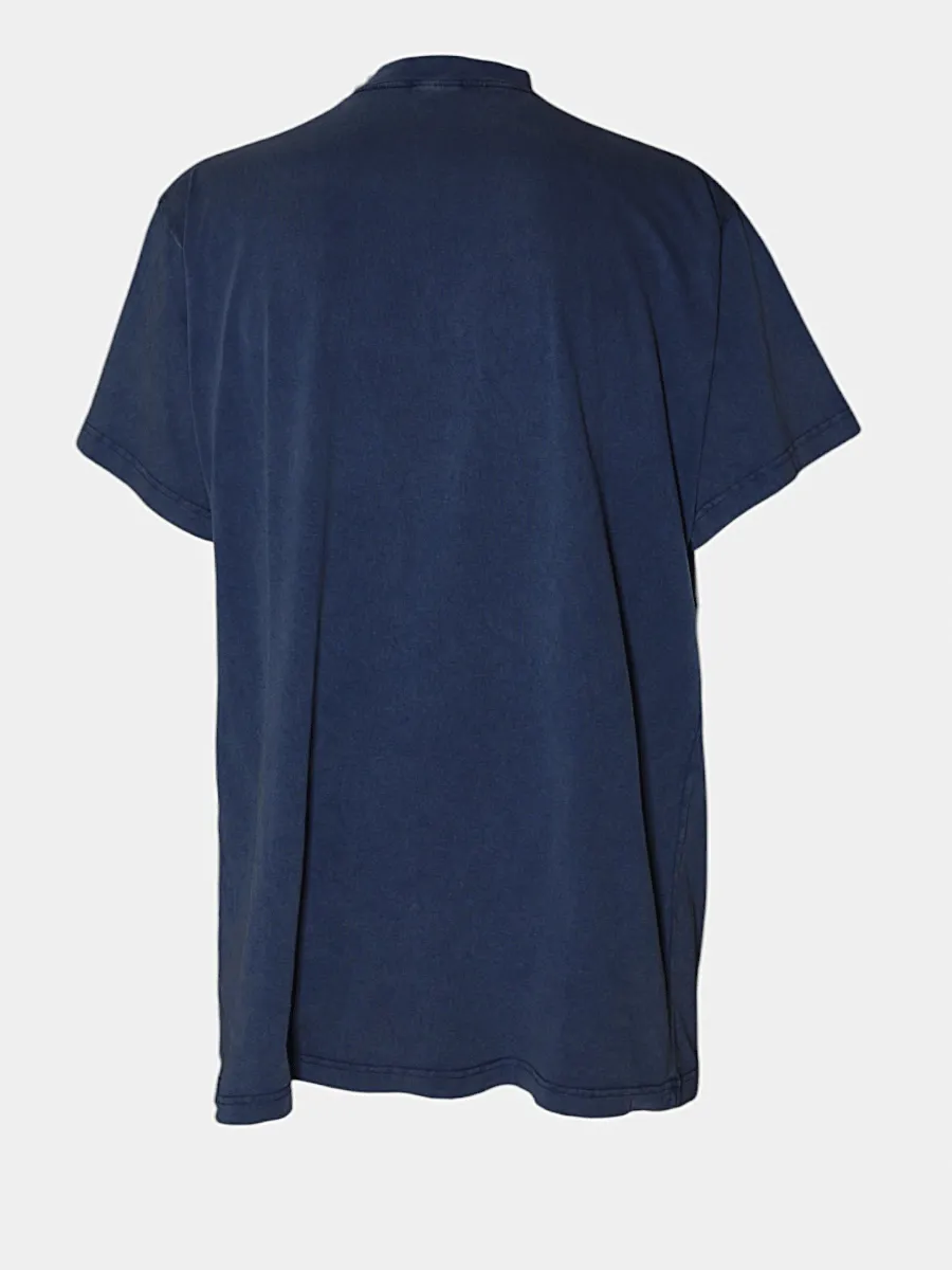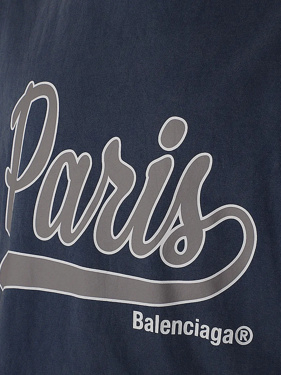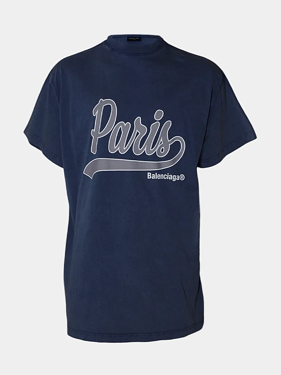 Футболка Balenciaga выполнена из хлопковой ткани тёмно-синего цвета с прямым кроем, дополнена крупным принтом «Paris» в стиле спортивного шрифта и логотипом бренда под ним; модель сочетает урбанистический характер и культурную отсылку — универсальный элемент современного повседневного образа.