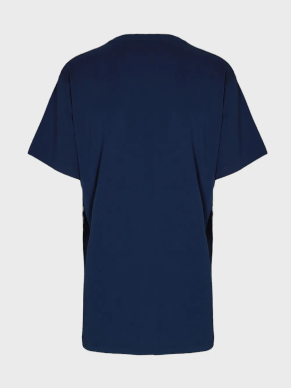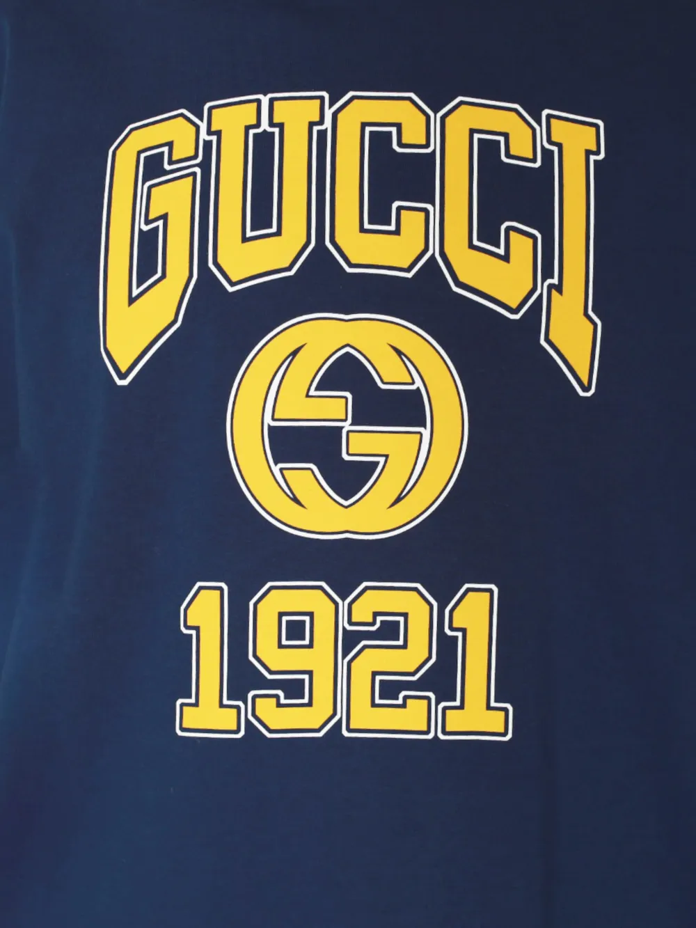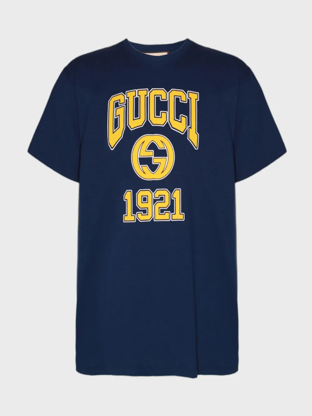 Темно-синяя футболка Gucci, выполненная из мягкого и комфортного материала. Модель дополнена крупным желтым логотипом бренда "GUCCI" с классическим переплетением букв "G" и датой "1921", что отсылает к году основания марки. Простой силуэт идеально сочетается как с повседневными, так и с более спортивными образами, подчеркивая безупречный вкус владельца.
