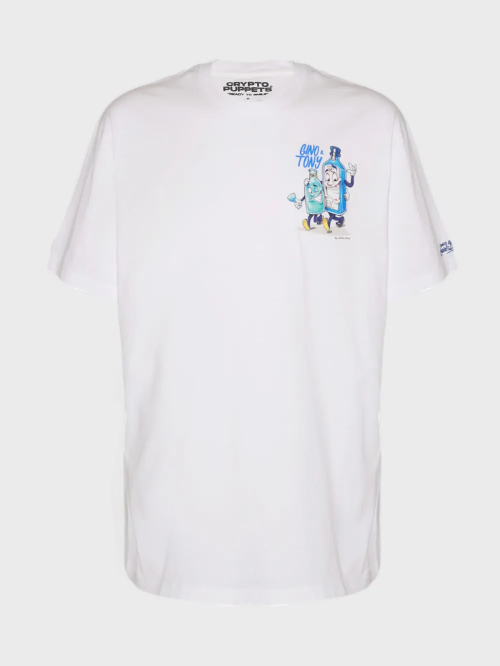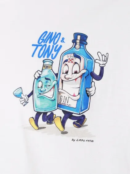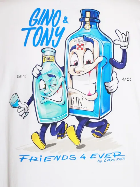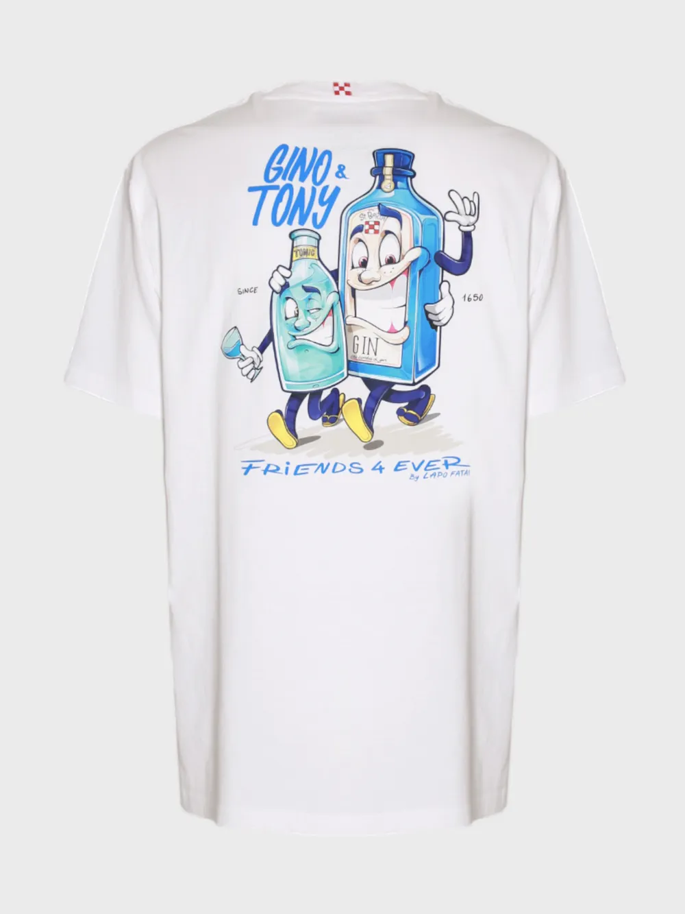 Футболка Saint Barth выполнена из натурального хлопка в чистом белом цвете. Модель дополнена круглым вырезом и короткими рукавами, что обеспечивает комфортную посадку. На передней части футболки размещено графическое изображение двух забавных персонажей-бутылок с надписью "GINO & TONY" и текстом "FRIENDS 4 EVER", добавляющее элемент стиля и юмора. Качественная отделка и стильный дизайн делают эту футболку идеальным выбором для повседневного использования или создания веселых образов.