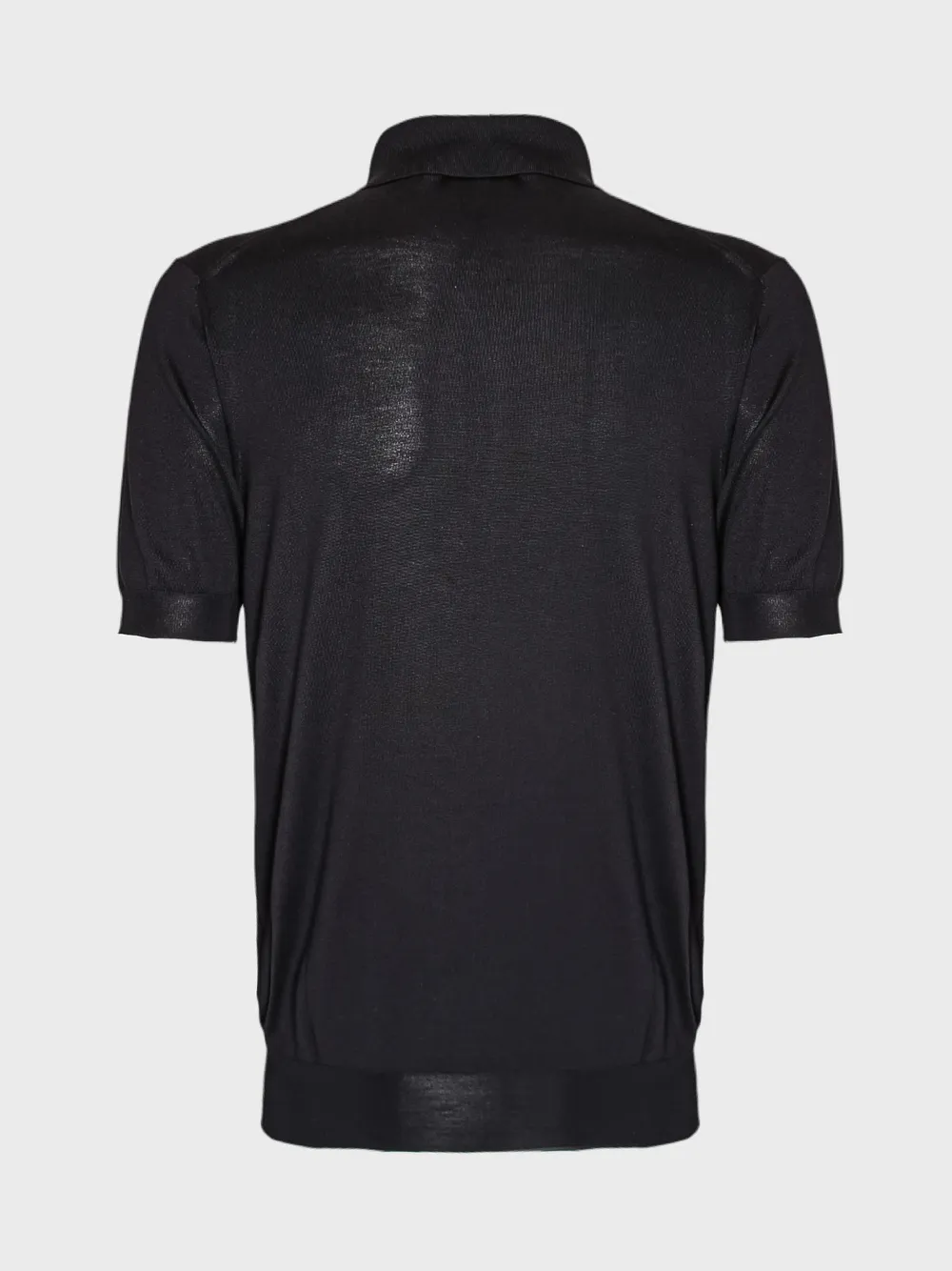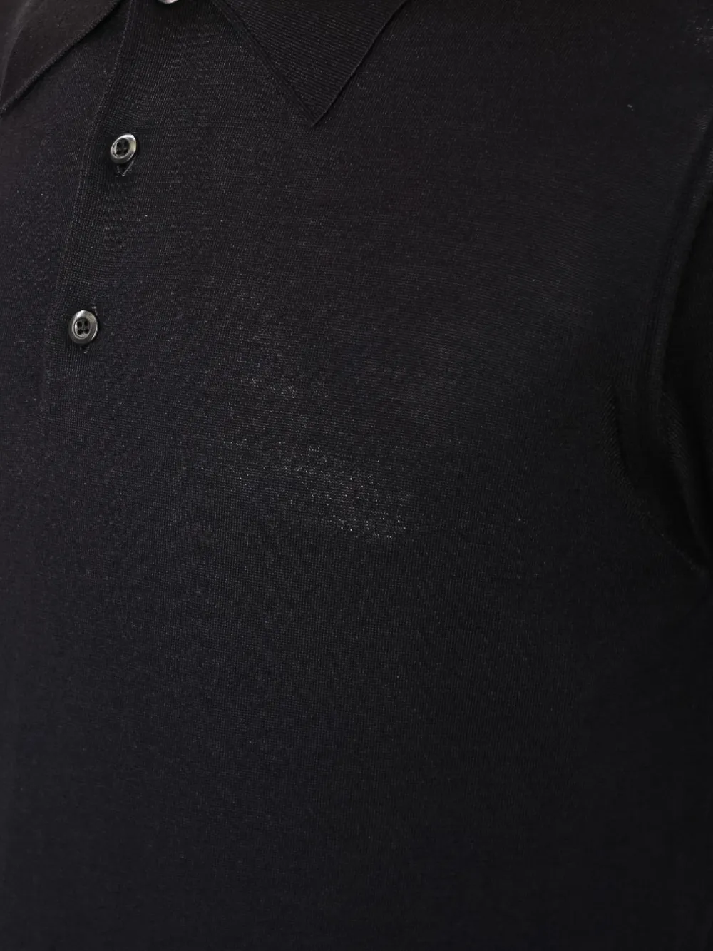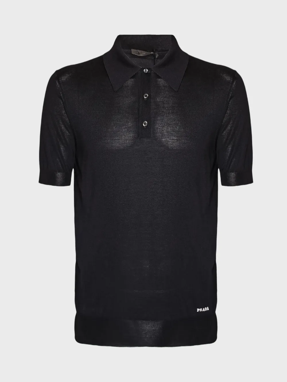 Черное поло Prada, выполненное из мягкого и комфортного материала. Модель дополнена классическим воротником-поло с застежкой на пуговицы. Особенностью этой модели является использование фактурной ткани, которая придает изделию текстуру и оригинальный внешний вид. На груди расположены две пуговицы для застежки, а на спине можно увидеть логотип бренда "PRADA". Простой силуэт идеально сочетается как с повседневными, так и с более спортивными образами, подчеркивая безупречный вкус владельца.