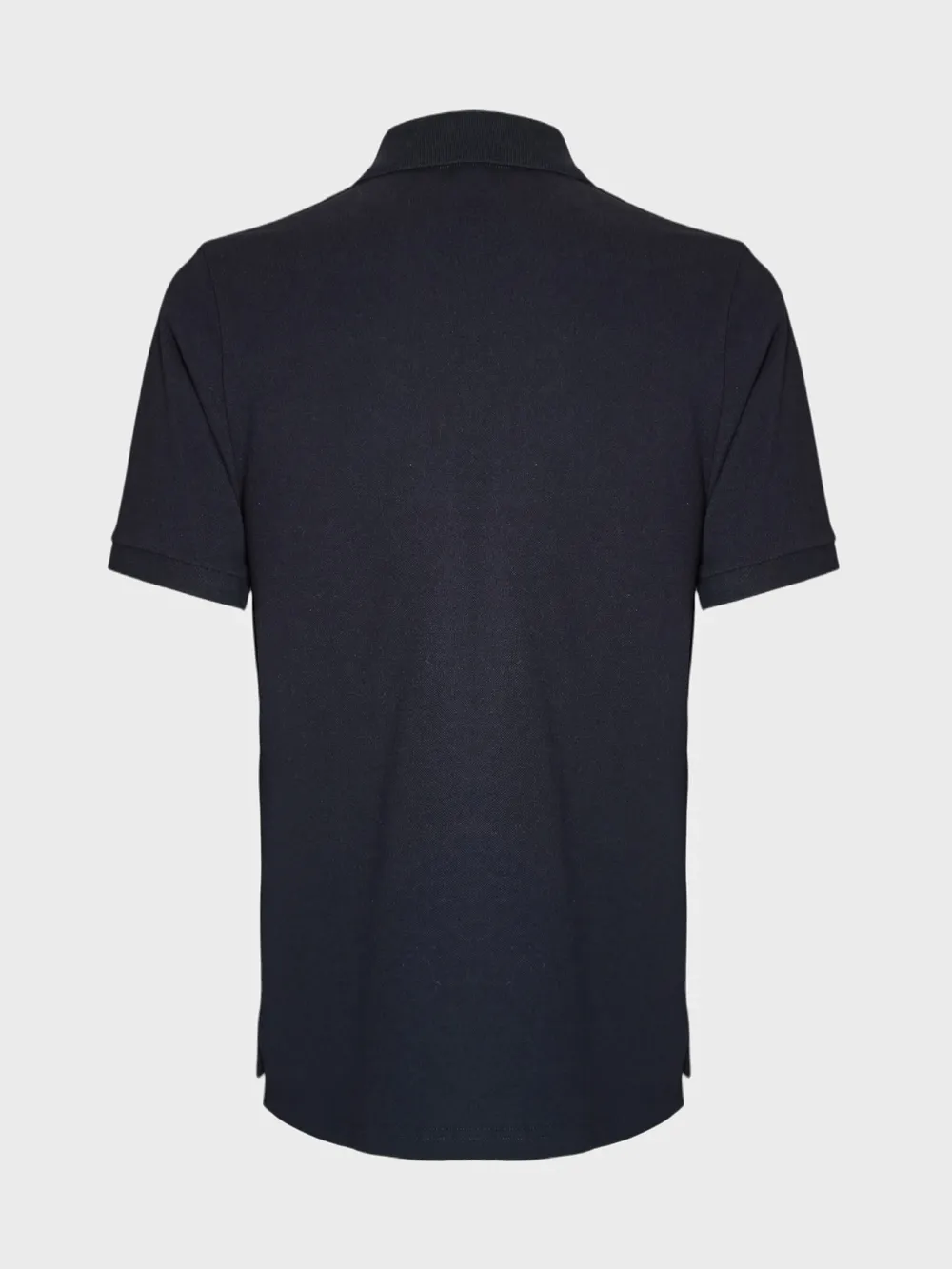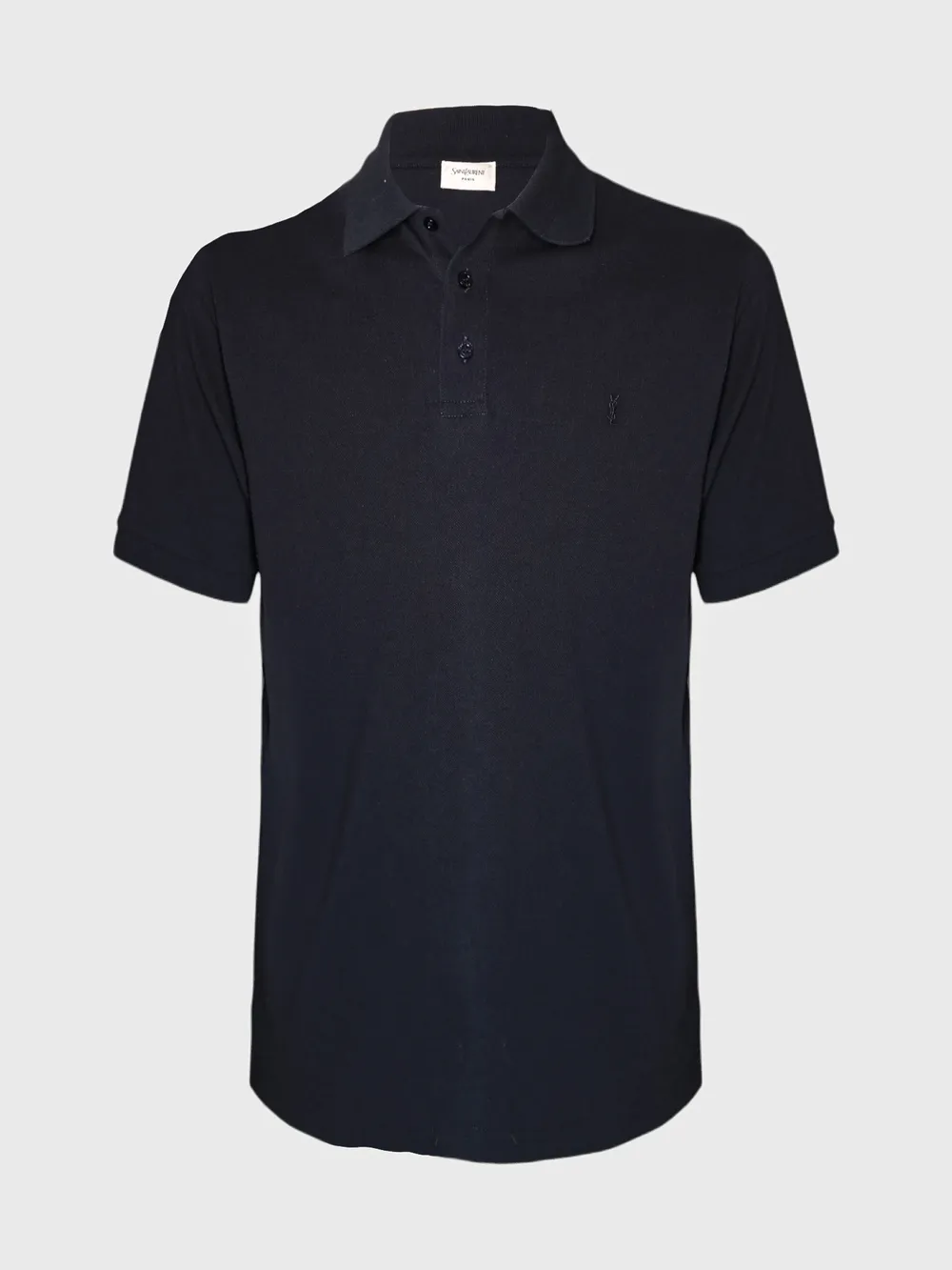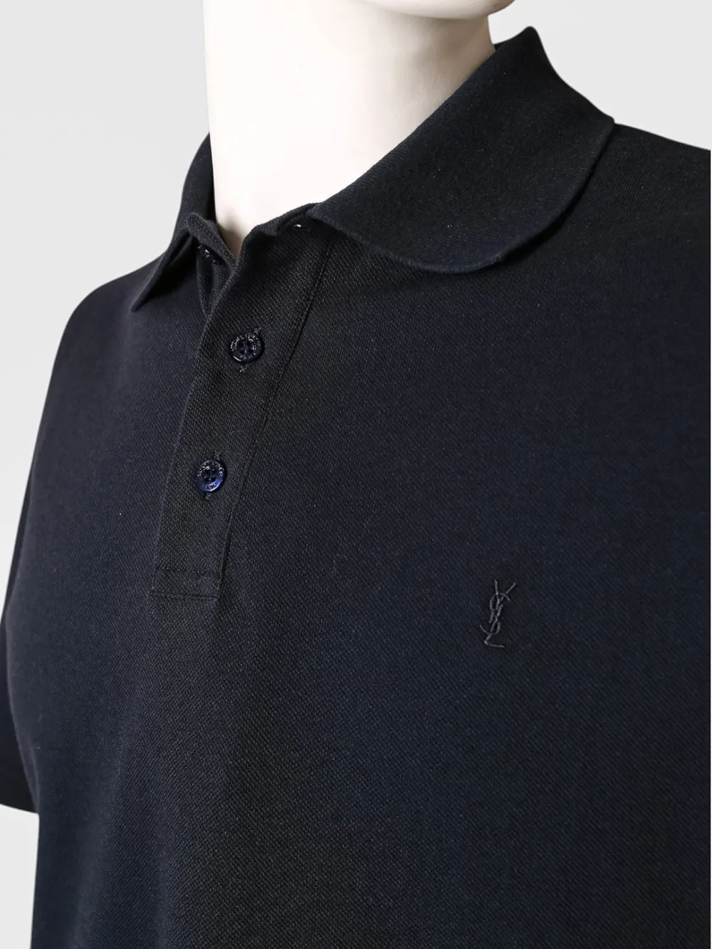 Поло Saint Laurent выполнено из плотного хлопка темно-синего цвета. Модель с классическим воротником дополнена металлическими пуговицами и миниатюрным логотипом бренда на груди, вышитым черной нитью. Простой крой и качественная отделка делают эту модель универсальным предметом гардероба для повседневного стиля.