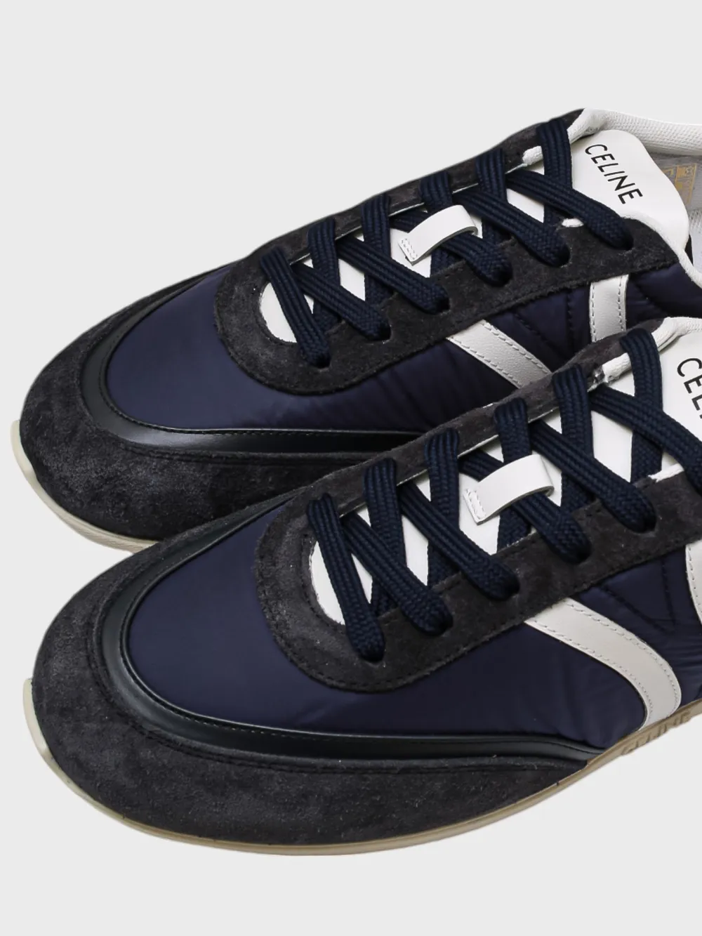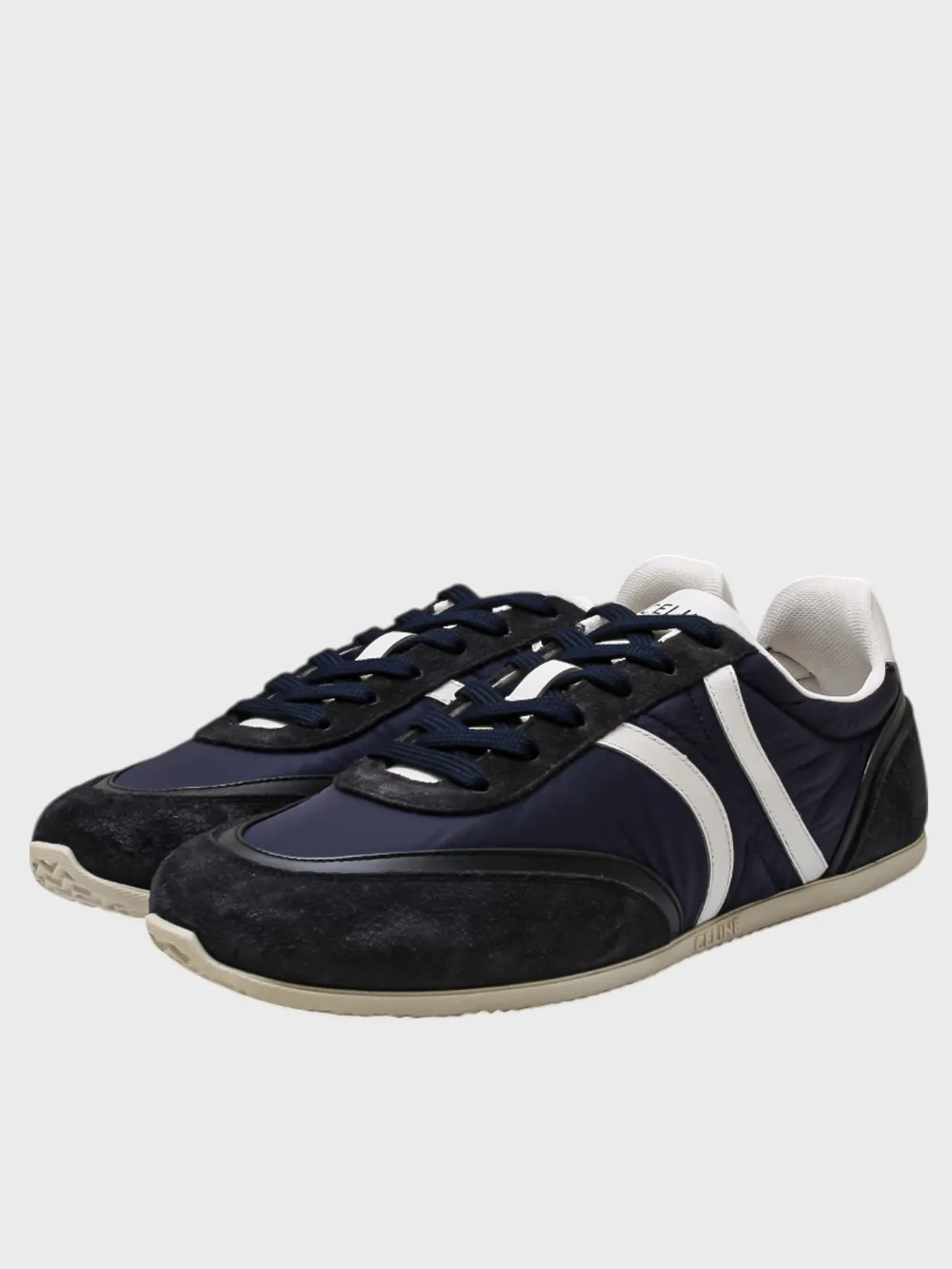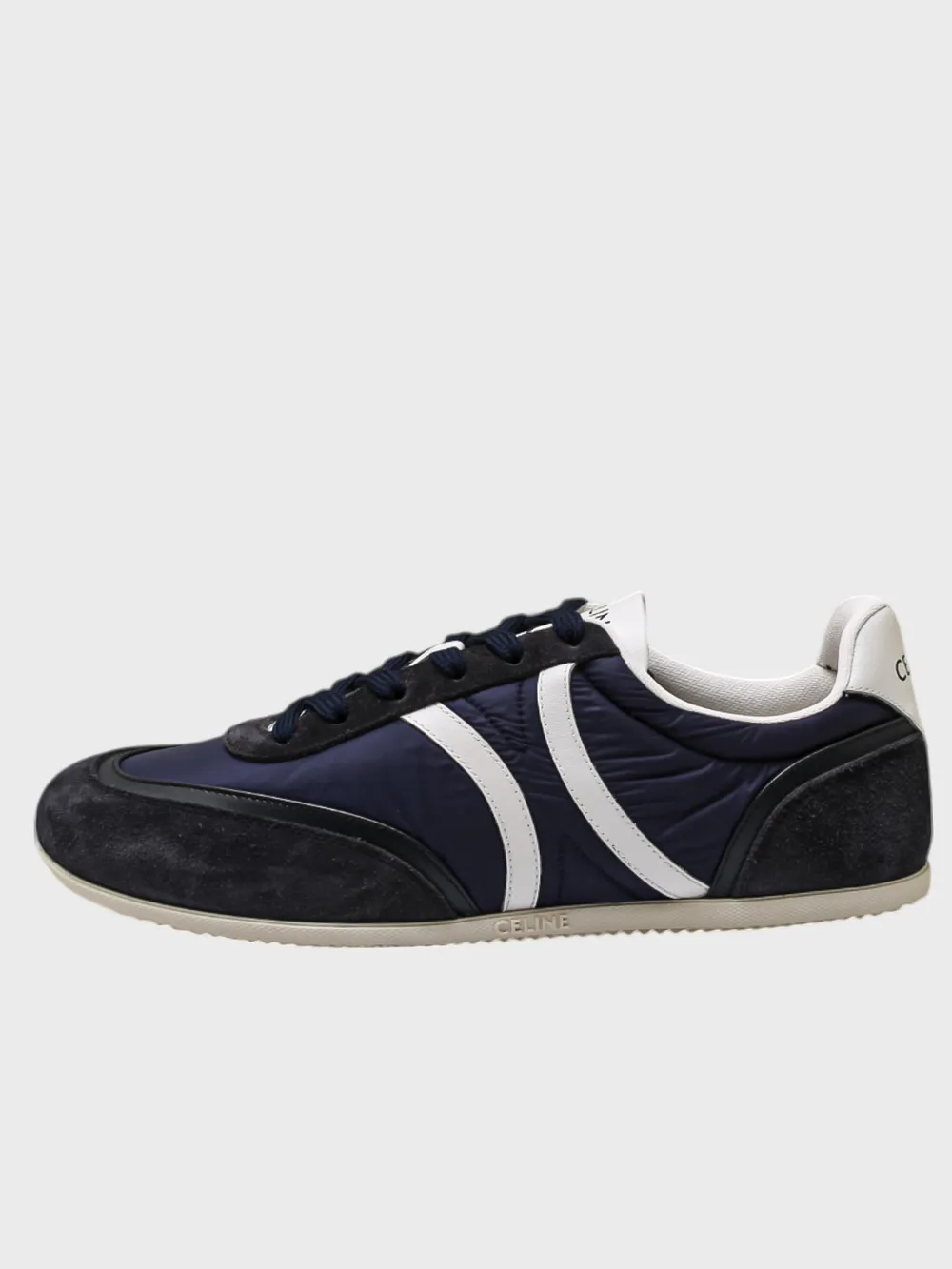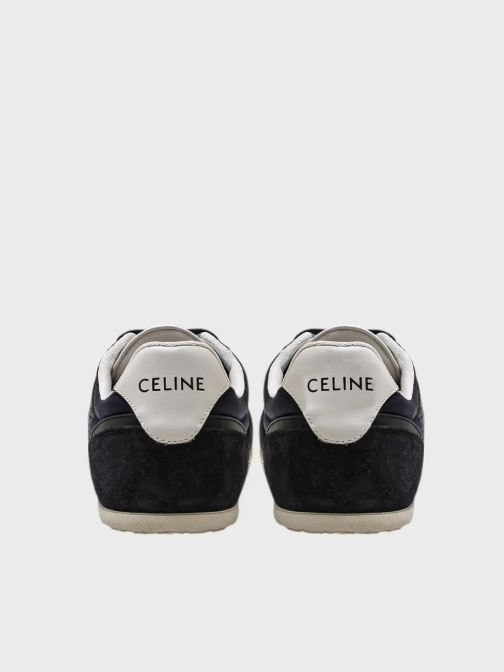 Кеды Celine выполнены из комбинации материалов, включая темно-синюю замшу и текстиль. Модель дополнена контрастными белыми полосами на боковых сторонах и шнурками темно-синего цвета. Подошва имеет двухцветное исполнение: верхняя часть светлая, а нижняя — темная. На задней части кед виден логотип бренда "CELINE". Лаконичный дизайн и высокое качество материалов делают эти кеды идеальным выбором для повседневной носки с элементами спортивного стиля.