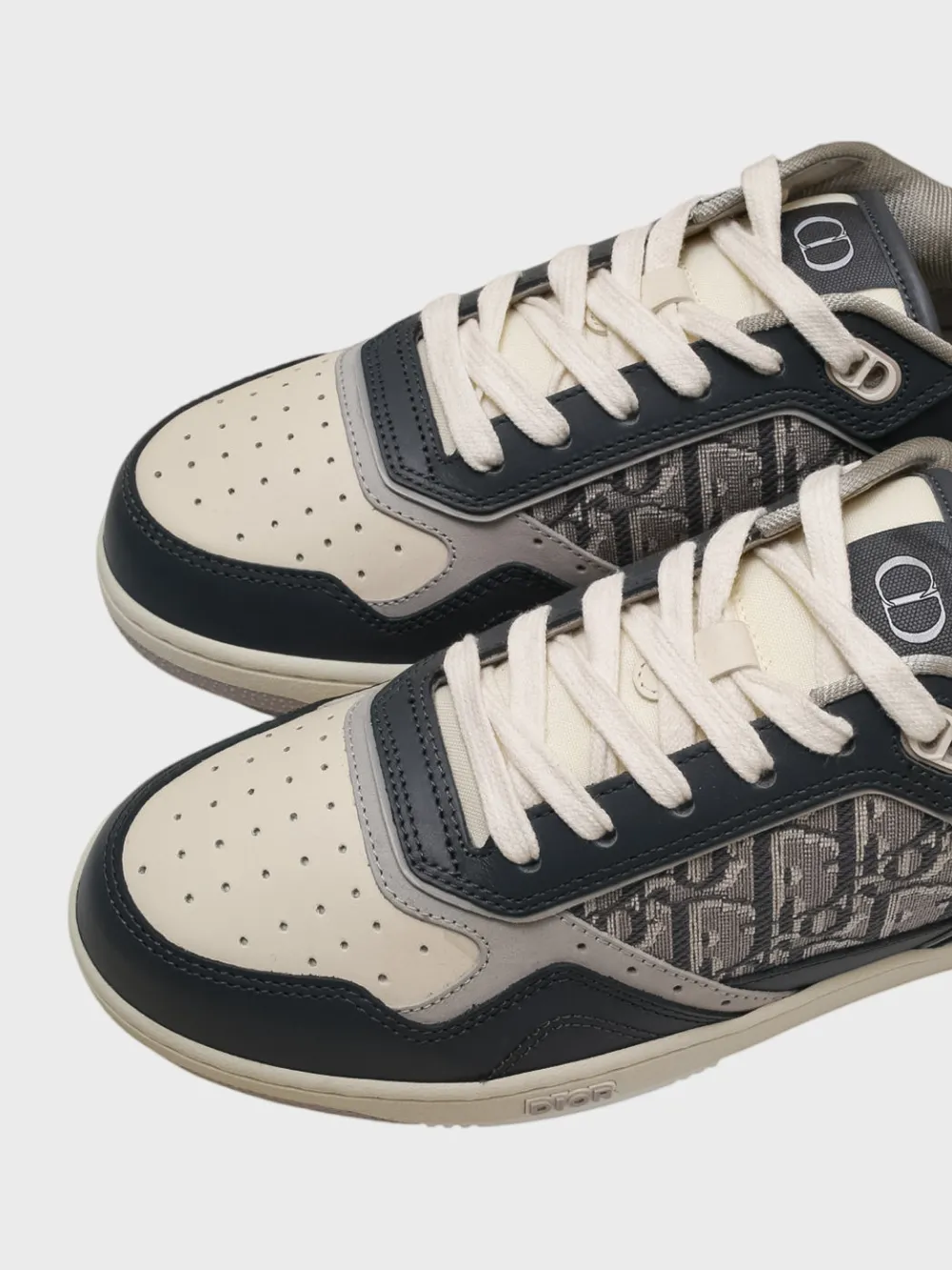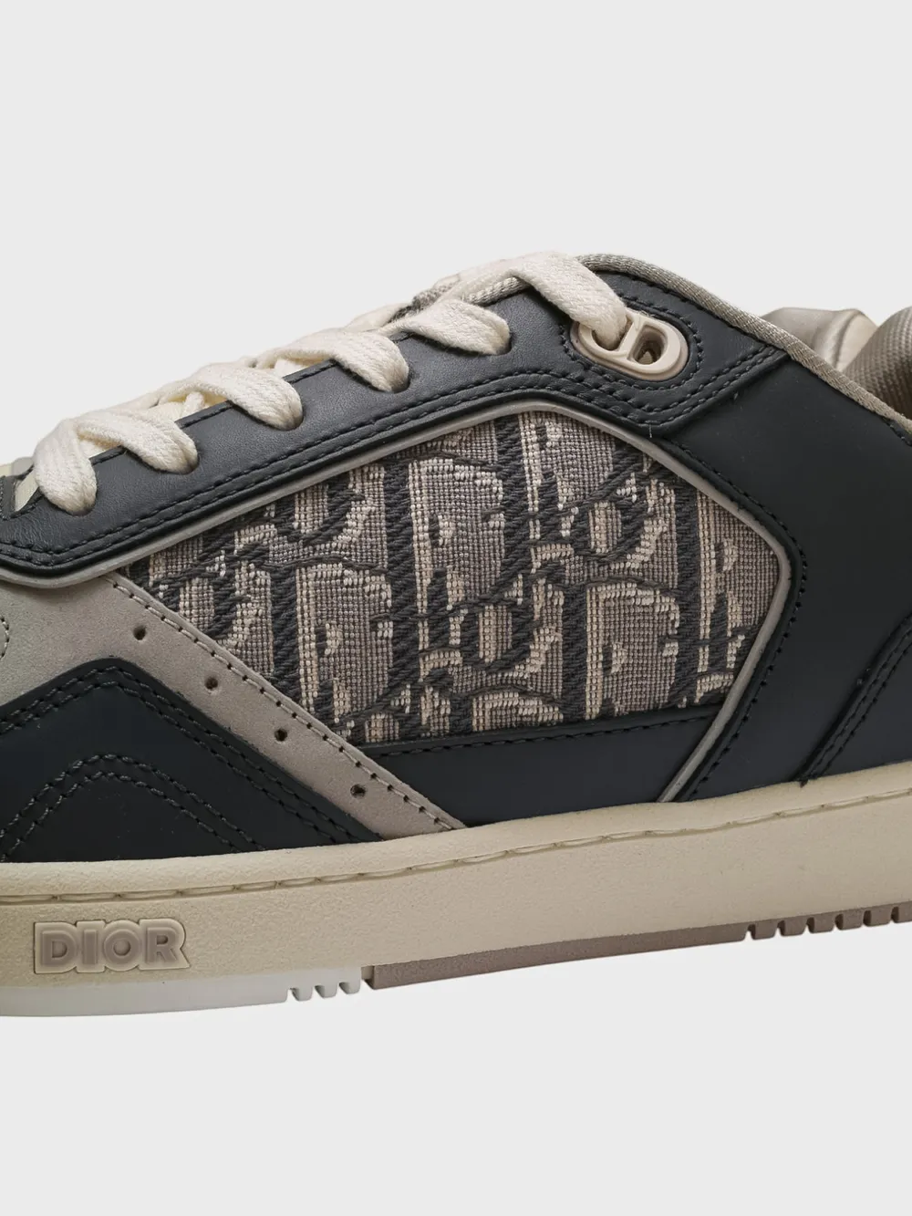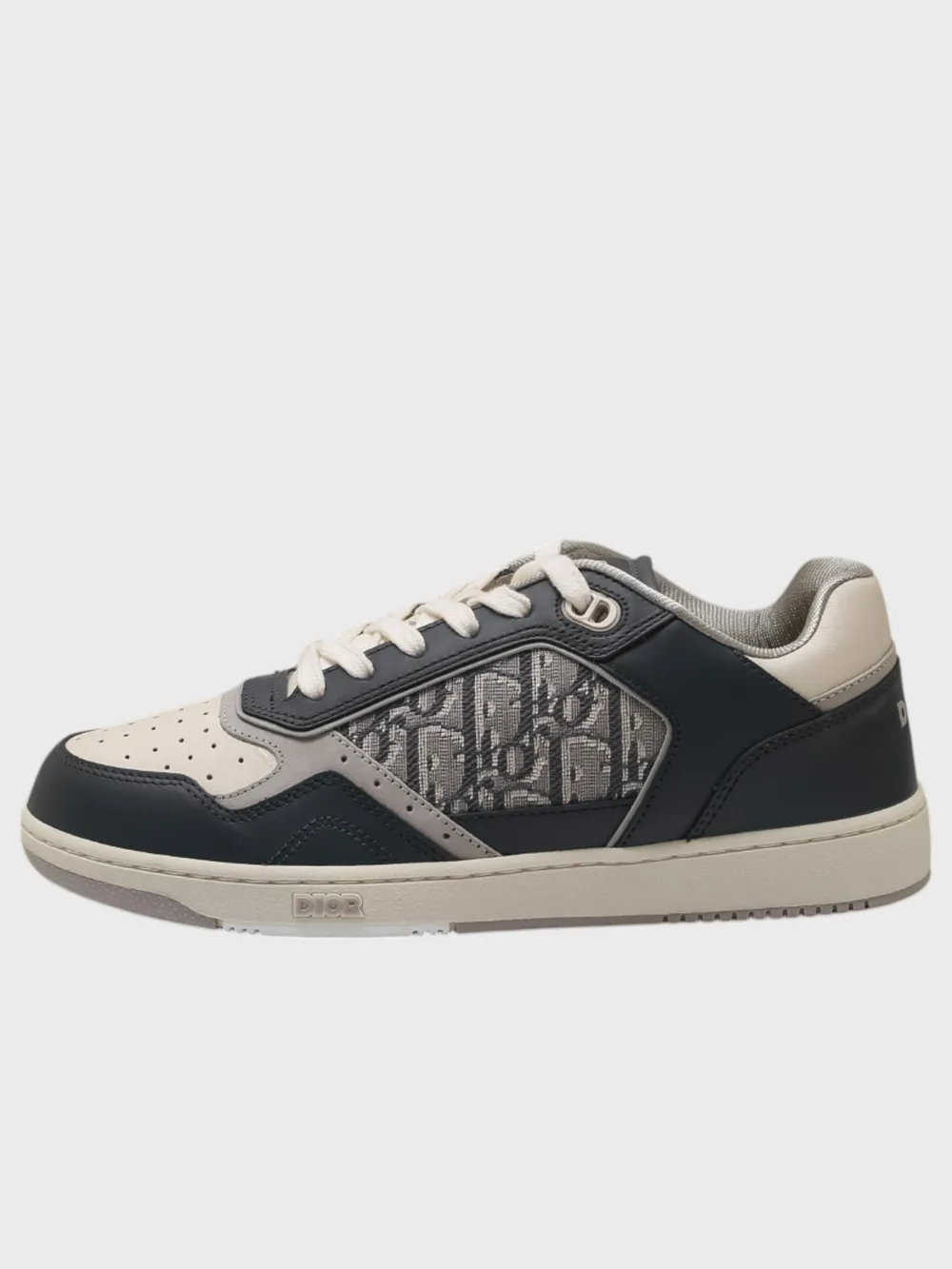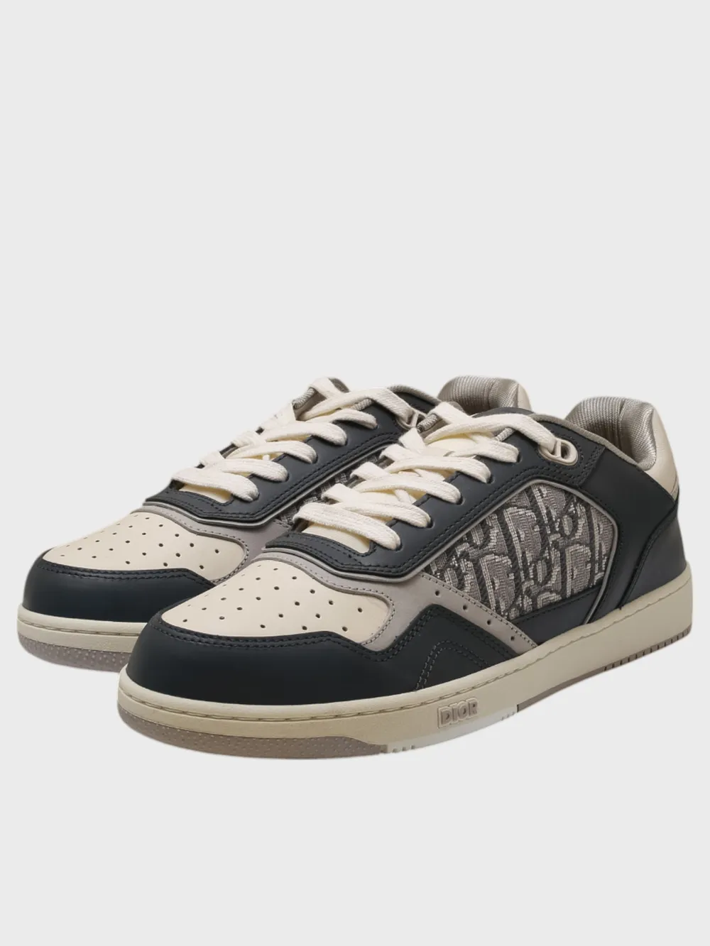 Кеды Dior выполнены из комбинации темно-синей и бежевой кожи с контрастными деталями. Модель сочетает спортивный дизайн и роскошные элементы, включая фирменный монограммный узор на боковой части и логотип бренда на язычке и подошве. Перфорация на носочной части обеспечивает комфортную посадку и воздухопроницаемость. Классическая конструкция дополнена белыми шнурками и светлой подметкой, создавая современный и элегантный образ. Идеально подходят для повседневного стиля или делового образа.