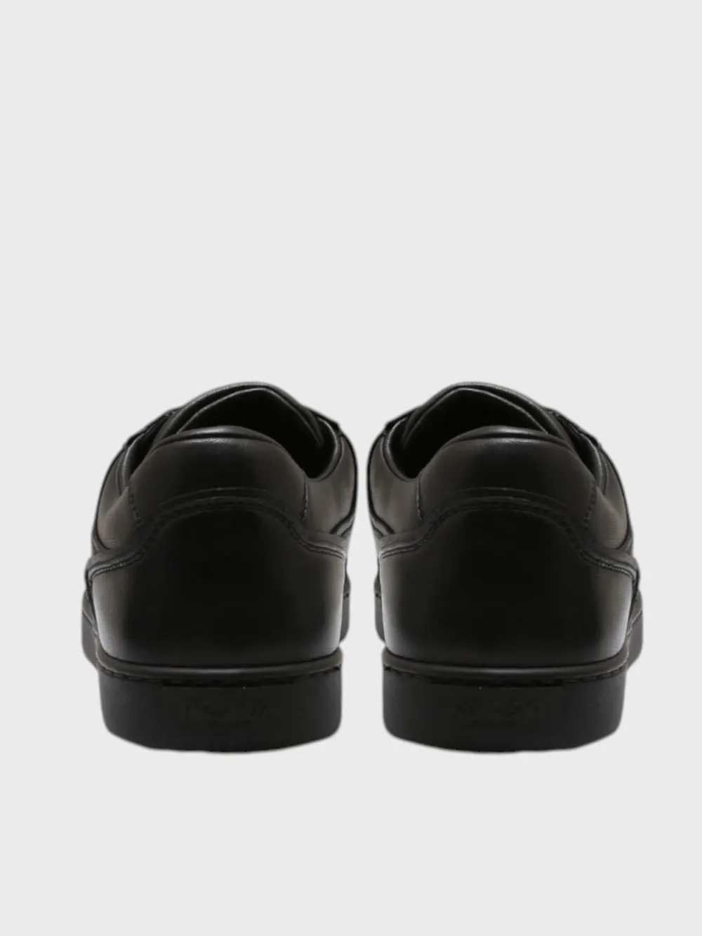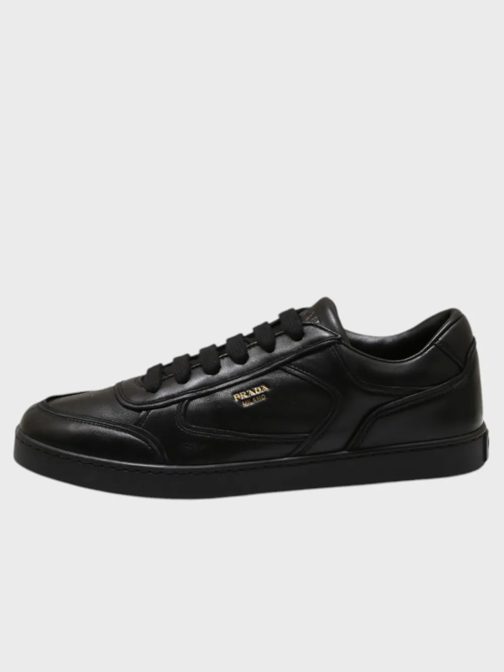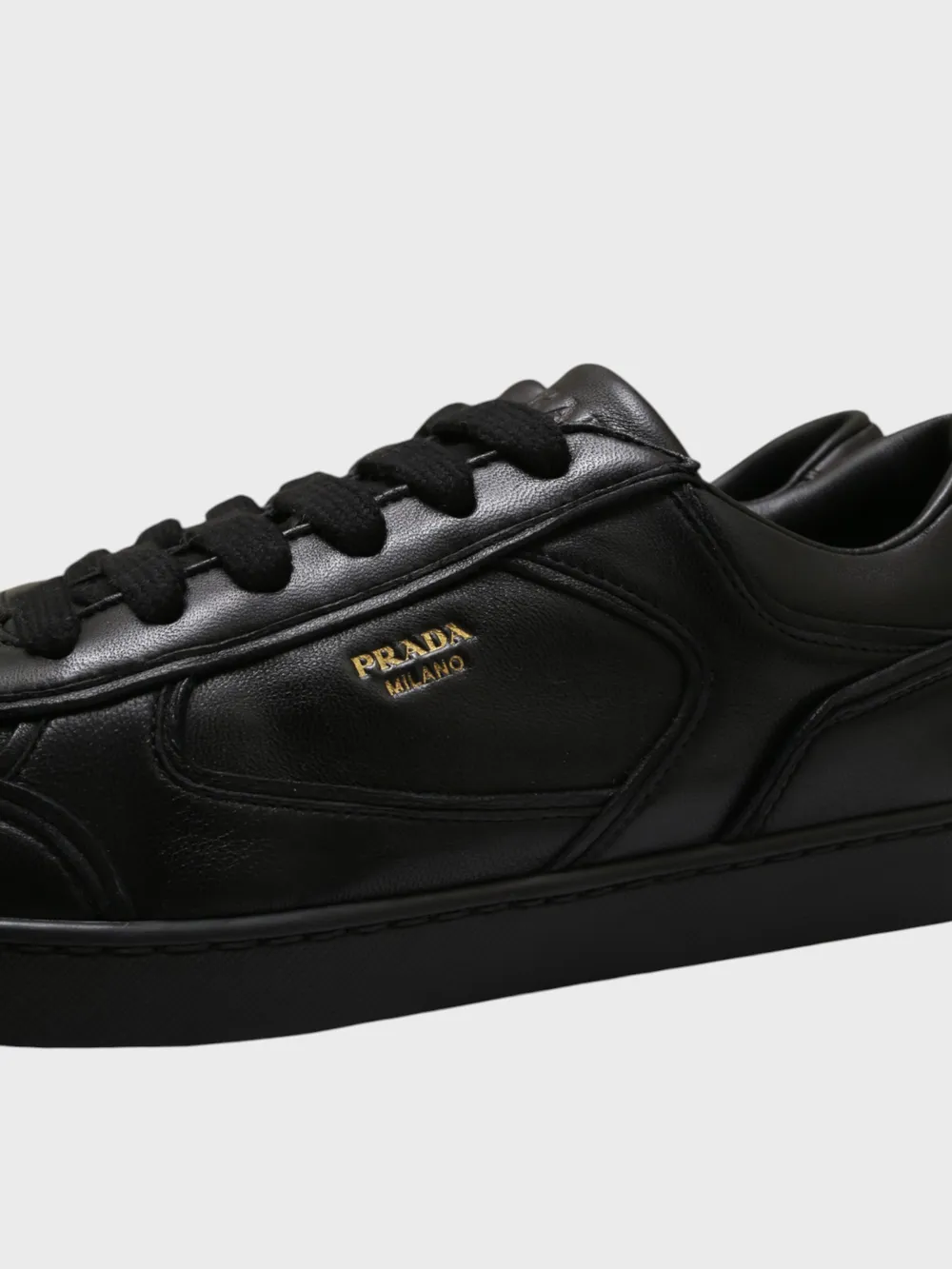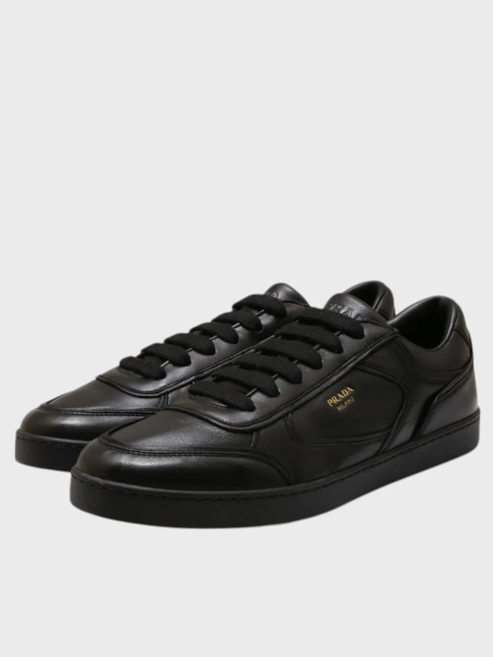 Кеды Prada выполнены из черной гладкой кожи с матовым эффектом. Модель дополнена контрастными золотыми деталями на язычке и подошве, а также фирменным логотипом "Prada Milano". Удобная застежка на шнурках обеспечивает комфортную посадку, а текстурированная подошва гарантирует надежное сцепление с поверхностью. Современный дизайн и высокое качество материалов делают эти кеды универсальным выбором для повседневного стиля.