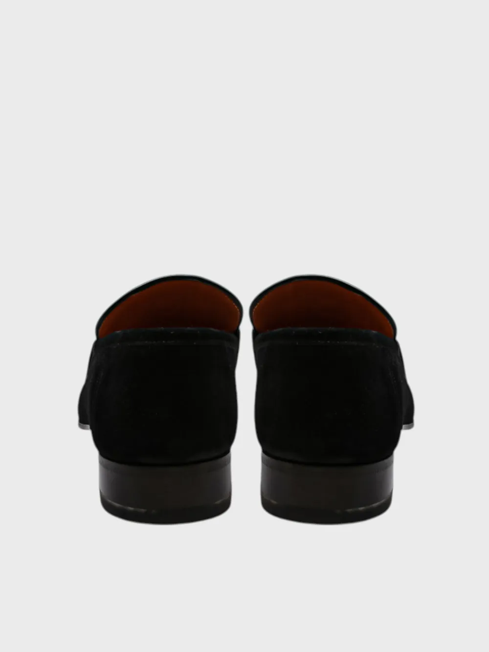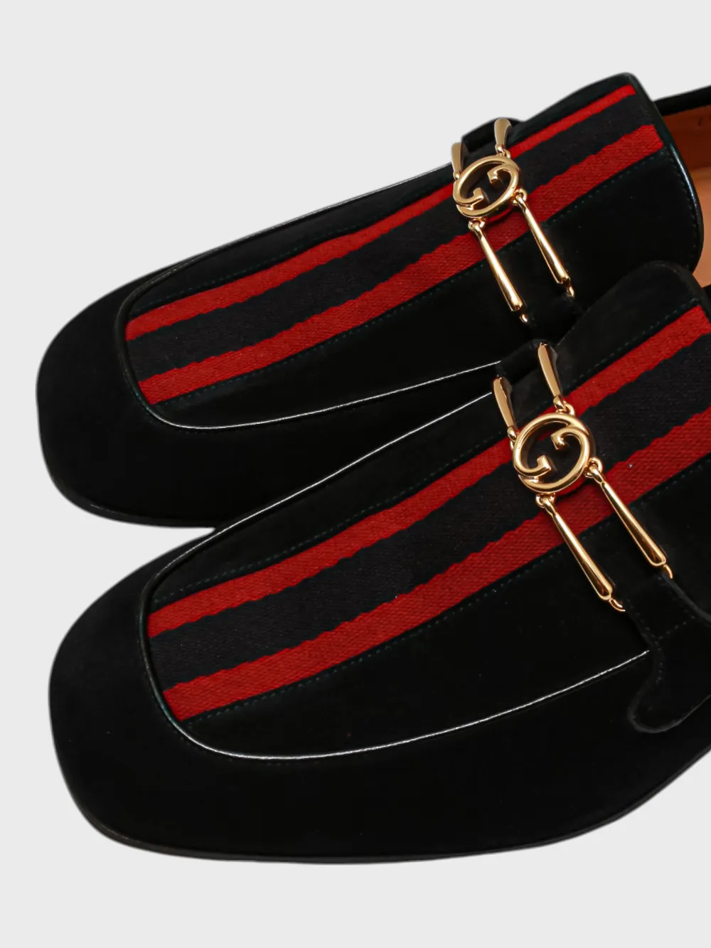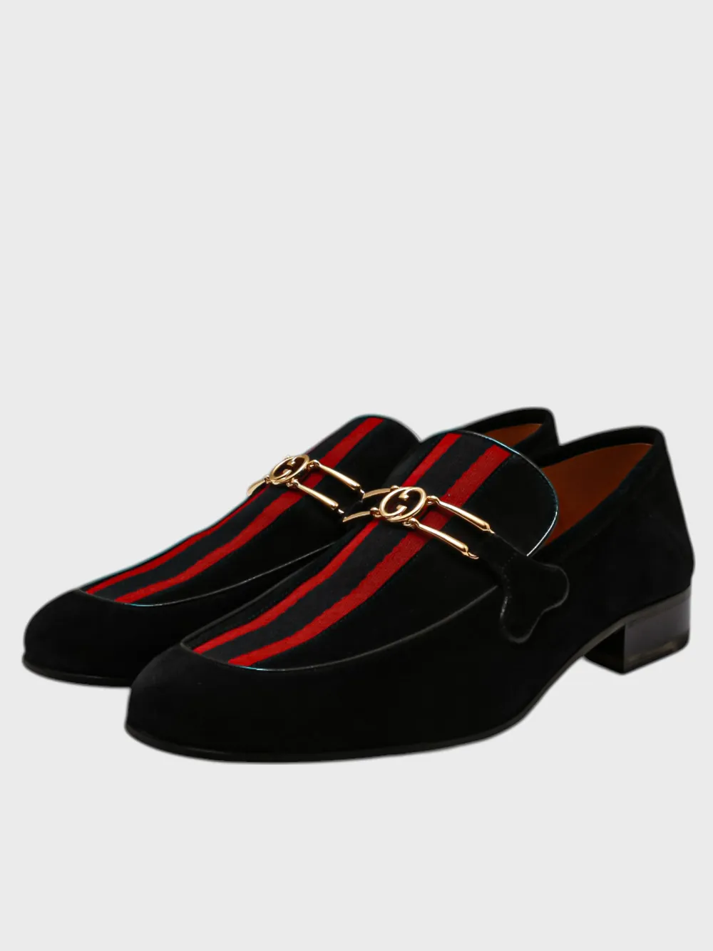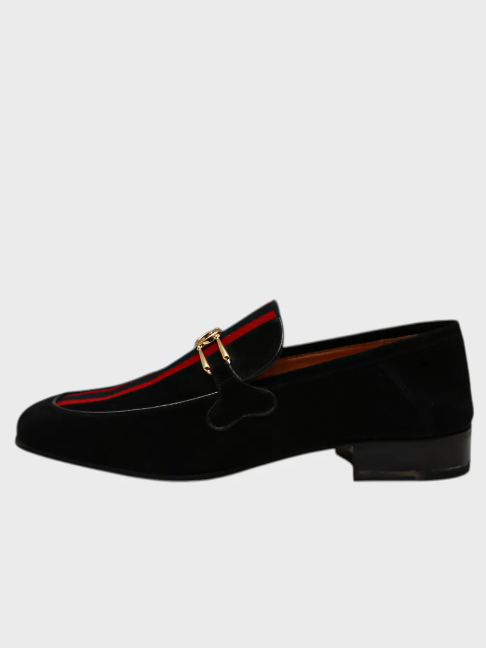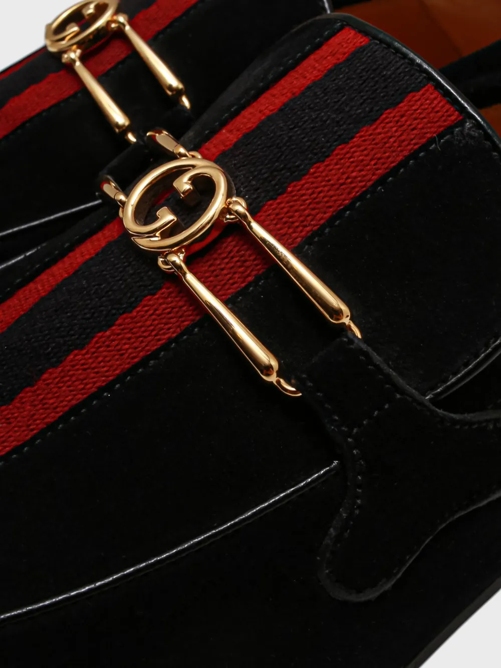Лоферы выполнены из черной замши с фактурным дизайном, дополненной красными полосами и золотыми металлическими деталями в виде стремянок. Модель сочетает классический силуэт на низком каблуке с современными декоративными элементами, создавая эффектный и стильный образ. Идеальный выбор для делового стиля или повседневного использования.