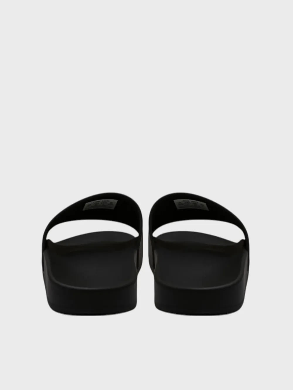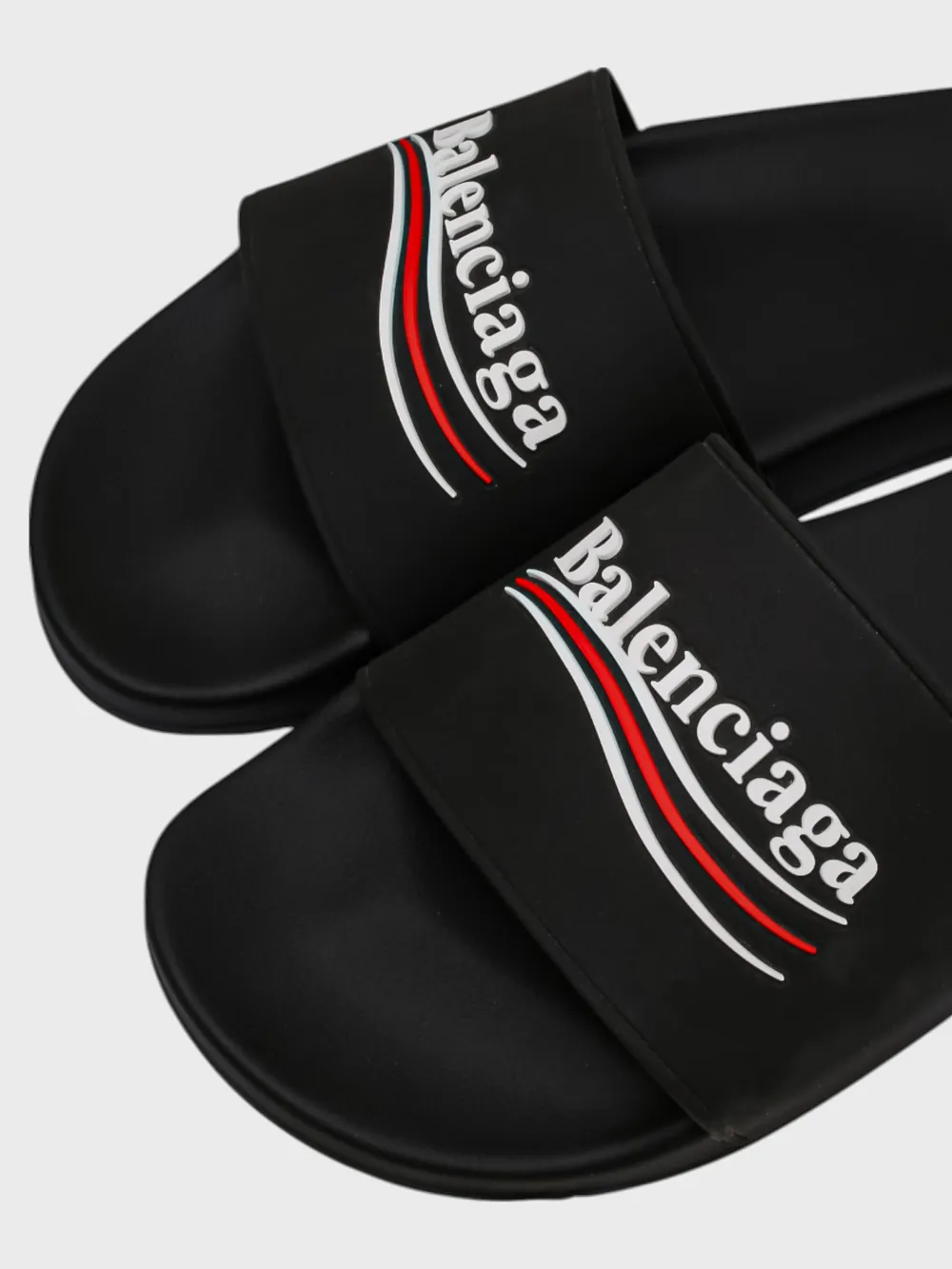 Шлепки Balenciaga выполнены из высококачественного черного резинового материала с матовой фактурой, обеспечивающей комфорт и устойчивость. Модель дополнена контрастной надписью бренда в белом цвете с красной и синей полосами, придающими современный и яркий акцент. Легкие и практичные, эти шлепки станут идеальным выбором для пляжа или отдыха.