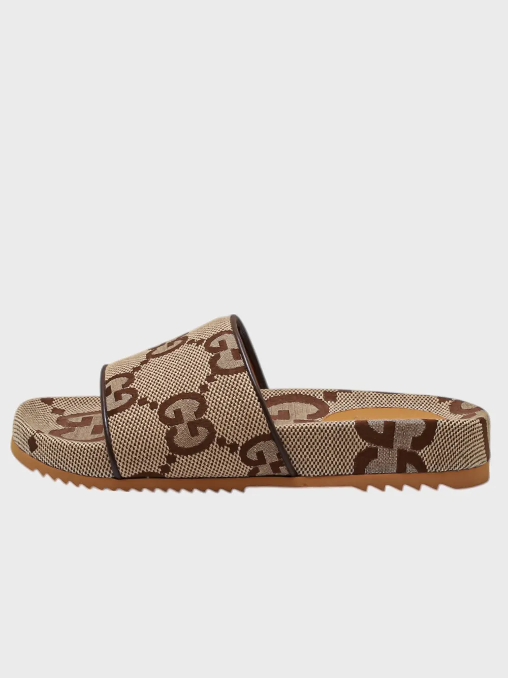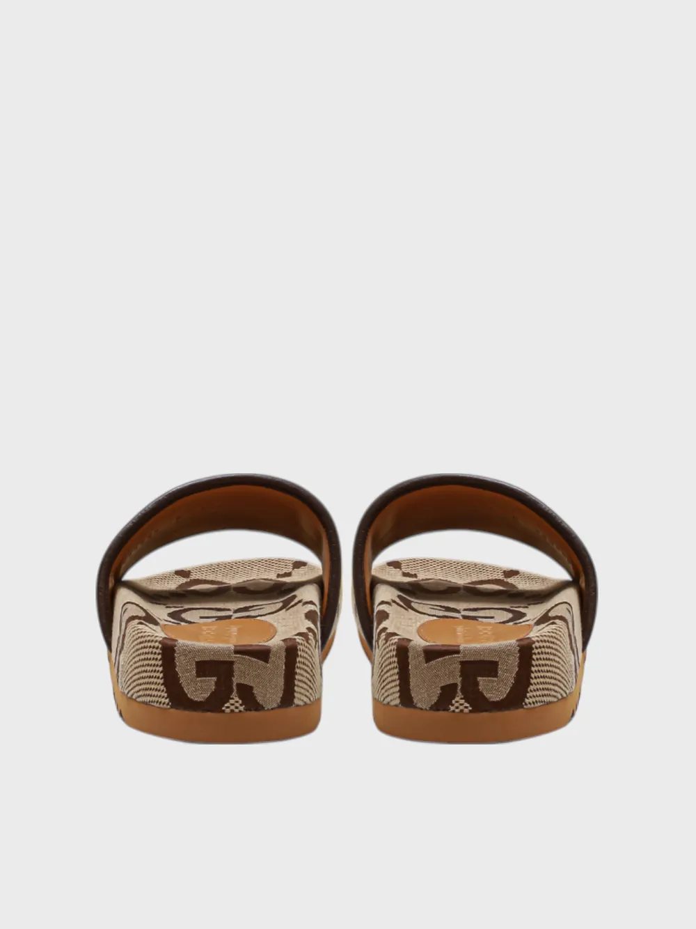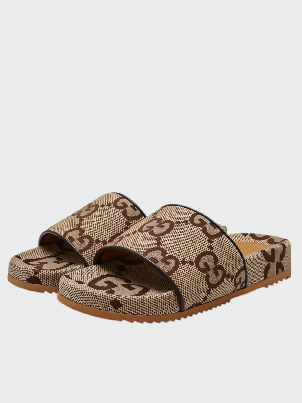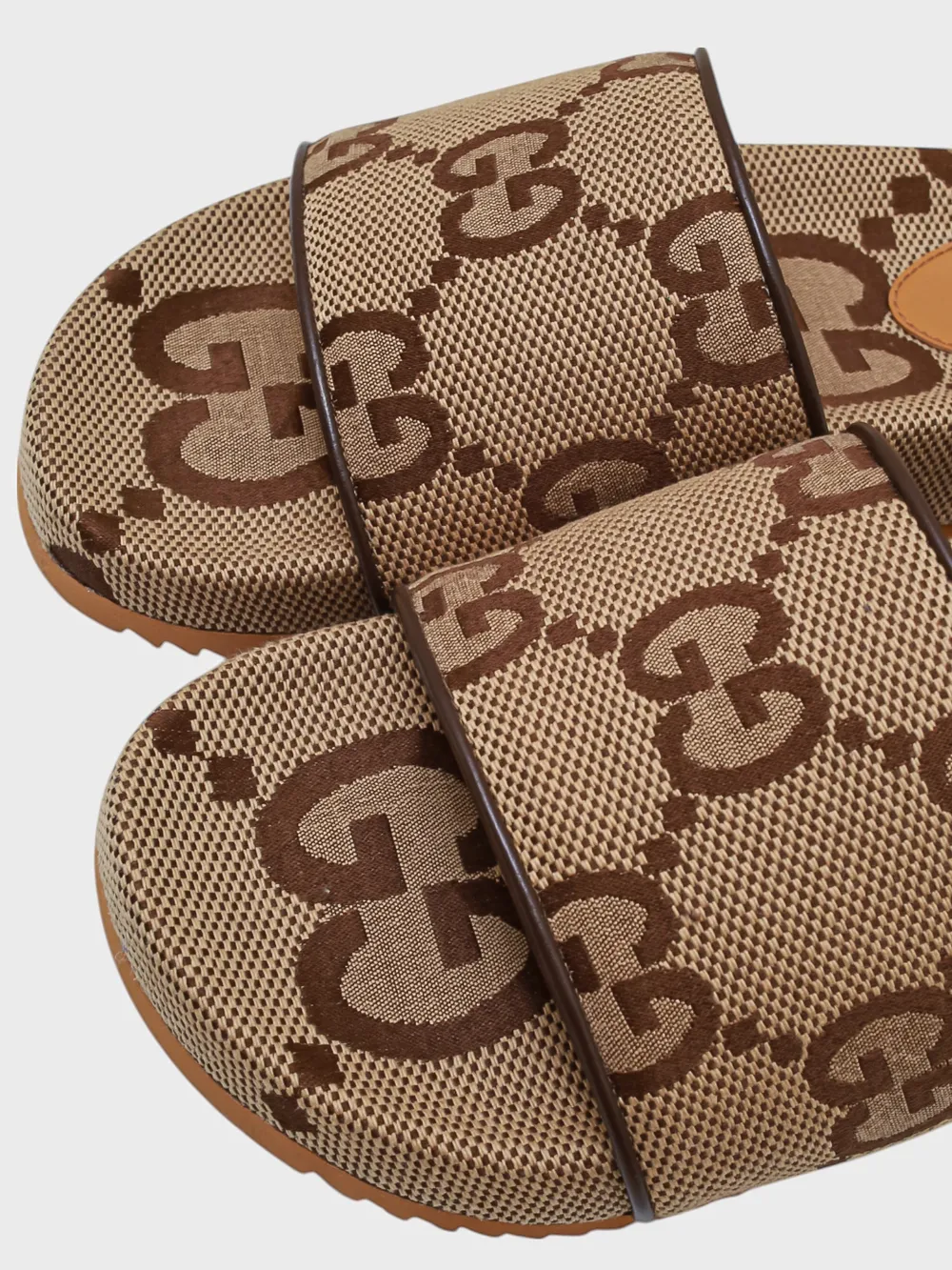 Шлепки Gucci выполнены из качественного текстиля в нейтральной палитре бежевого и коричневого цветов, украшенного фирменным принтом с повторяющимся логотипом. Модель дополнена кожаной отделкой по краям и рифленой подошвой для улучшенной устойчивости. Легкие и комфортные, эти шлепки станут идеальным выбором для летнего отдыха или повседневного использования.