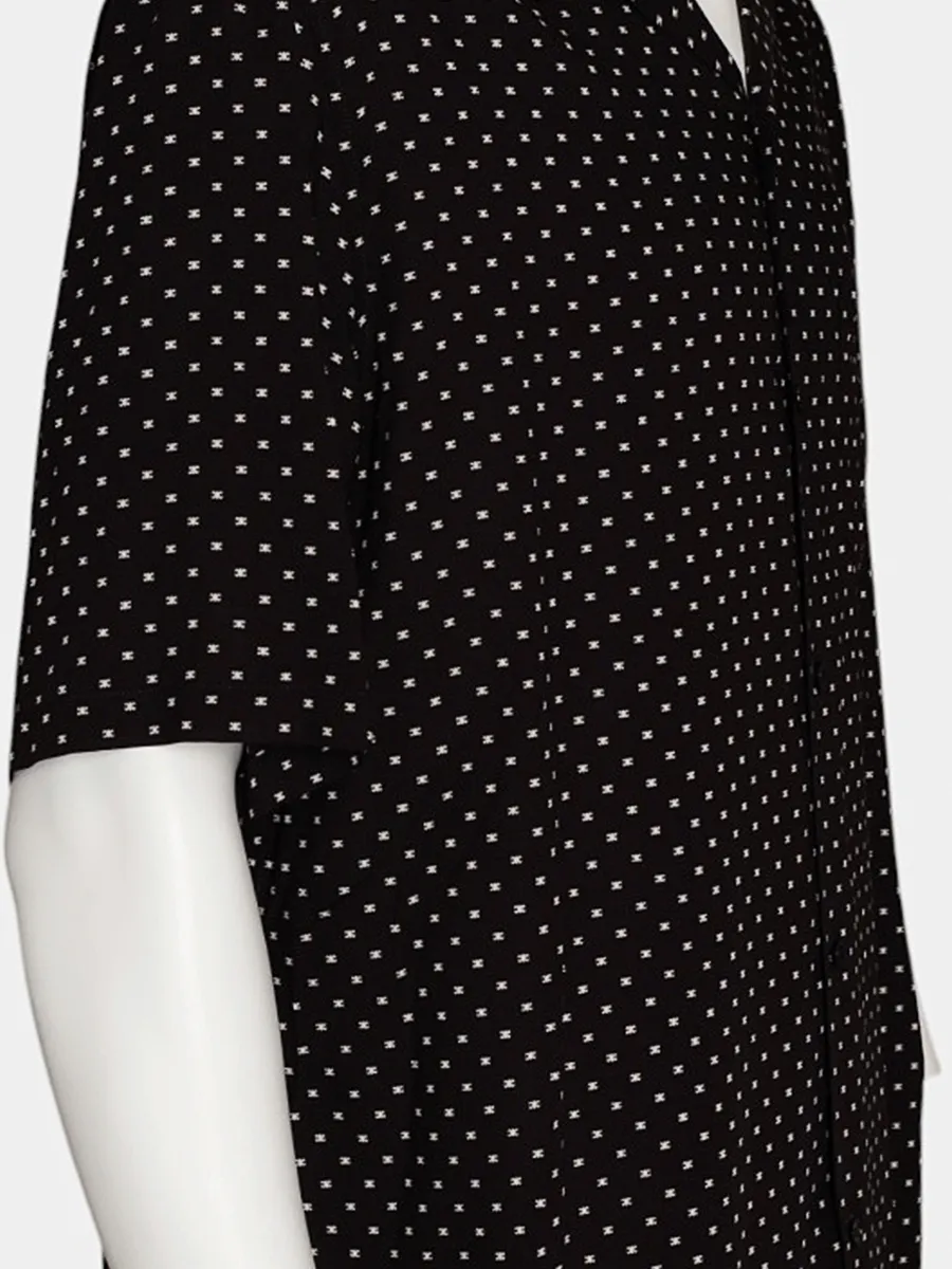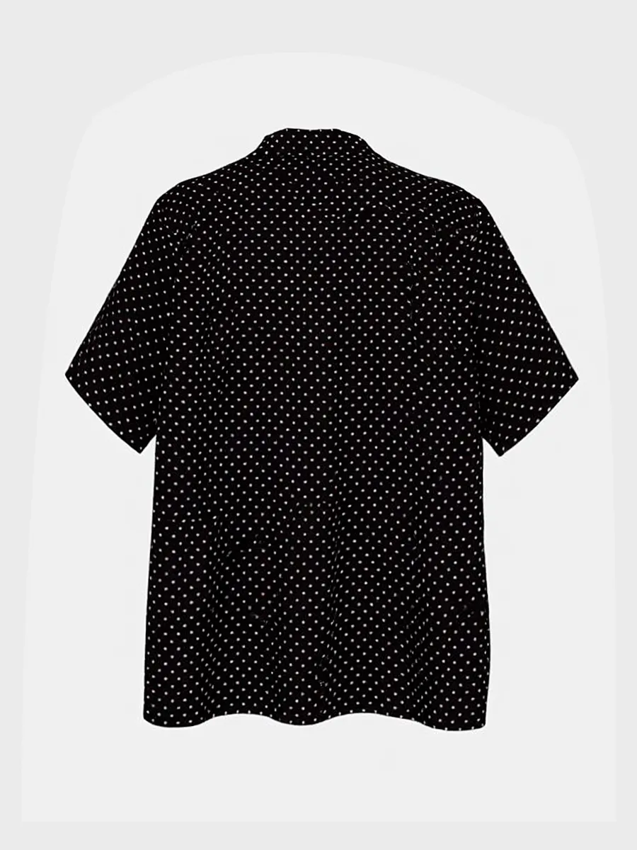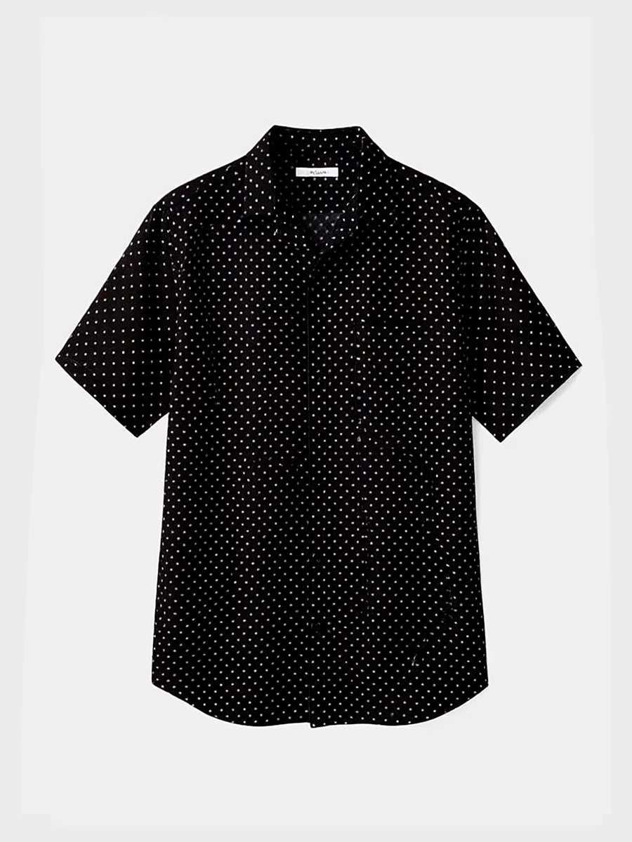 Рубашка Celine выполнена из качественного материала с элегантным черно-белым микропринтом в точку. Модель оформлена короткими рукавами, приталенным силуэтом и высоким воротником, что придает ей современный и строгий вид. Прямой крой и аккуратная посадка делают рубашку универсальным элементом гардероба для повседневного или делового стиля.
