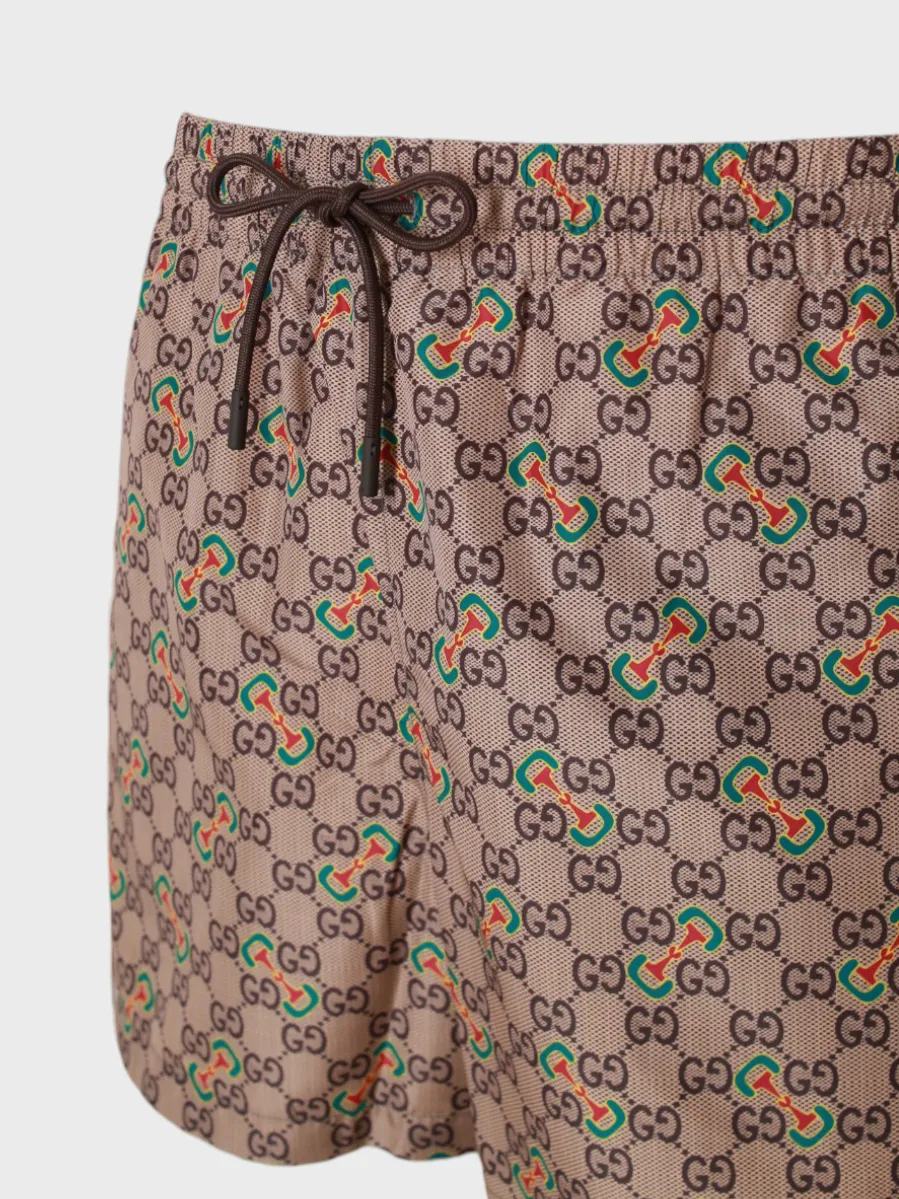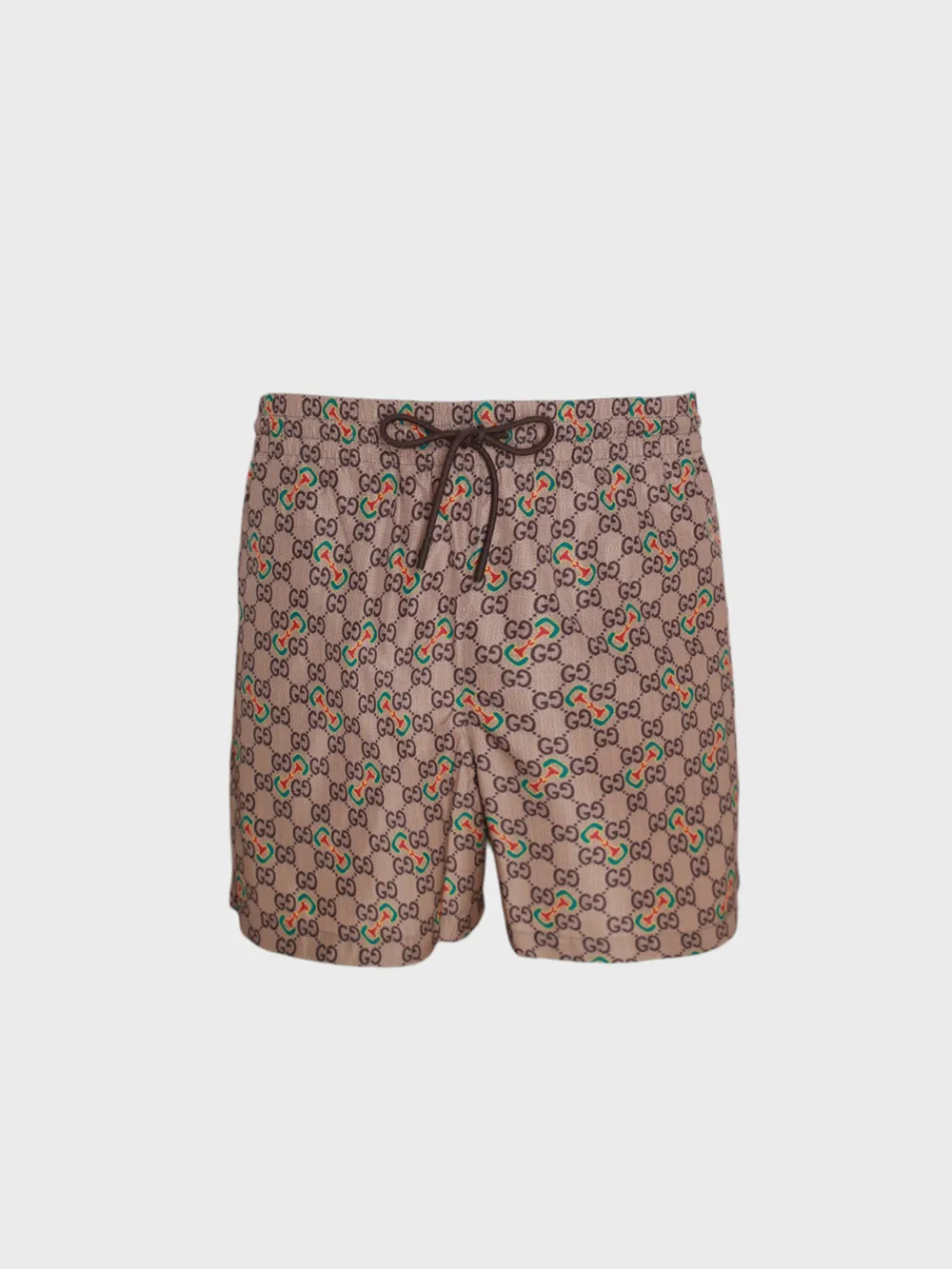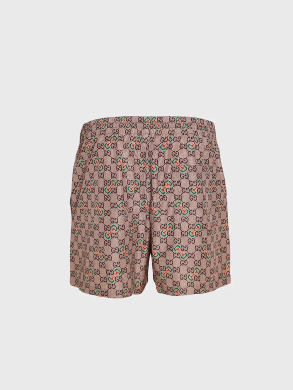 Модные шорты Gucci, выполненные из мягкого и комфортного материала. Модель дополнена ярким принтом с повторяющимся логотипом бренда в виде мультяшных лиц, который создает современный и узнаваемый дизайн. Шорты оснащены эластичной резинкой на талии с регулируемым шнурком для удобной посадки. Простой силуэт идеально сочетается как с повседневными, так и с более спортивными образами, подчеркивая безупречный вкус владельца.