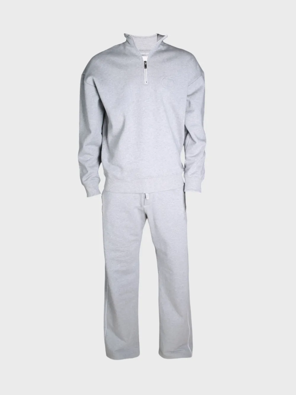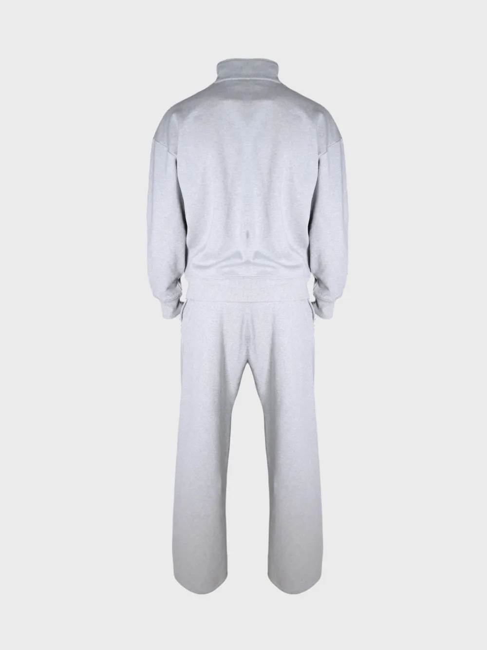 Костюм Dior выполнен из мягкого серо-бежевого трикотажа с комфортным и стильным дизайном. Модель состоит из топа и брюк, которые дополнены высоким воротником и молнией спереди. Особенностью костюма является вышитый логотип бренда на груди, добавляющий узнаваемости и элегантности. Простой силуэт и акцент на качество материалов делают этот костюм универсальным выбором для повседневного стиля или отдыха.