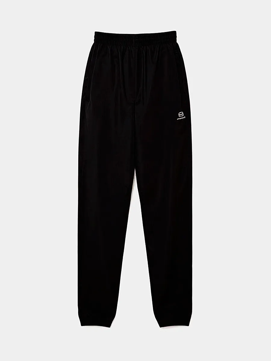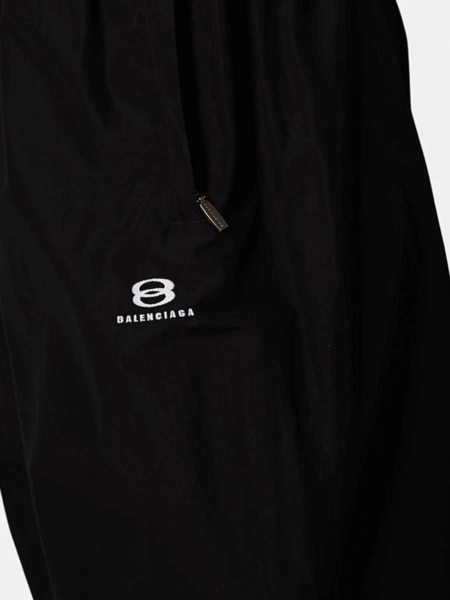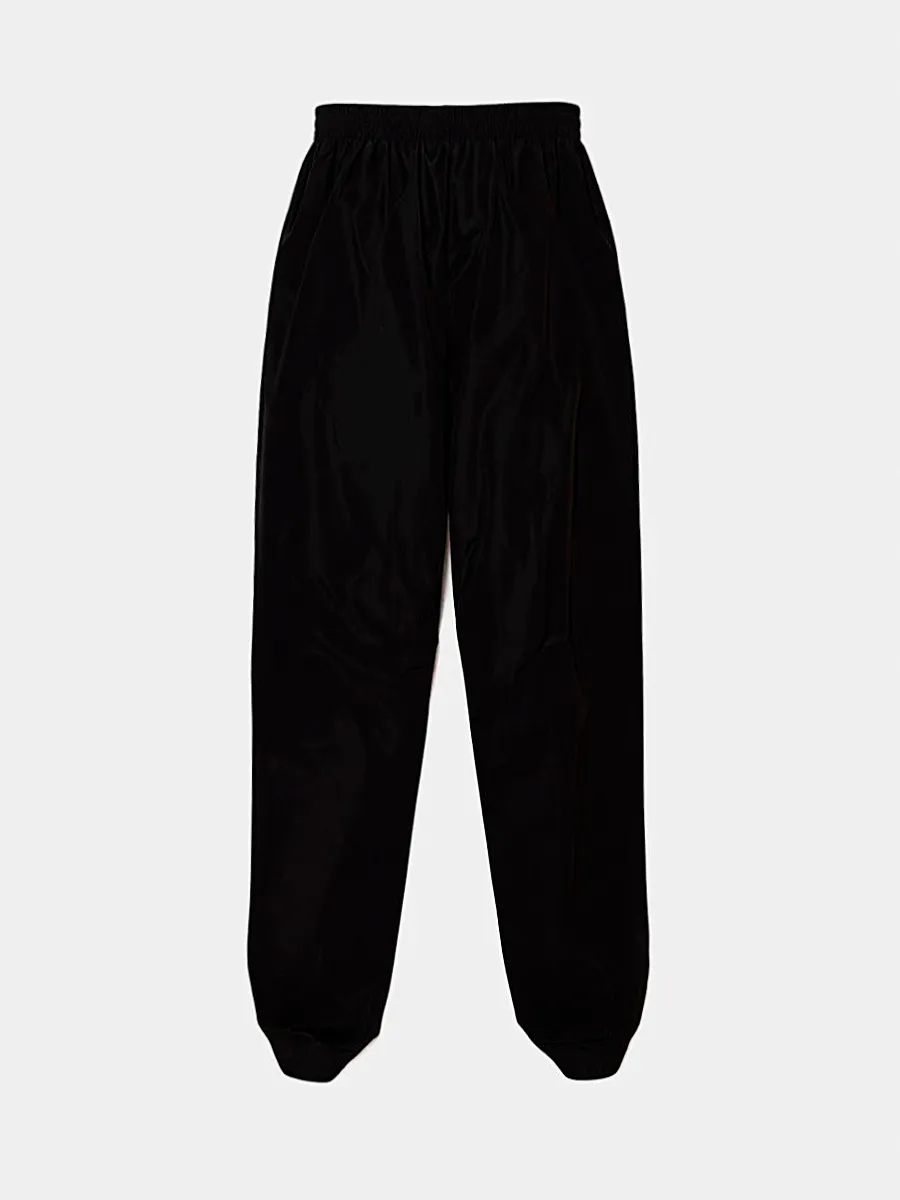 Штаны Balenciaga выполнены из качественного эластичного материала черного цвета. Модель прямого кроя с эластичной талией и манжетами на низе обеспечивает комфортную посадку. Дизайн дополнен контрастными белыми логотипами бренда на боковых швах и небольшой нашивкой с символикой на кармане. Универсальный силуэт и функциональность делают эти штаны идеальным выбором для повседневного стиля или спортивных образов.