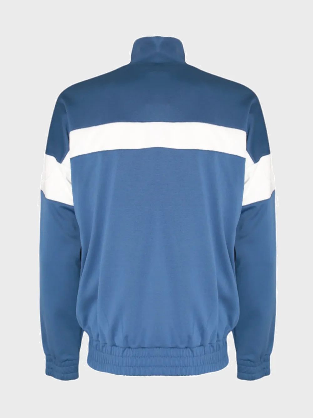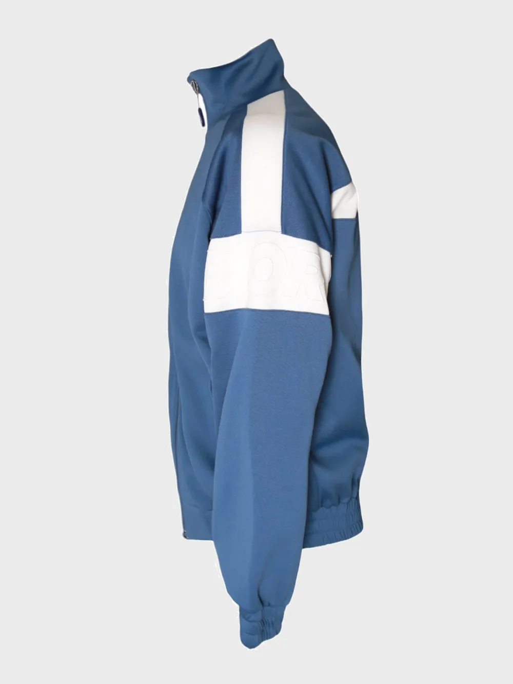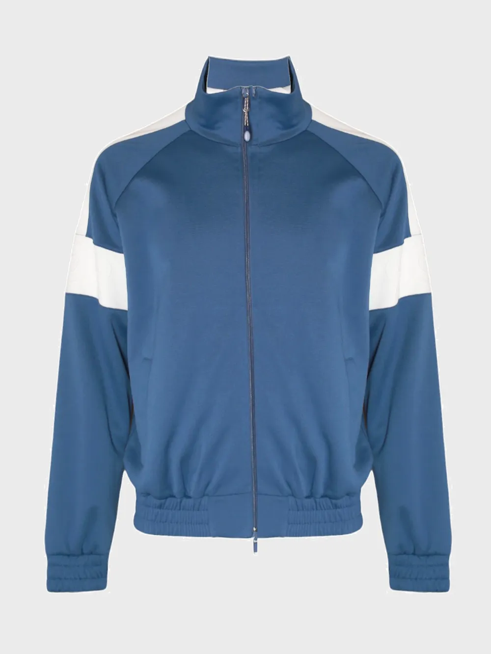 Спортивный жакет от Dior выполнен из качественного эластичного материала синего цвета с контрастными белыми вставками на рукавах и по центру. Модель прямого кроя с высоким воротником и застежкой на молнию обеспечивает комфортную посадку и свободу движений. Легкая и дышащая ткань делает этот жакет идеальным выбором для спортивной активности или повседневной носки.