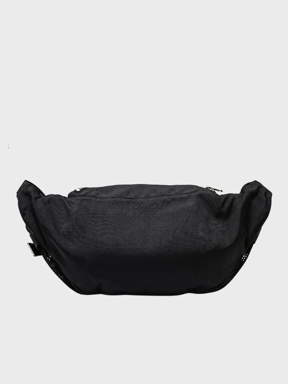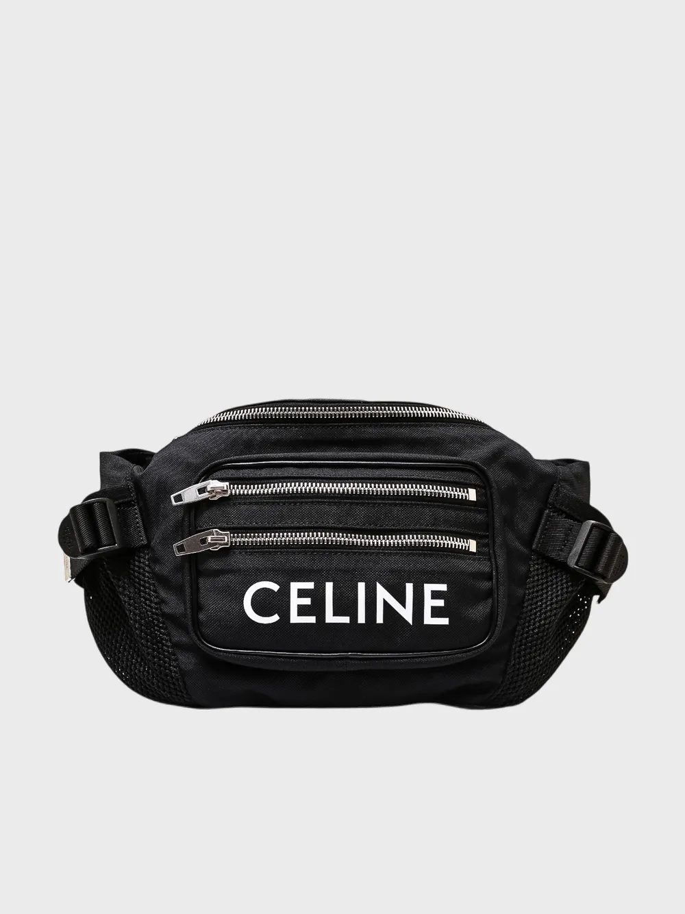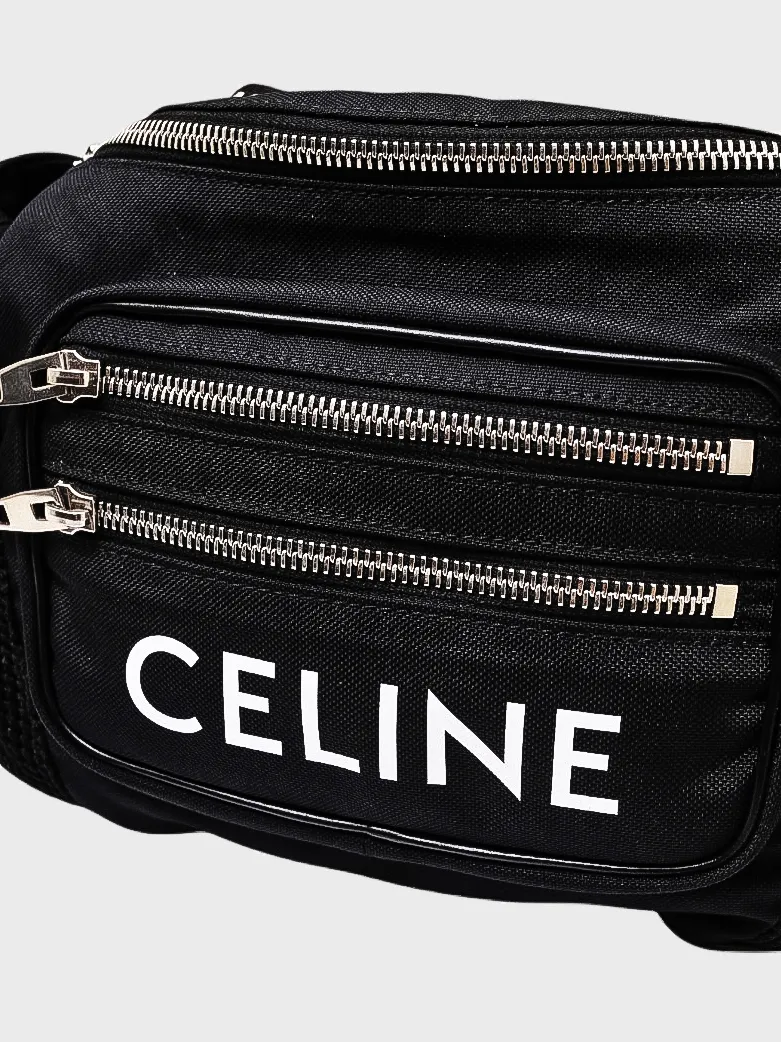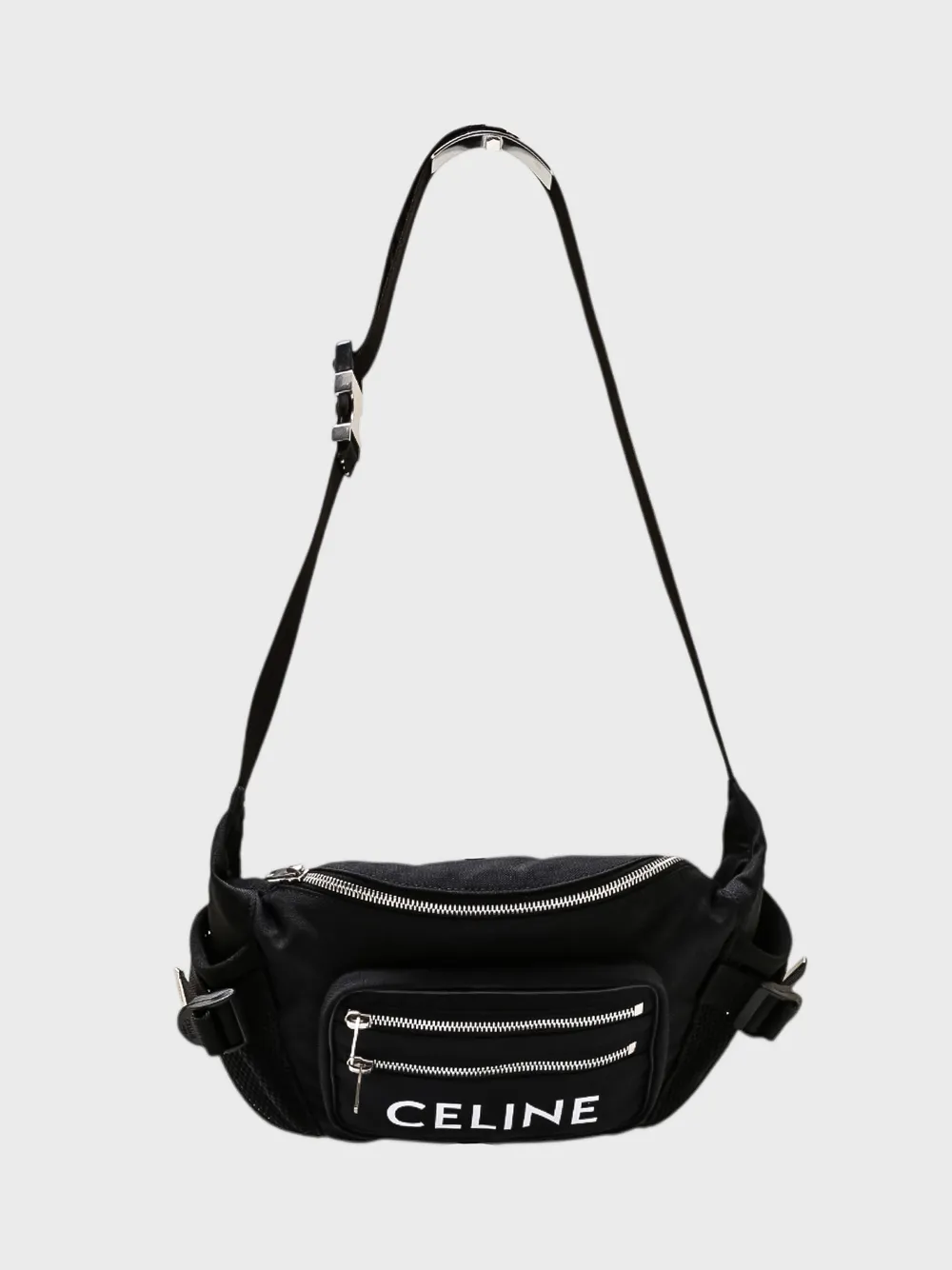 Стильная черная поясная сумка из прочного текстиля с современным дизайном. Модель дополнена несколькими отделениями на молниях, включая основное и два дополнительных кармана спереди. Детали: регулируемый ремень для пояса или ношения через плечо, крупный белый логотип "CELINE" на лицевой стороне и практичные материалы для повседневного использования. Универсальный аксессуар для активного образа жизни.