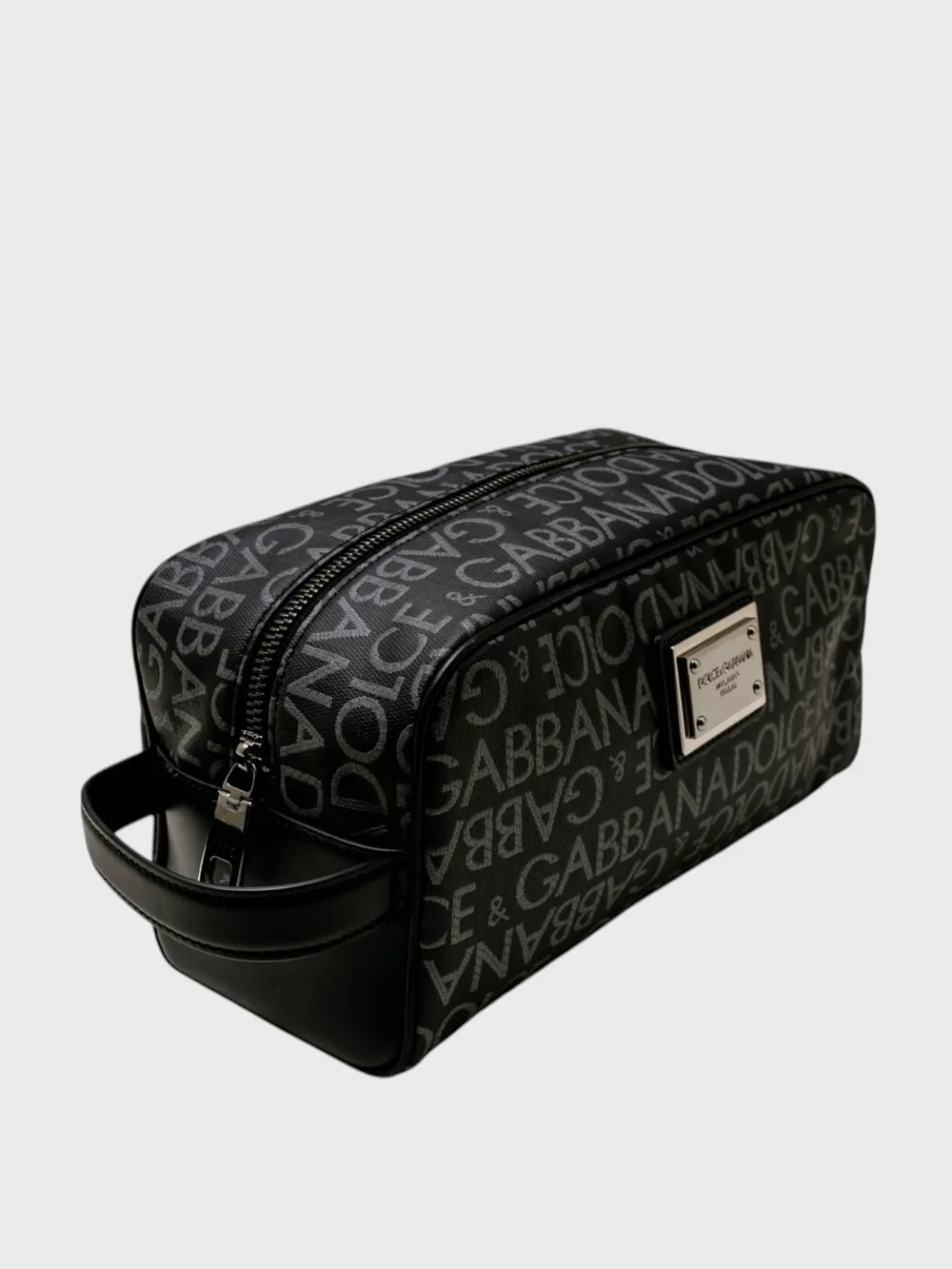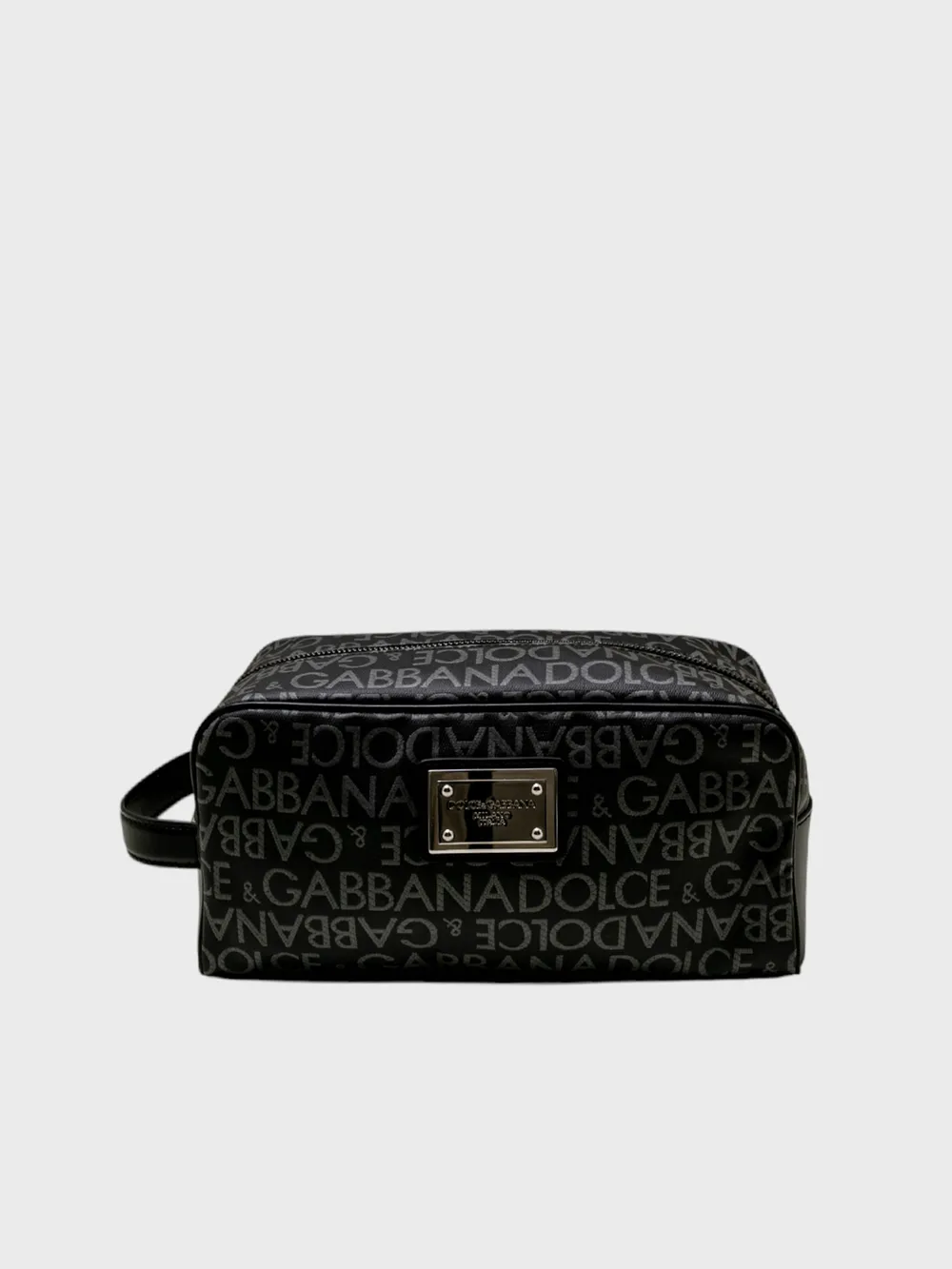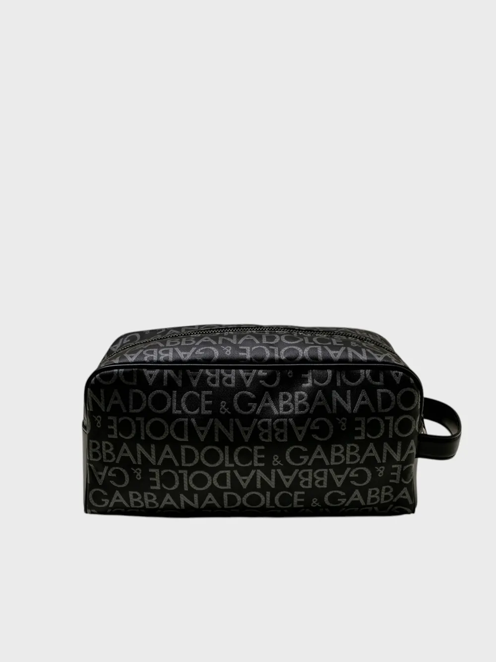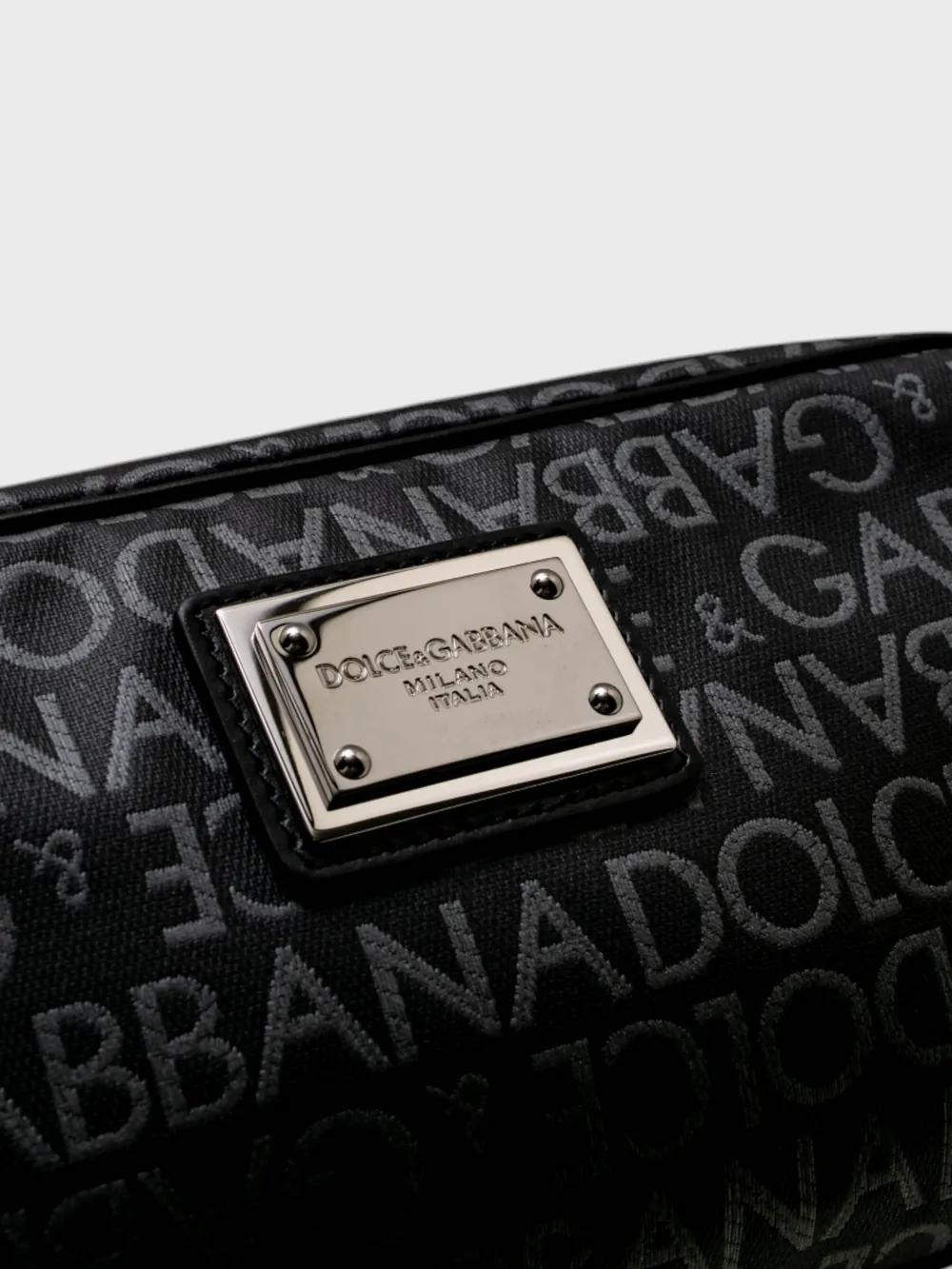 Сумка Dolce & Gabbana выполнена из черного материала с повторяющимся логотипом "Dolce & Gabbana" в серебристом цвете. Модель оснащена двойной молнией для удобного доступа к содержимому и дополнена металлической табличкой с брендовым названием на передней части. Прочный материал и аккуратная конструкция делают эту сумку стильным и практичным аксессуаром для повседневного использования.
