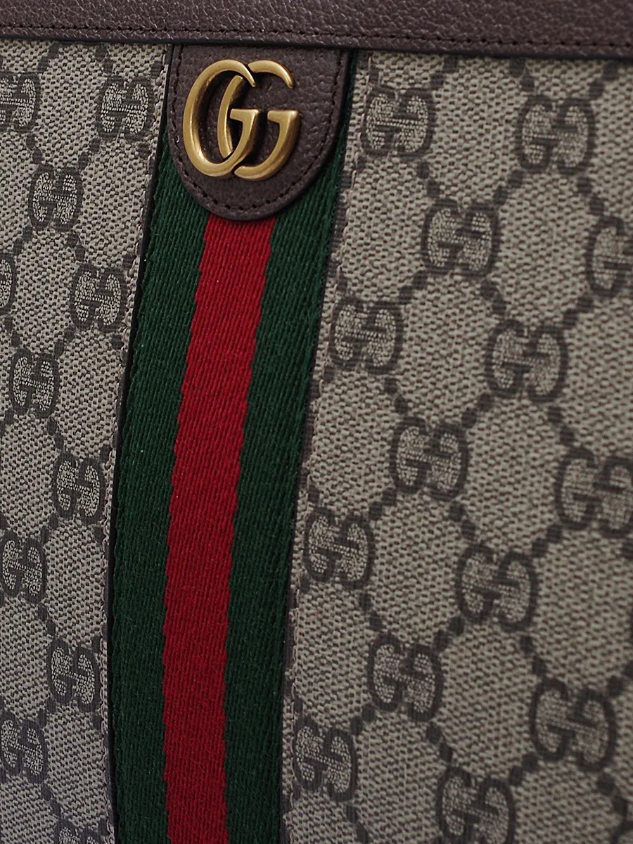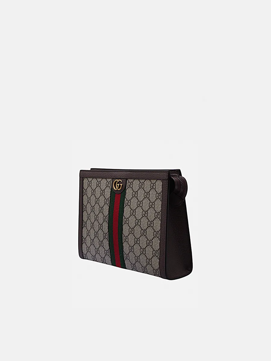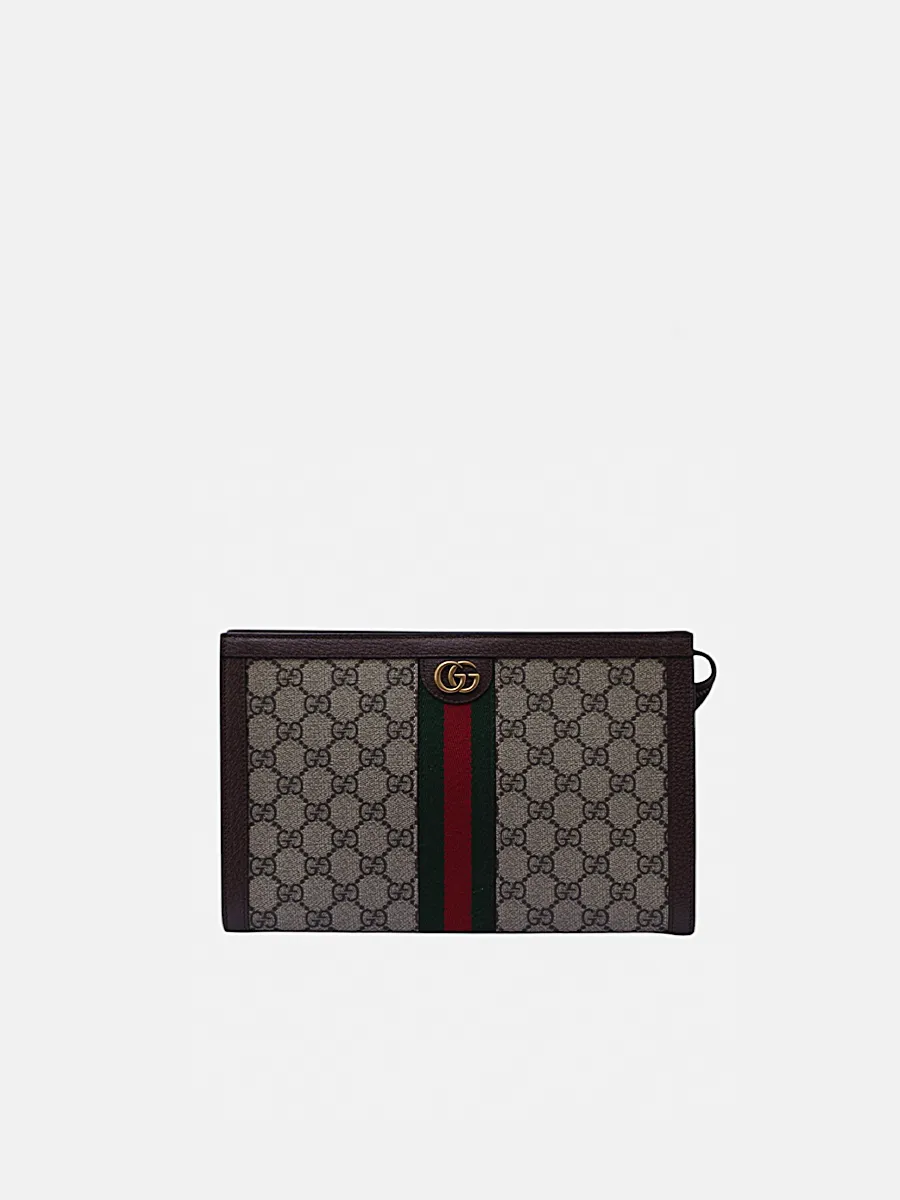 Сумка-клатч Gucci выполнена из ткани с классическим монограммным принтом GG и контрастной полосой Web, дополнена фирменной металлической застежкой и кожаными вставками. Модель сочетает элегантный дизайн, высокое качество материалов и узнаваемый стиль бренда — идеальный аксессуар для повседневного и вечернего образа.