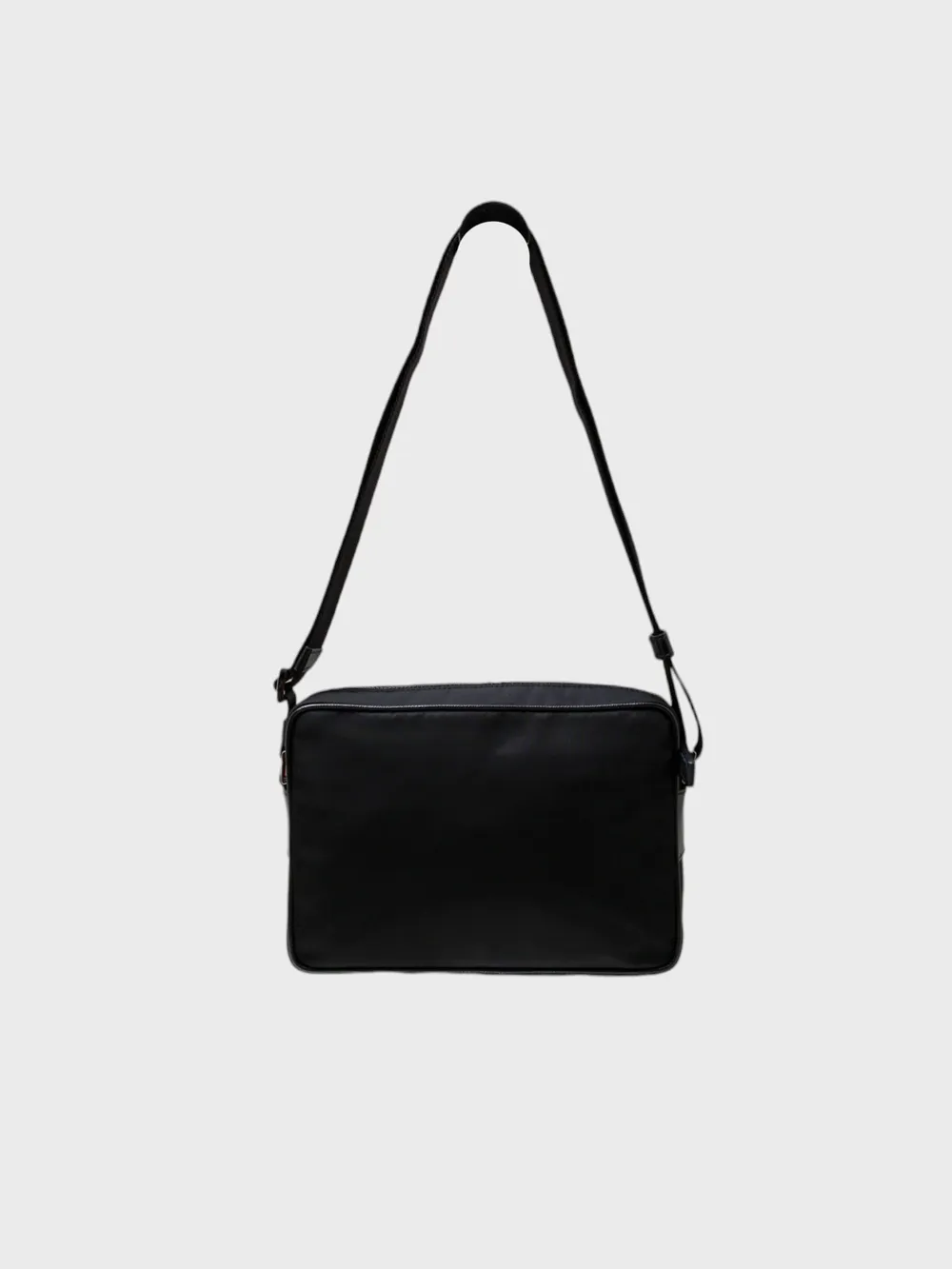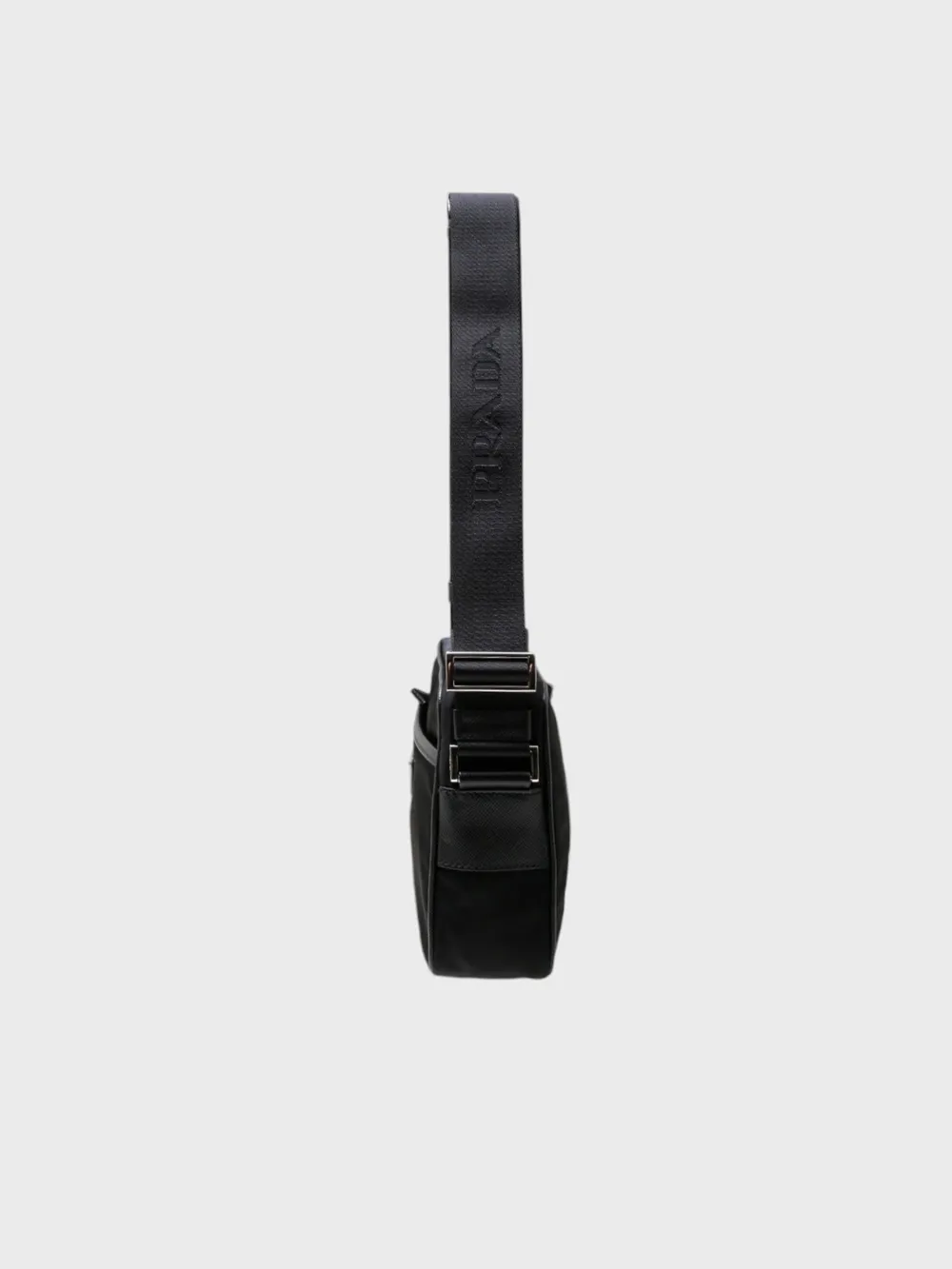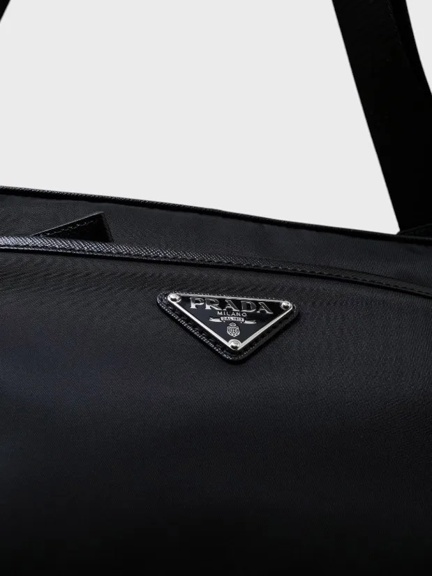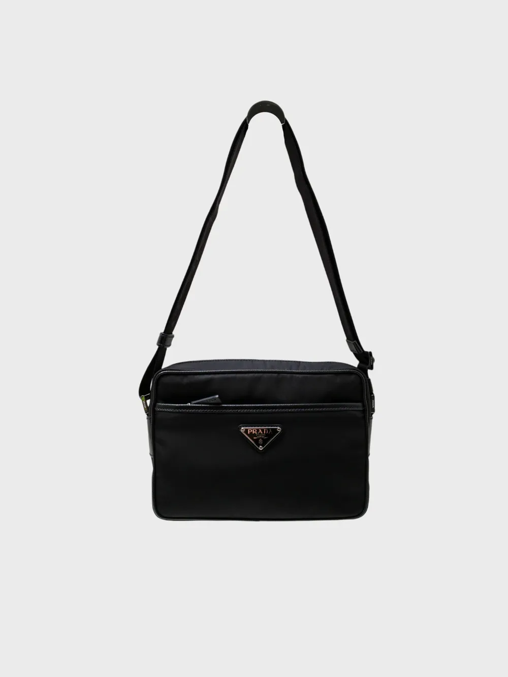 Сумка Prada выполнена из черного водоотталкивающего нейлона с фактурной отделкой и контрастными вставками из кожи. Модель дополнена регулируемым плечевым ремнем, двойной молнией на лицевой стороне и фирменным треугольным логотипом бренда. Удобная и практичная сумка для повседневного использования, сочетающая функциональность и стиль.