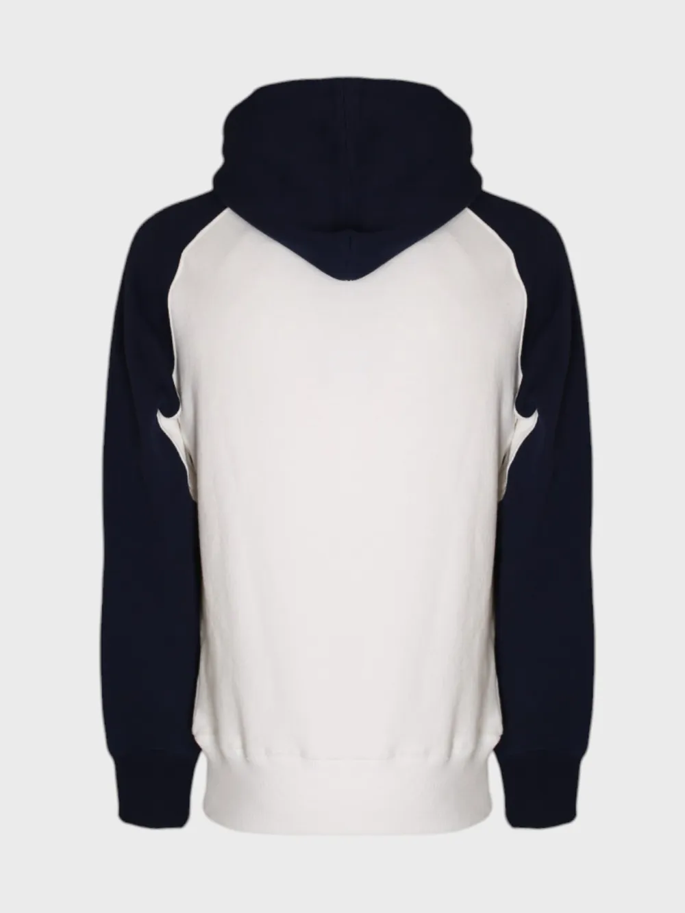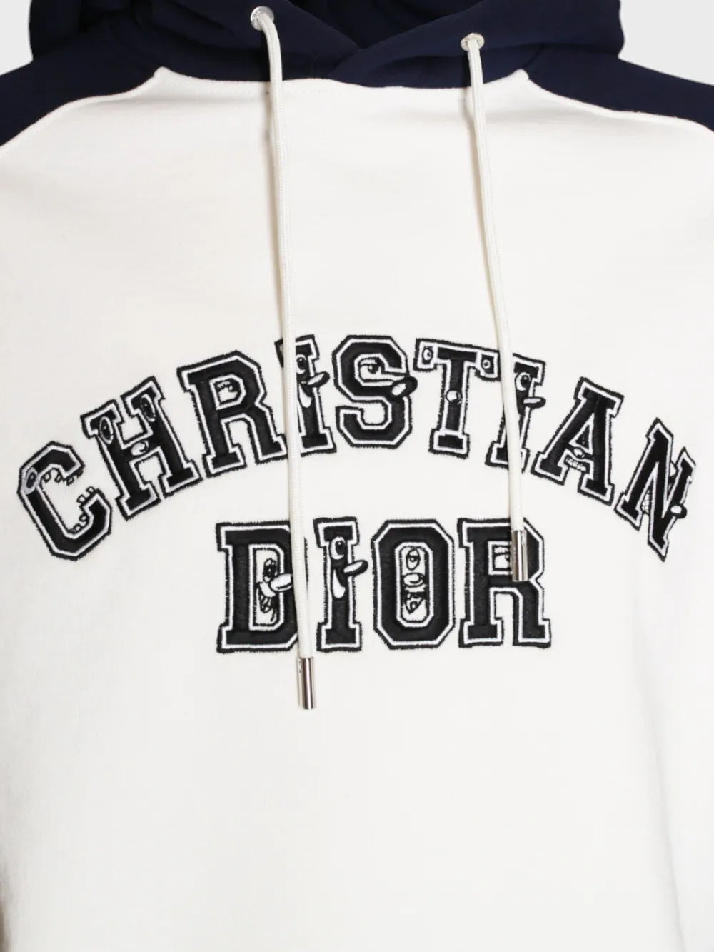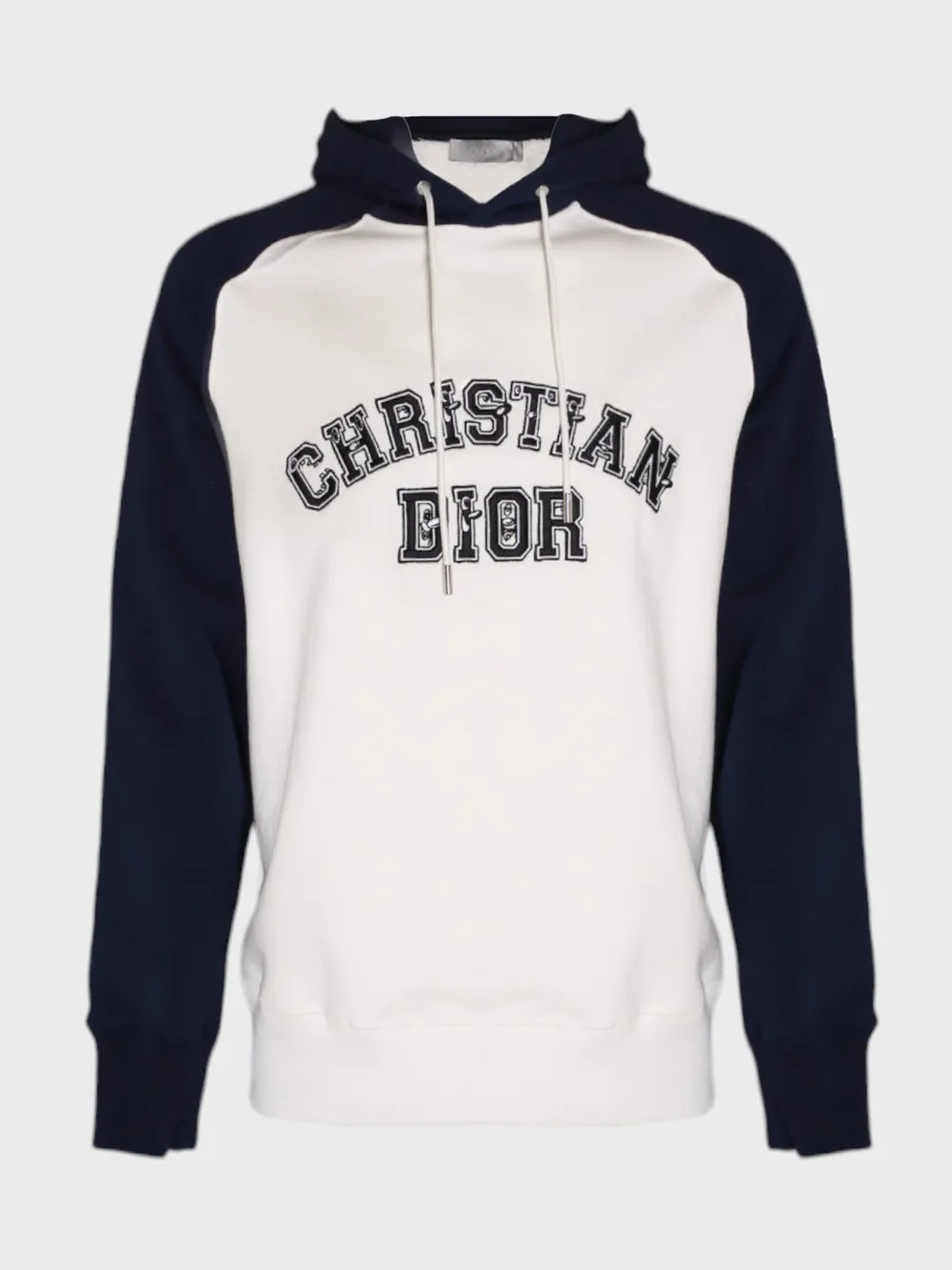 Белое худи Dior с контрастными темно-синими рукавами и капюшоном. Модель выполнена из мягкого и комфортного материала, что обеспечивает тепло и удобство в носке. На груди расположено крупное логотип "CHRISTIAN DIOR" в стиле колледжей, который добавляет современный и узнаваемый акцент. Простой силуэт идеально сочетается как с повседневными, так и с более спортивными образами, подчеркивая безупречный вкус владельца.
