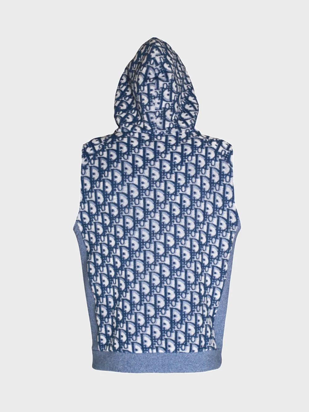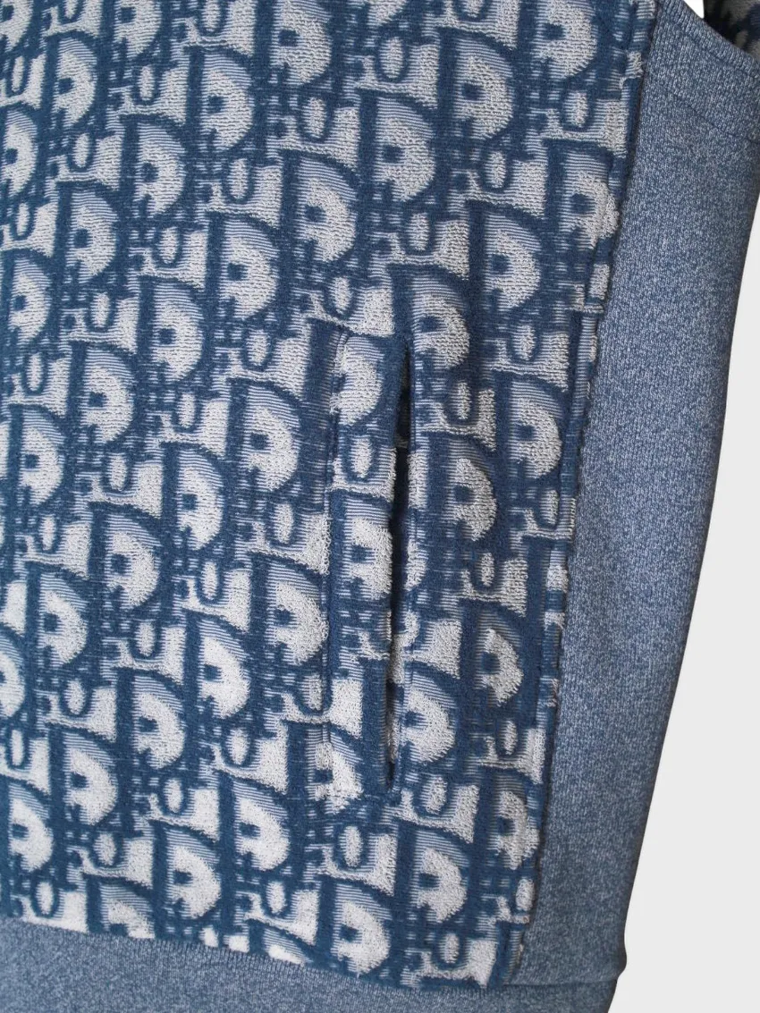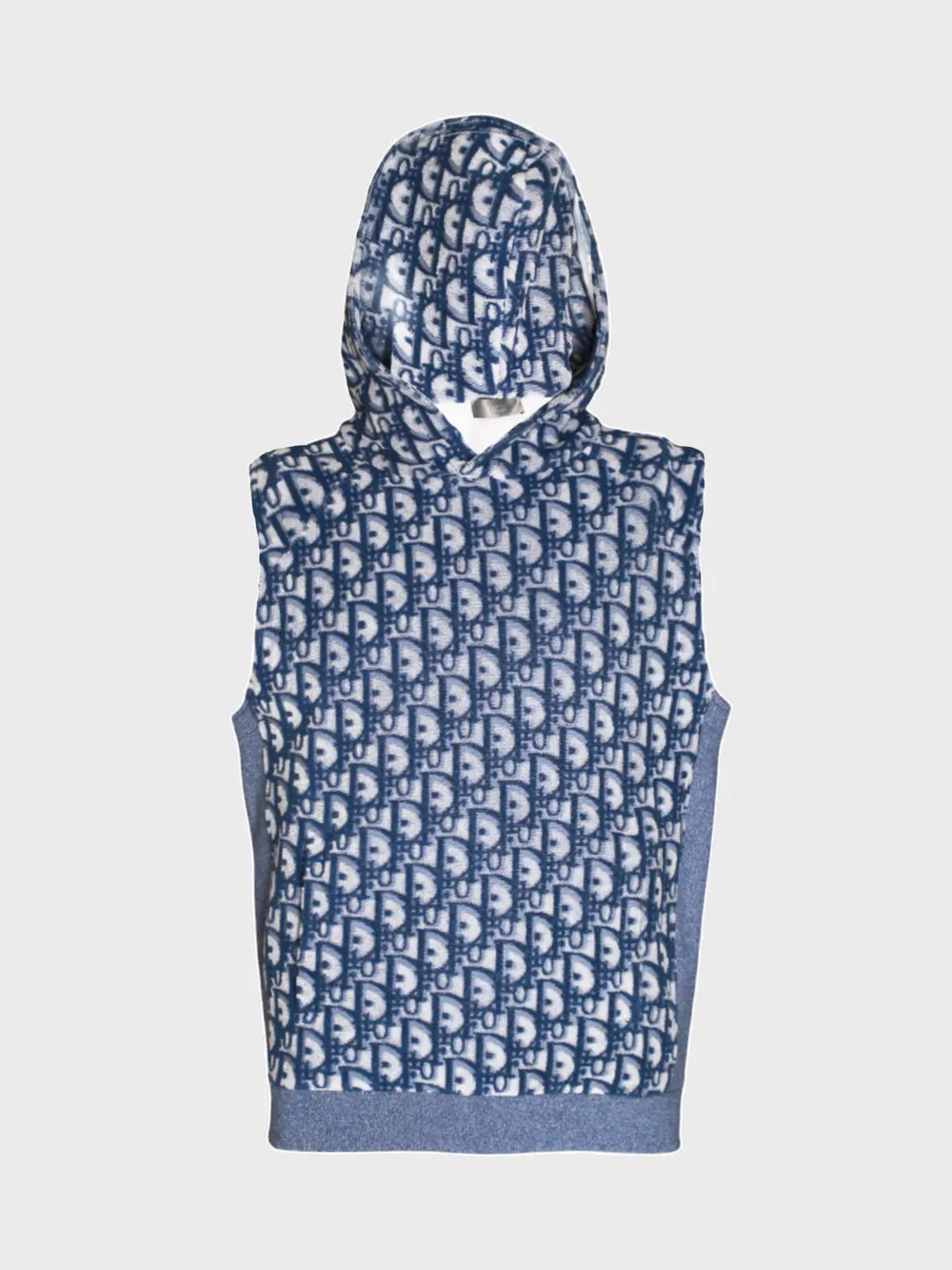 Мягкое худи от Dior выполнено из качественного флиса синего цвета, украшенного мелким узором в виде повторяющегося логотипа бренда. Модель прямого кроя с капюшоном обеспечивает комфортную посадку и теплое ощущение. Легкая и удобная ткань делает это худи идеальным выбором для повседневной носки или отдыха.