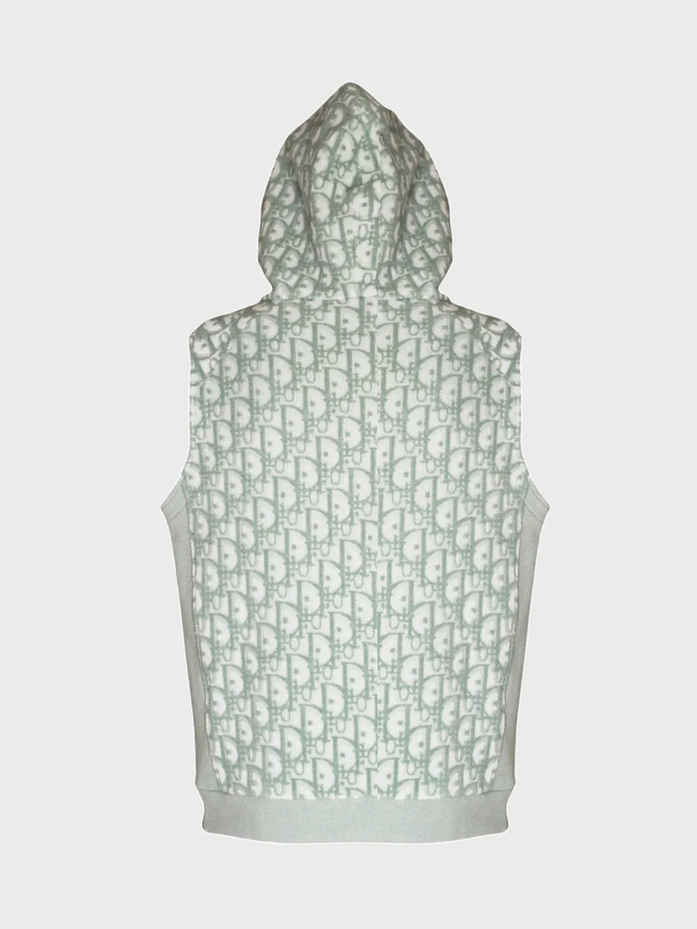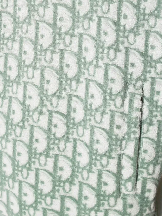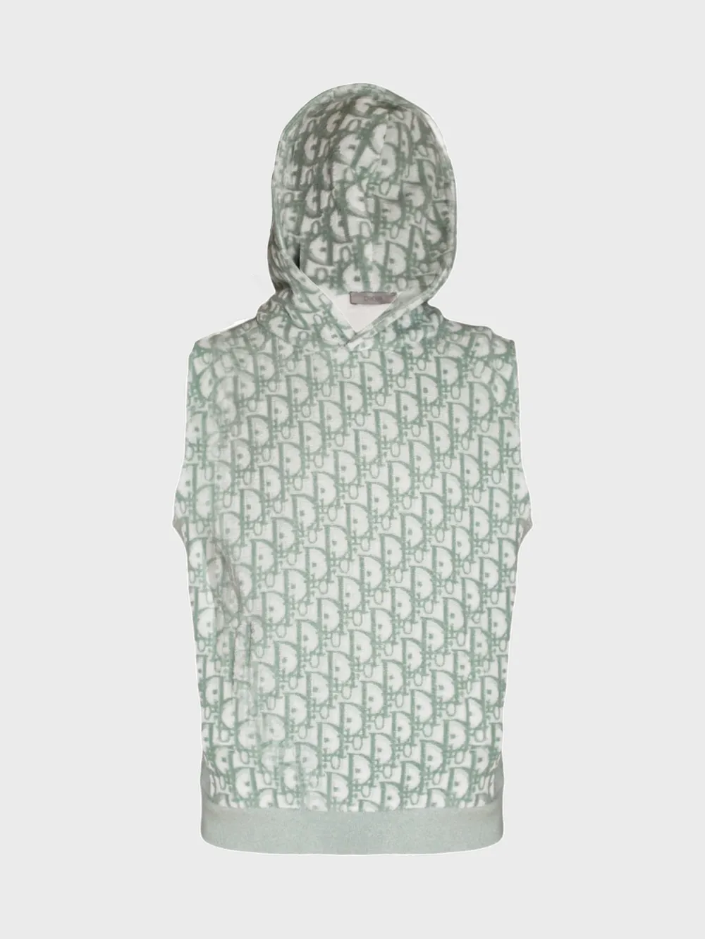 Мягкое худи от Dior выполнено из качественного флиса пастельно-зеленого цвета, украшенного мелким узором в виде повторяющегося логотипа бренда. Модель прямого кроя с капюшоном обеспечивает комфортную посадку и теплое ощущение. Легкая и удобная ткань делает это худи идеальным выбором для повседневной носки или отдыха.