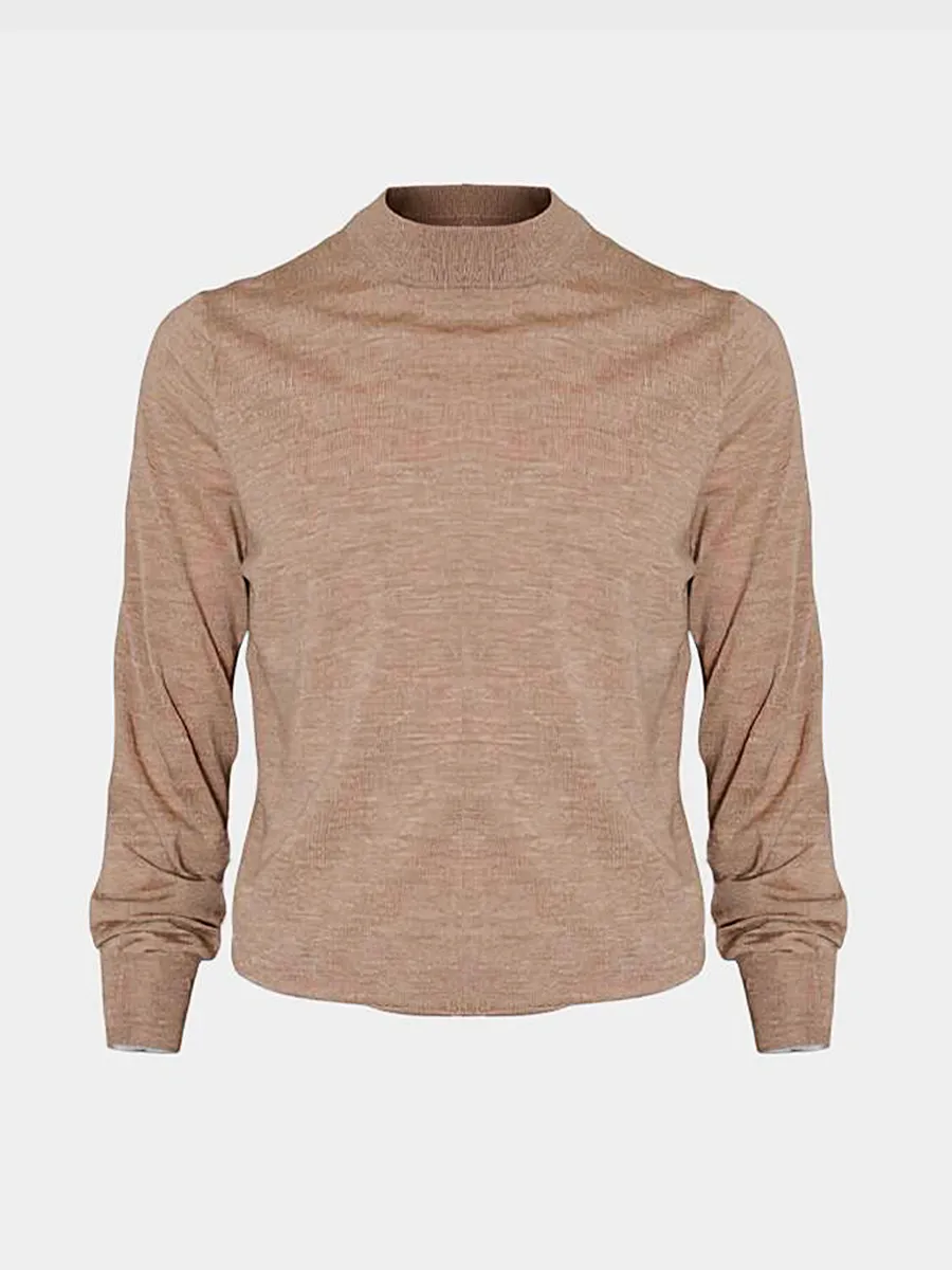 Кофта Brunello Cucinelli выполнена из тонкого шерстяного трикотажа нейтрального бежевого оттенка — сочетание утонченности и комфортной элегантности. Модель с высоким воротником, длинными рукавами и приталенным кроем подчеркивает минимализм и качество исполнения. Гладкая текстура и лаконичный дизайн делают её универсальным элементом гардероба, идеальным для повседневных образов или сочетания с более яркими аксессуарами. Истинное воплощение роскоши и мастерства бренда.