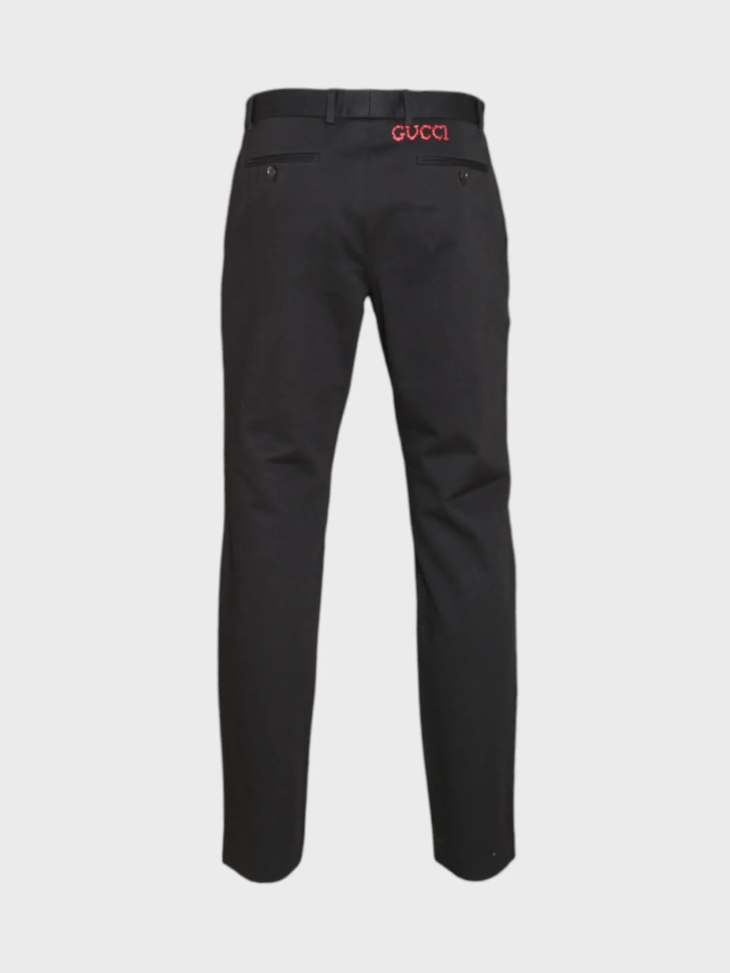 Темно-синие брюки Gucci, выполненные из качественного материала. Модель оснащена классическим кроем с прямым силуэтом и удобной посадкой. На задней части брюк расположен крупный красный логотип "GUCCI", который добавляет узнаваемый акцент к элегантному дизайну. Простой стиль идеально сочетается как с повседневными, так и с более формальными образами, подчеркивая безупречный вкус владельца.