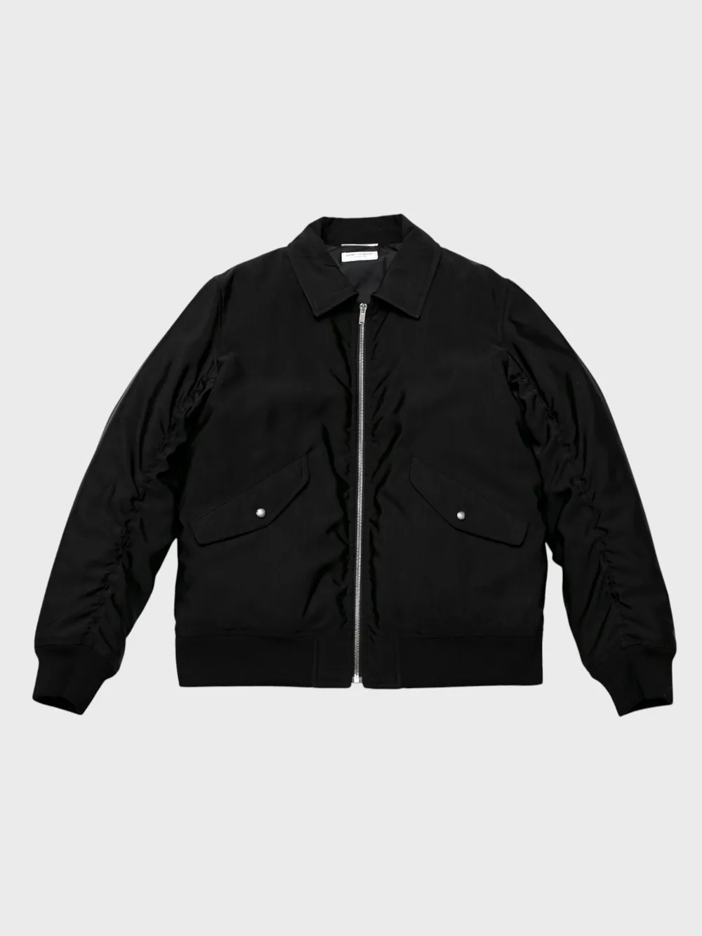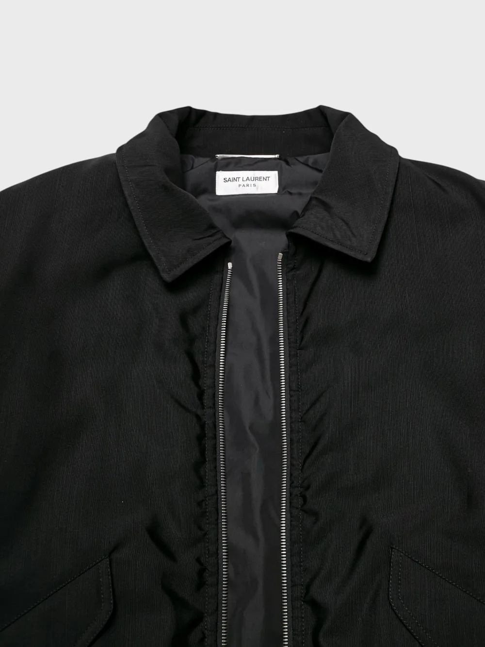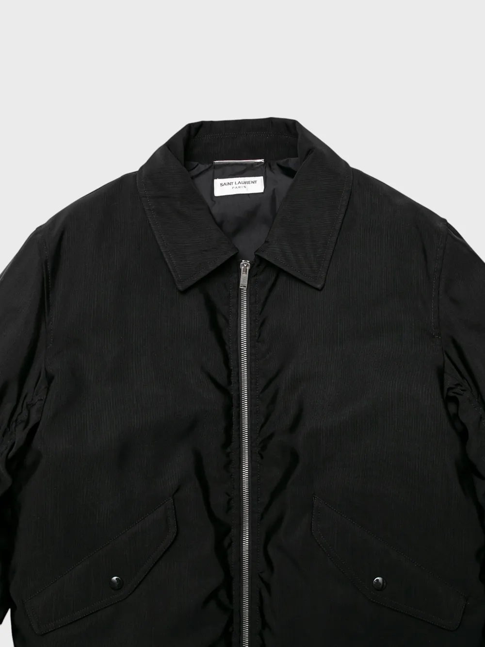 Куртка Saint Laurent выполнена из высококачественной черной ткани с гладкой фактурой и характерным блеском, подчёркивающим премиальность материала. Модель в стиле бомбер с контрастной молнией, эластичными манжетами и поясом, а также двумя накладными карманами — сочетание утончённого минимализма и функциональности. Тонкая строчка, аккуратные швы и фирменная этикетка на воротнике свидетельствуют о безупречном исполнении и статусе изделия как элемента современного мужского гардероба высшего класса.