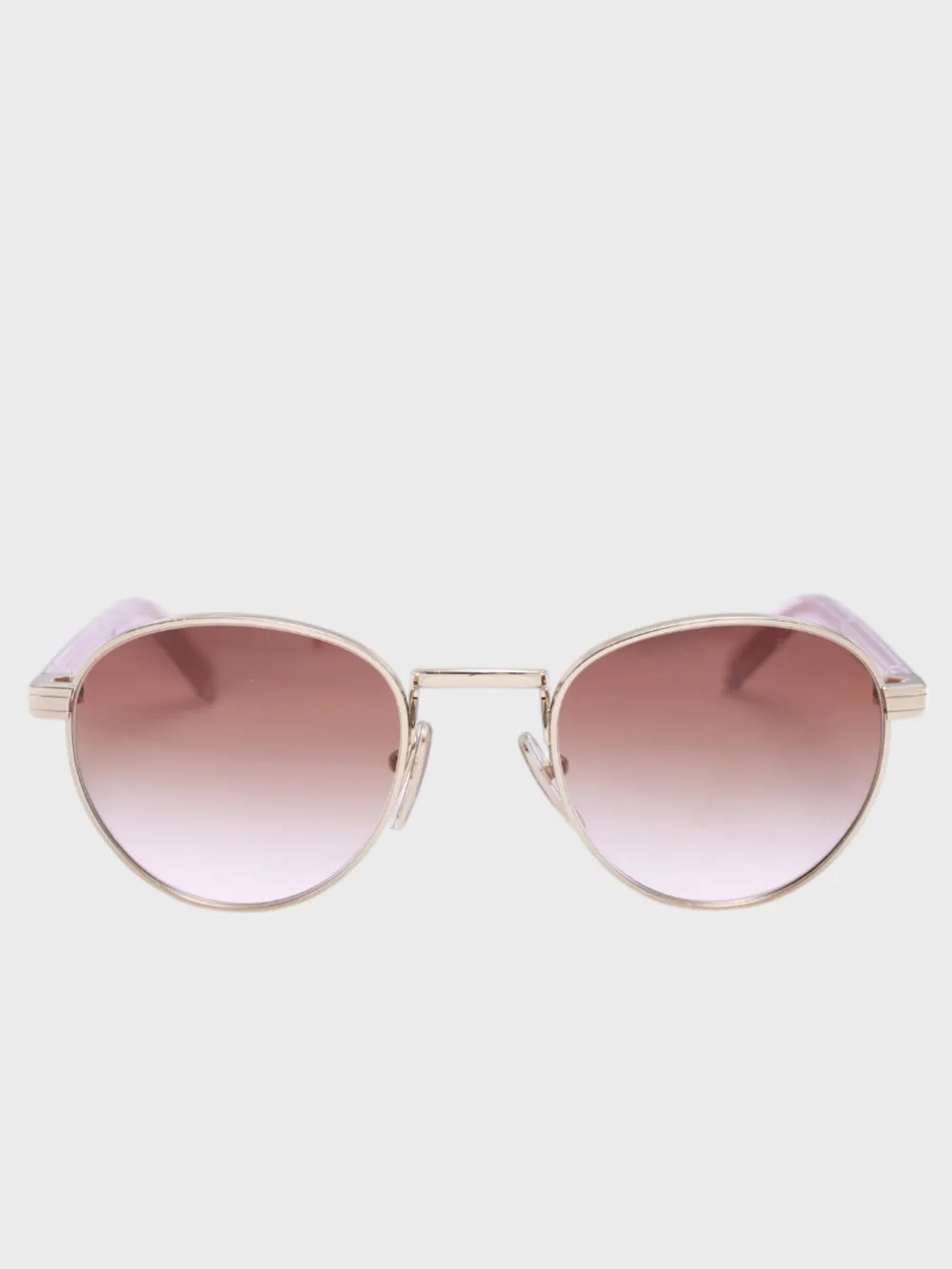 Солнцезащитные очки Prada выполнены из металла с золотистым покрытием и оправой в нежной розовой расцветке. Модель сочетает классический круглый дизайн с современными деталями, дополнена фирменным логотипом бренда на дужках. Линзы обеспечивают защиту от ультрафиолетовых лучей, а комфортная посадка делает эти очки универсальным аксессуаром для повседневного и делового стиля.