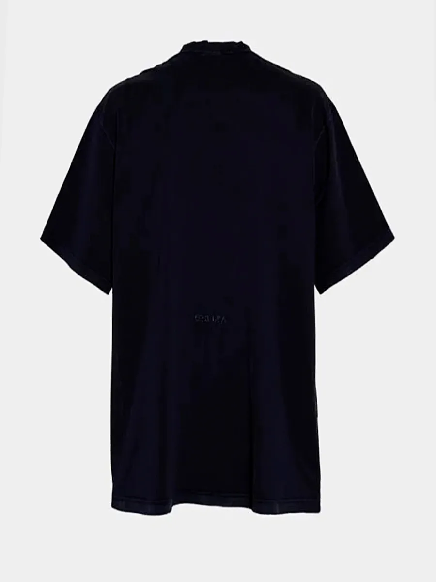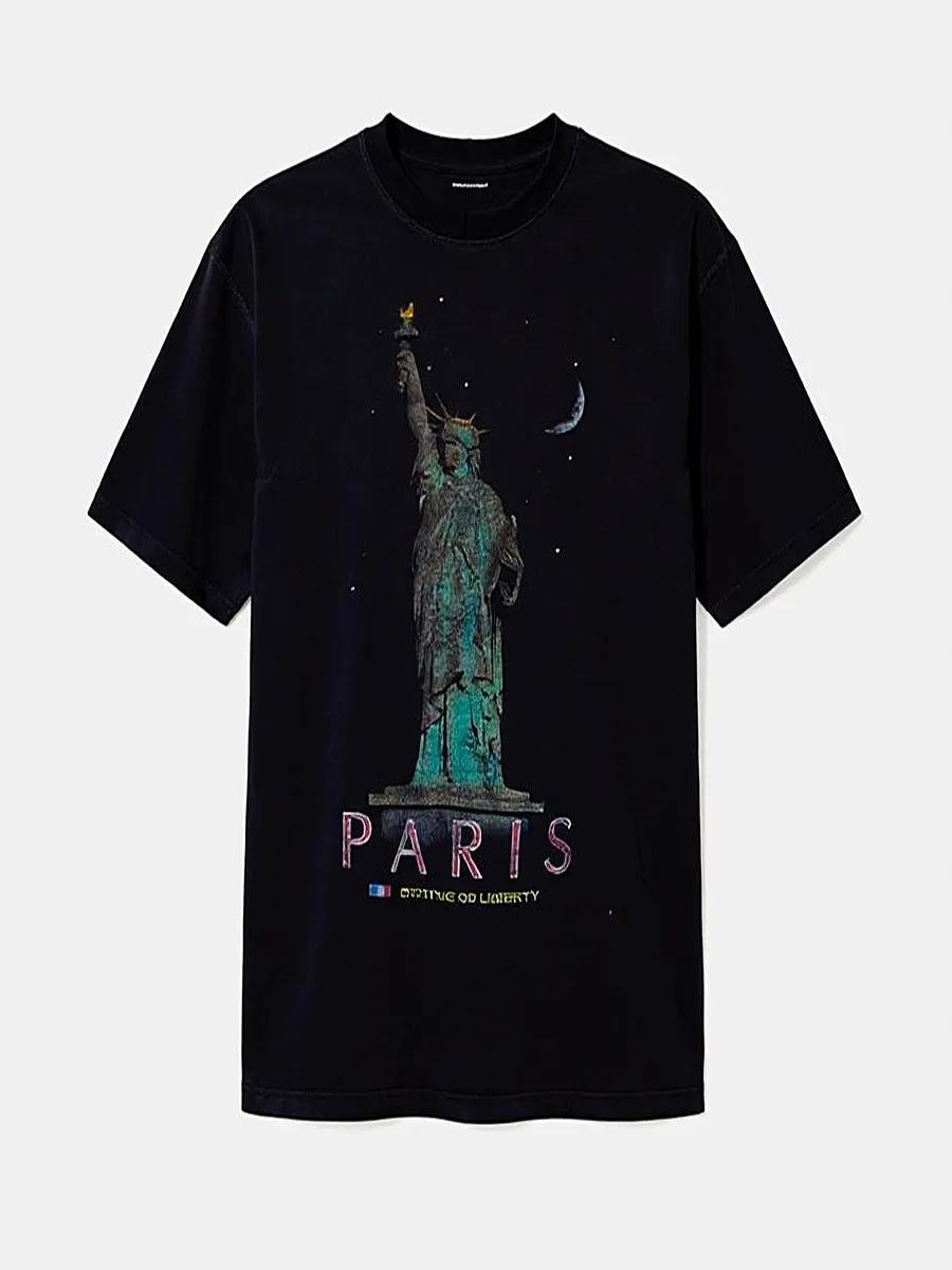 Футболка Balenciaga выполнена из качественного хлопкового материала темно-синего цвета. Модель дополнена оригинальным принтом на передней части, изображающим статую Свободы в ночном небе с луной и звездами, а также надписью "PARIS" под статуей. На спине футболки размещено вышитое имя бренда "Balenciaga". Простой крой с короткими рукавами и круглым вырезом обеспечивает комфорт ношения, а безупречное качество исполнения делает эту футболку стильным аксессуаром для повседневного образа.