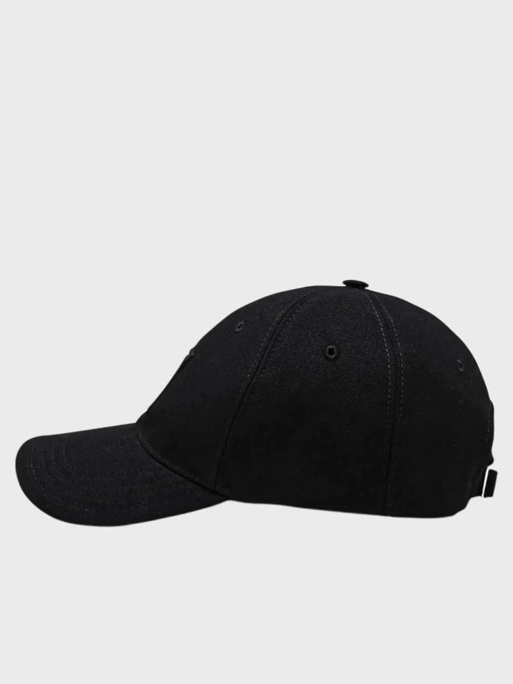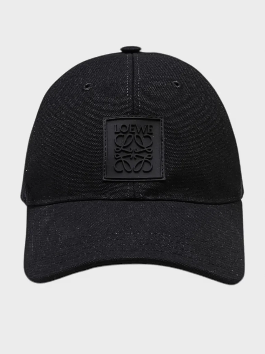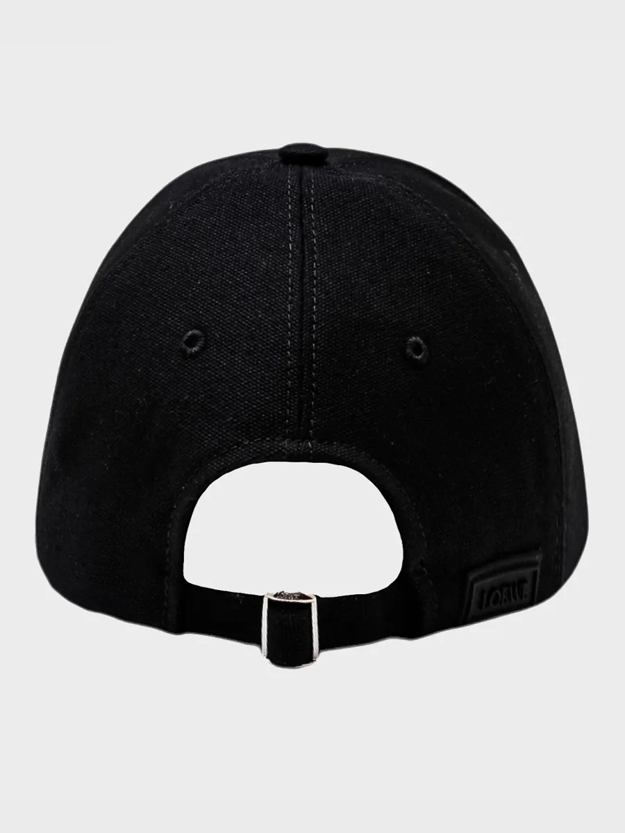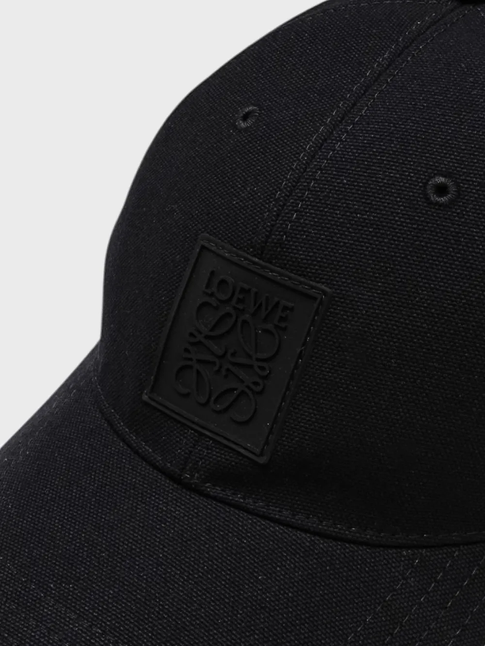Кепка Loewe выполнена из черного текстиля с плотной текстурой. Модель классического дизайна, характерного для бейсбольных кепок, имеет прямую форму и зауженную макушку. На передней части кепки расположен крупный прямоугольный нашивной элемент с выгравированным логотипом бренда "LOEWE" в виде уникального абстрактного символа. Кепка оснащена регулируемым ремешком на затылке для комфортной посадки на голове. Детали, такие как швы и петли, выполнены аккуратно, подчеркивая высокое качество изготовления. Эта кепка сочетает в себе спортивный стиль и современный дизайн, идеально подходя для повседневного использования или активного отдыха.