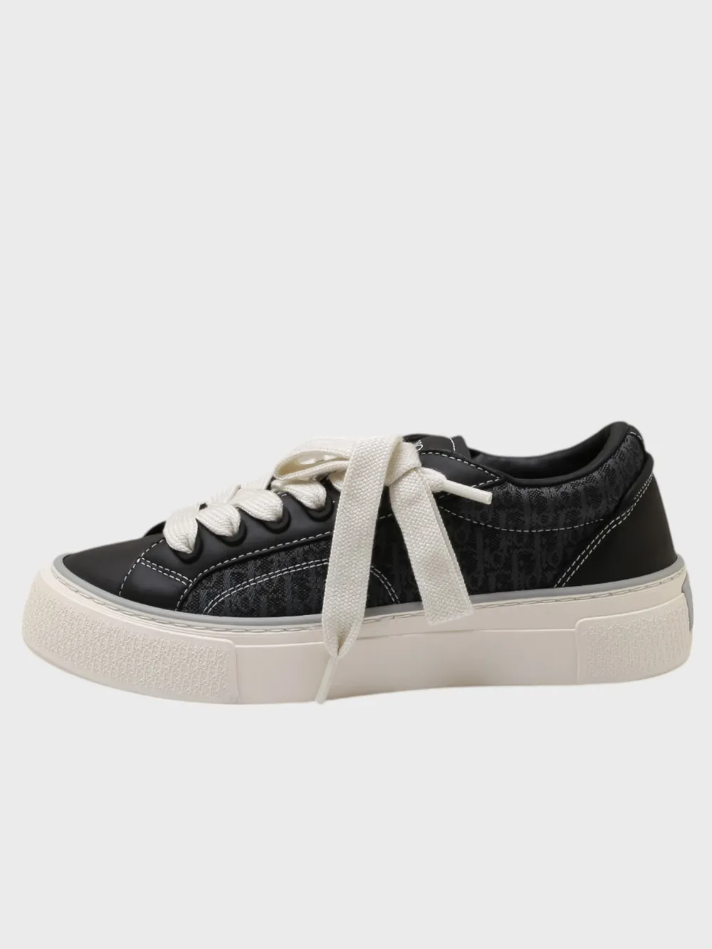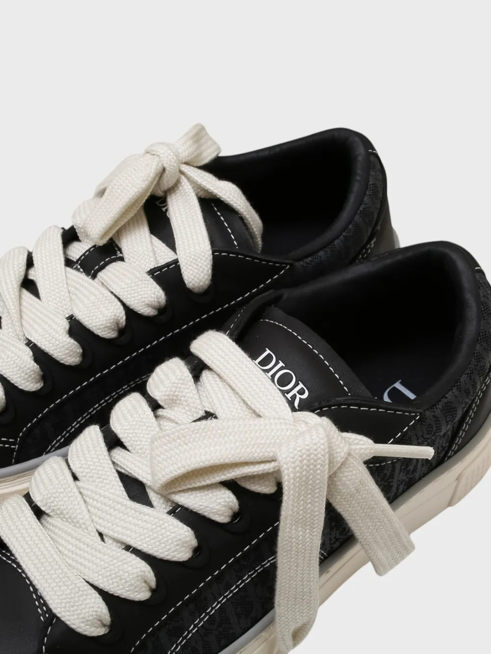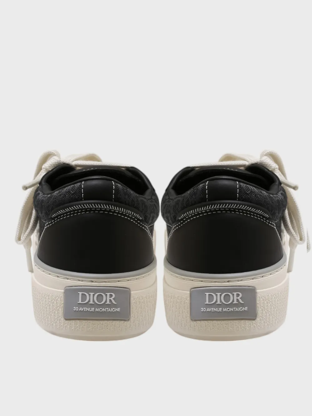 Кеды Christian Dior выполнены в современном стиле с комбинированным дизайном. Верхняя часть кроссовок сочетает черную кожу и текстиль с характерным монограммным принтом, который является отличительной особенностью бренда. Белые шнурки создают контрастный акцент на фоне темного верха. Подошва выполнена из резины с текстурой для лучшей устойчивости и комфорта при ходьбе. Модель дополнена декоративными элементами с логотипом "DIOR" и адресом "30 AVENUE MONTAIGNE", что подчеркивает премиальность изделия. Удобная конструкция и безупречное качество исполнения делают эти кеды идеальным выбором для повседневного использования или спортивного образа. Их универсальность позволяет сочетать их с различными типами одежды.