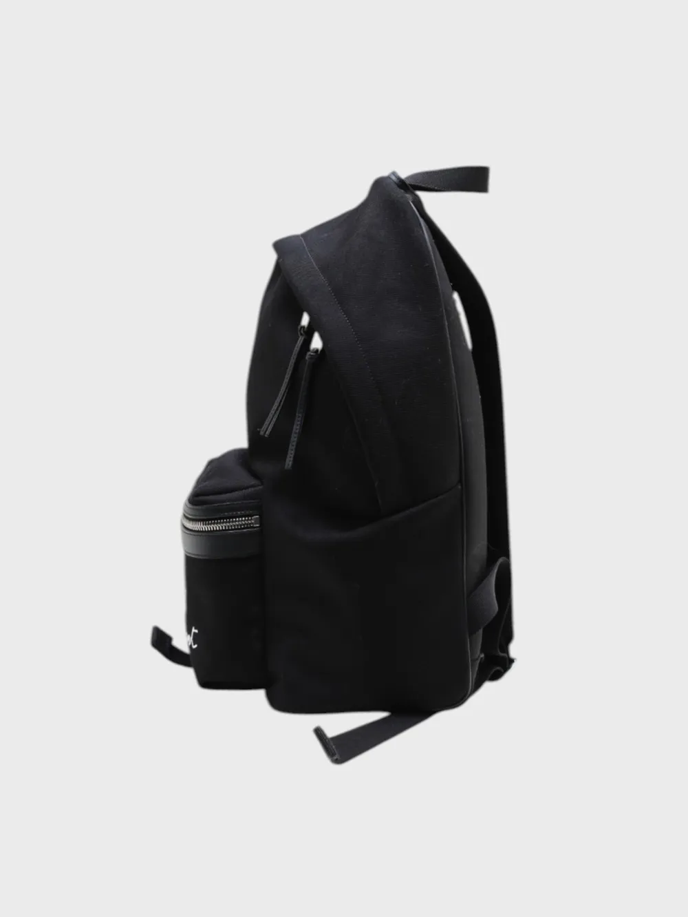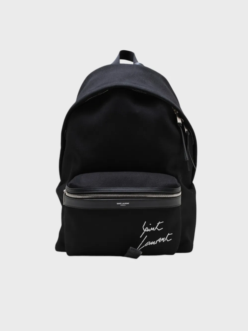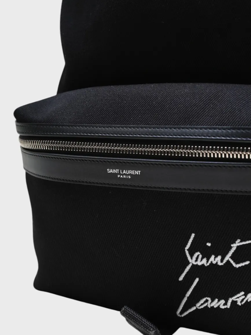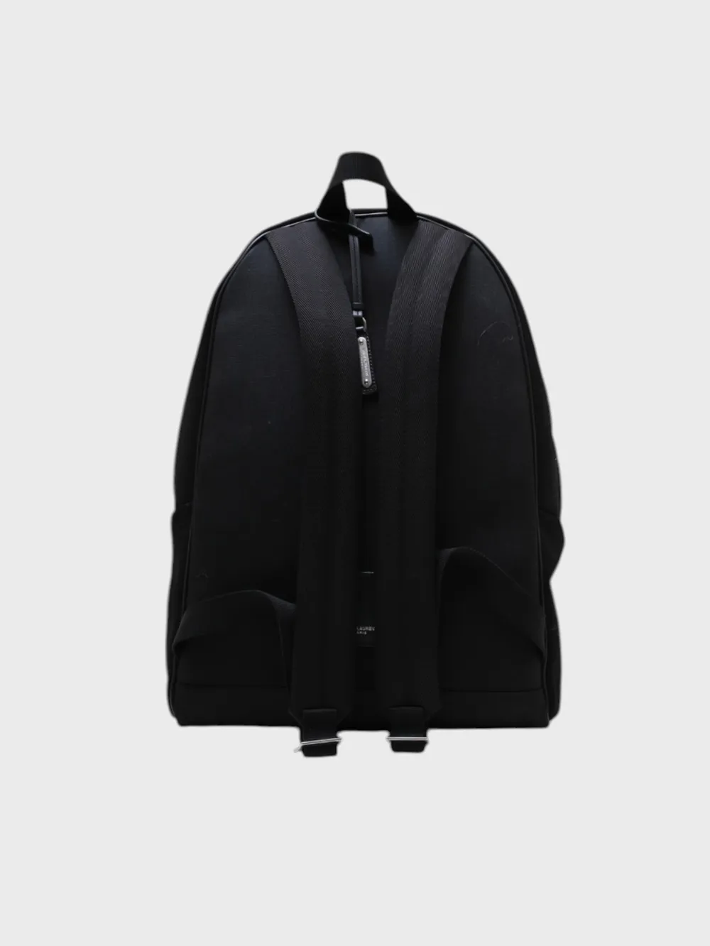 Рюкзак Saint Laurent выполнен из черного текстиля с гладкой фактурой. Модель дополнена несколькими внешними карманами с молниями, обеспечивающими удобный доступ к содержимому. На лицевой стороне размещено фирменное название бренда "Saint Laurent Paris" в белом цвете, а также подпись дизайнера на задней части рюкзака. Регулируемые плечевые ремни и прочная конструкция делают аксессуар функциональным и стильным для повседневного использования или путешествий.