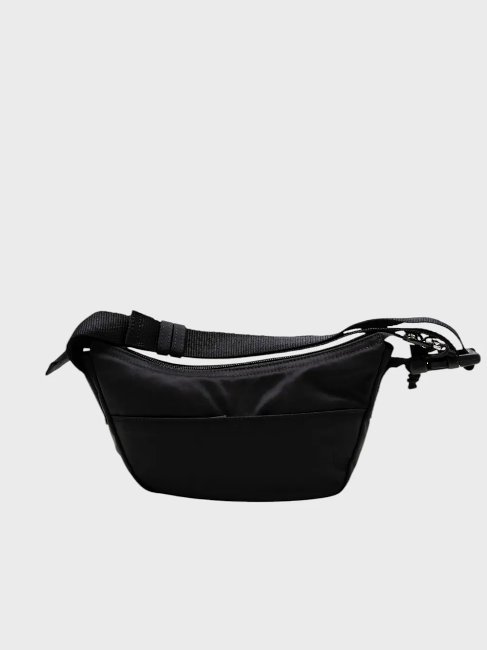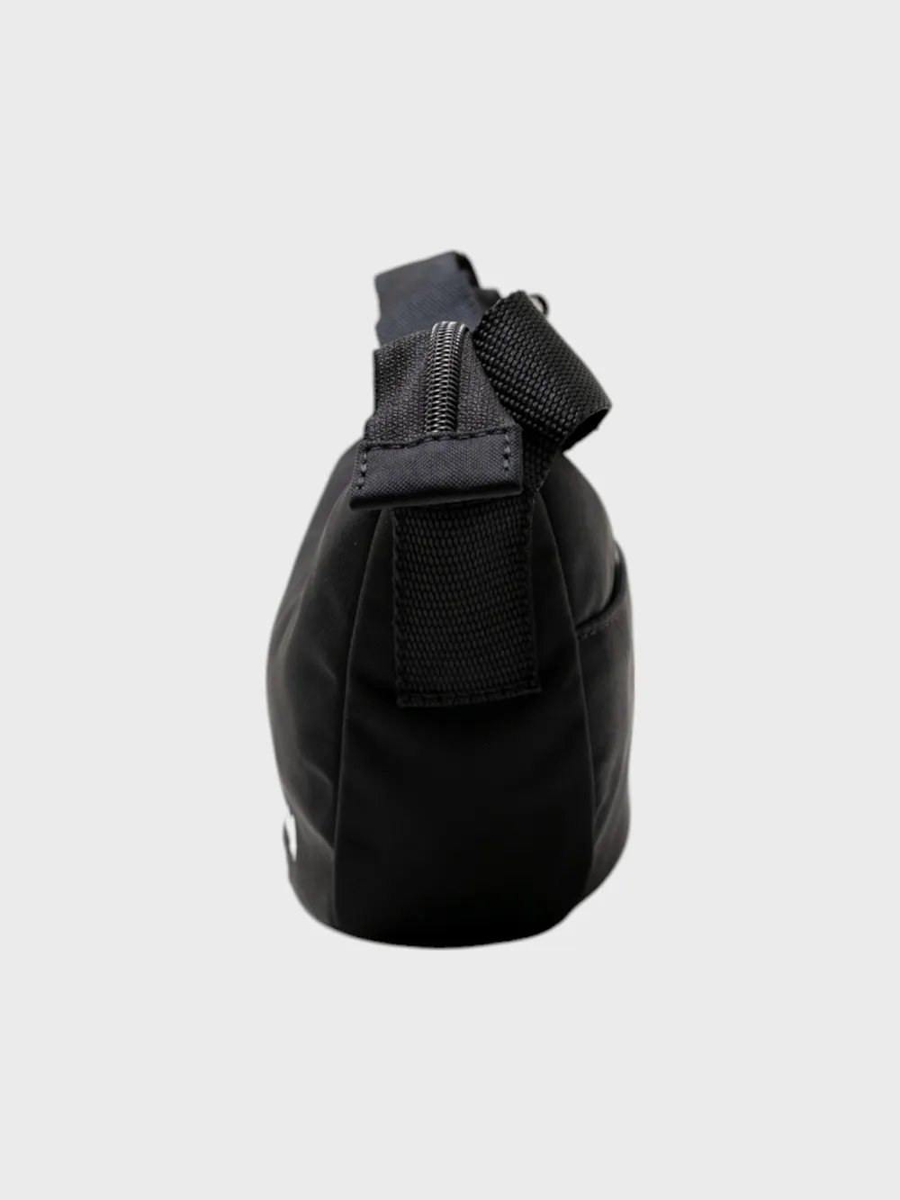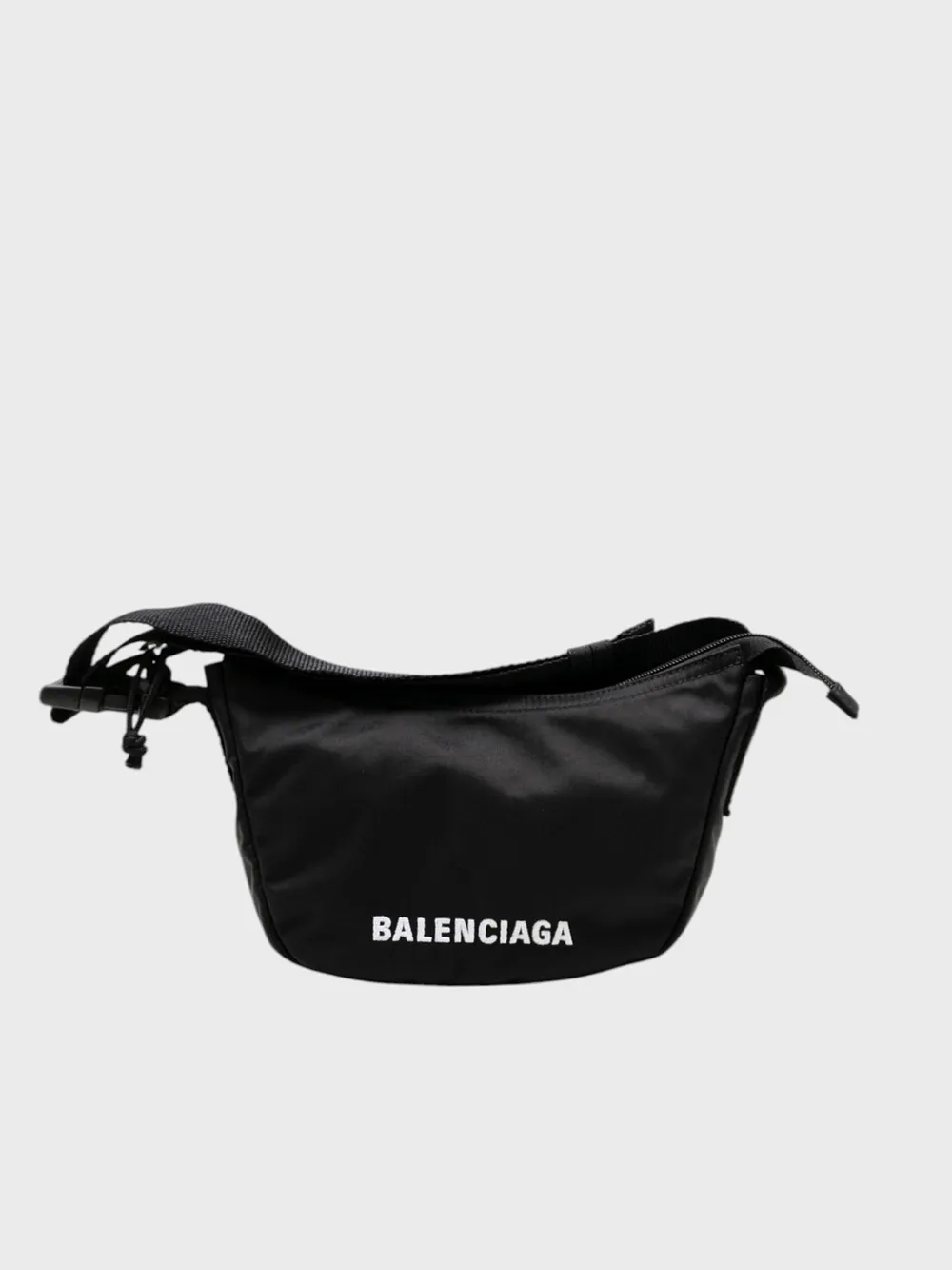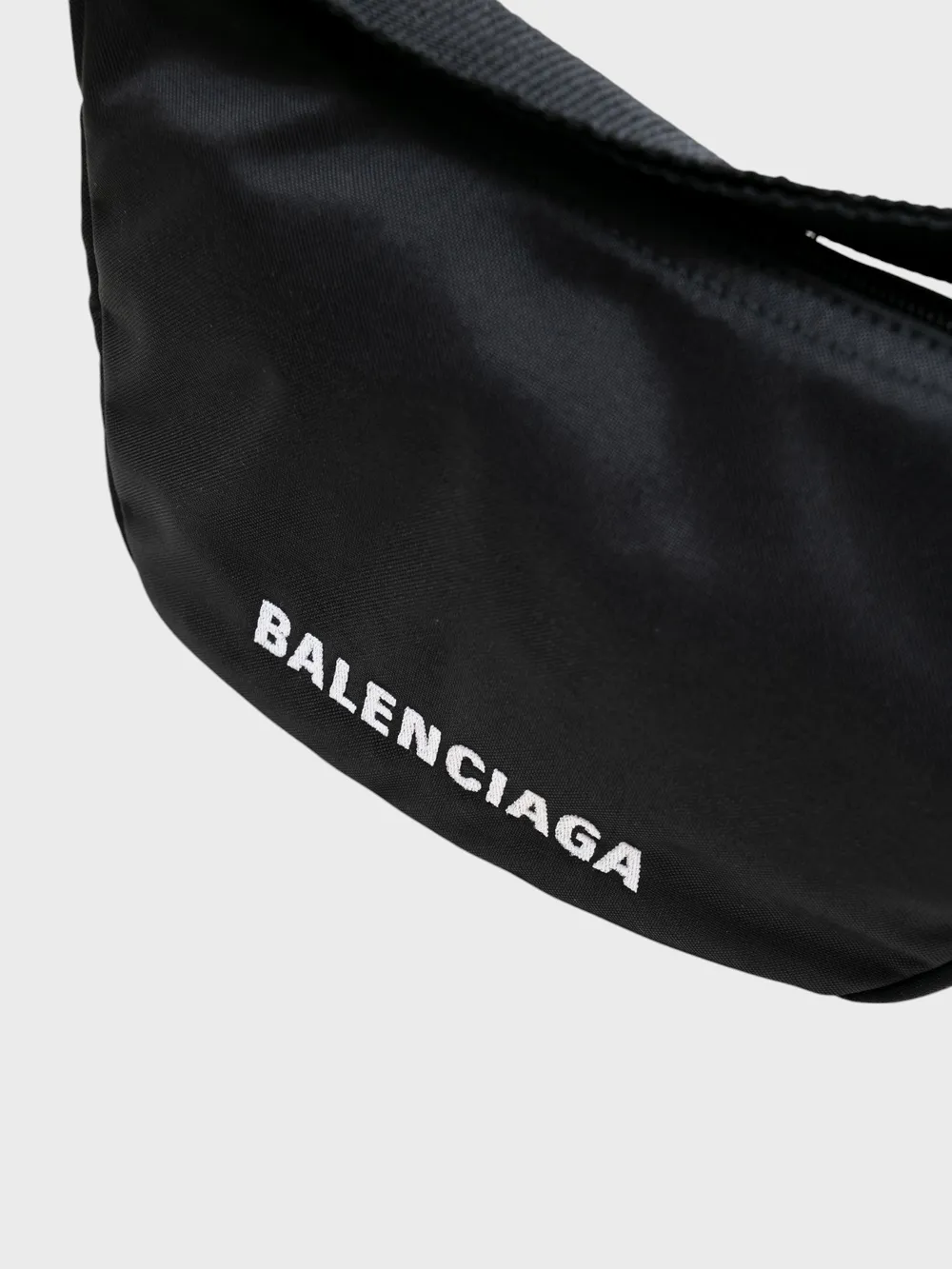Сумка Balenciaga выполнена из прочного черного нейлона с фирменным логотипом "Balenciaga" белым шрифтом. Модель оснащена регулируемым ремнем для ношения на бедре или плече, а также застежкой-молнией для удобного доступа к содержимому. Минималистичный дизайн и высокое качество материалов делают эту сумку универсальным аксессуаром для повседневного использования.