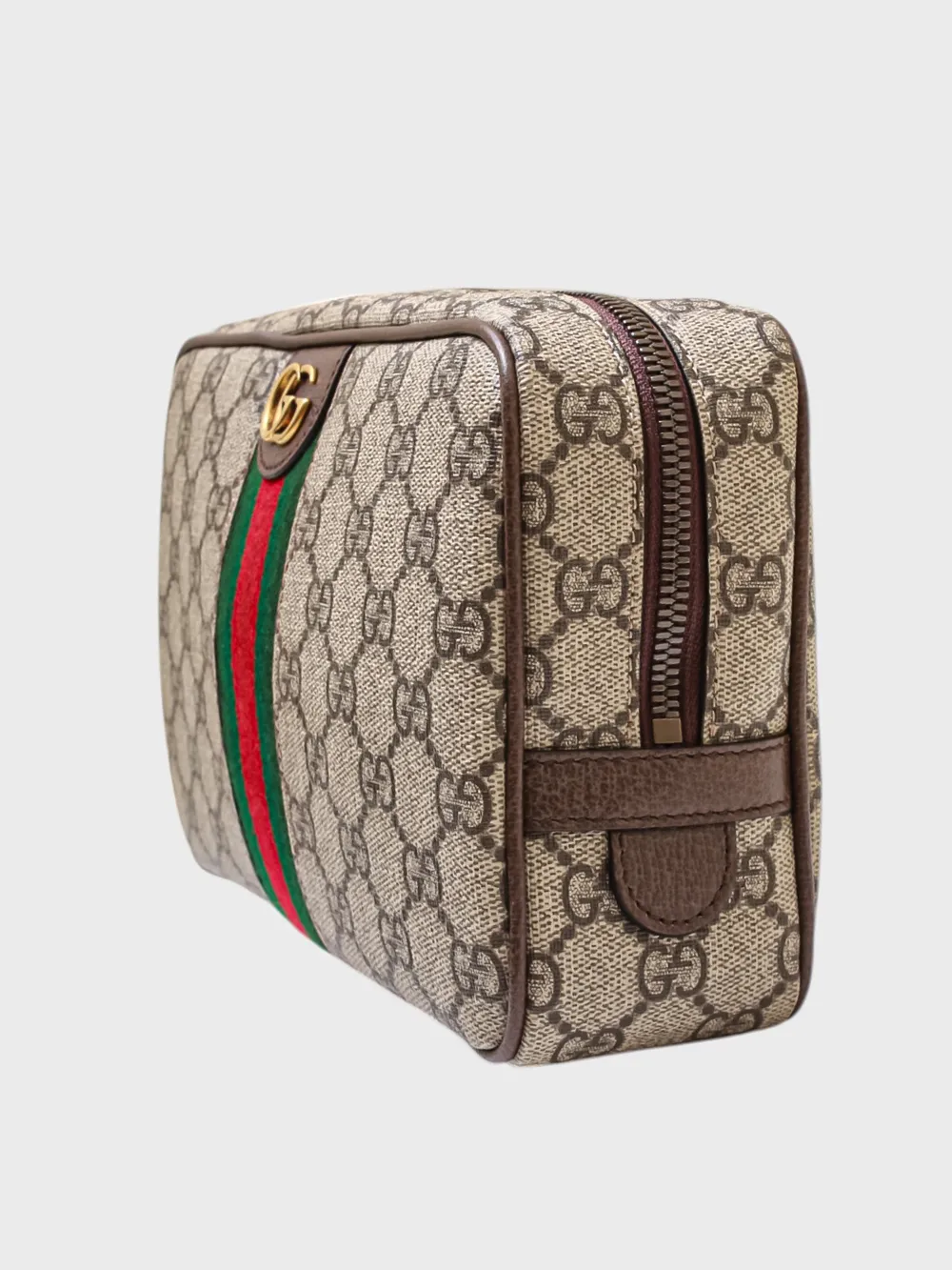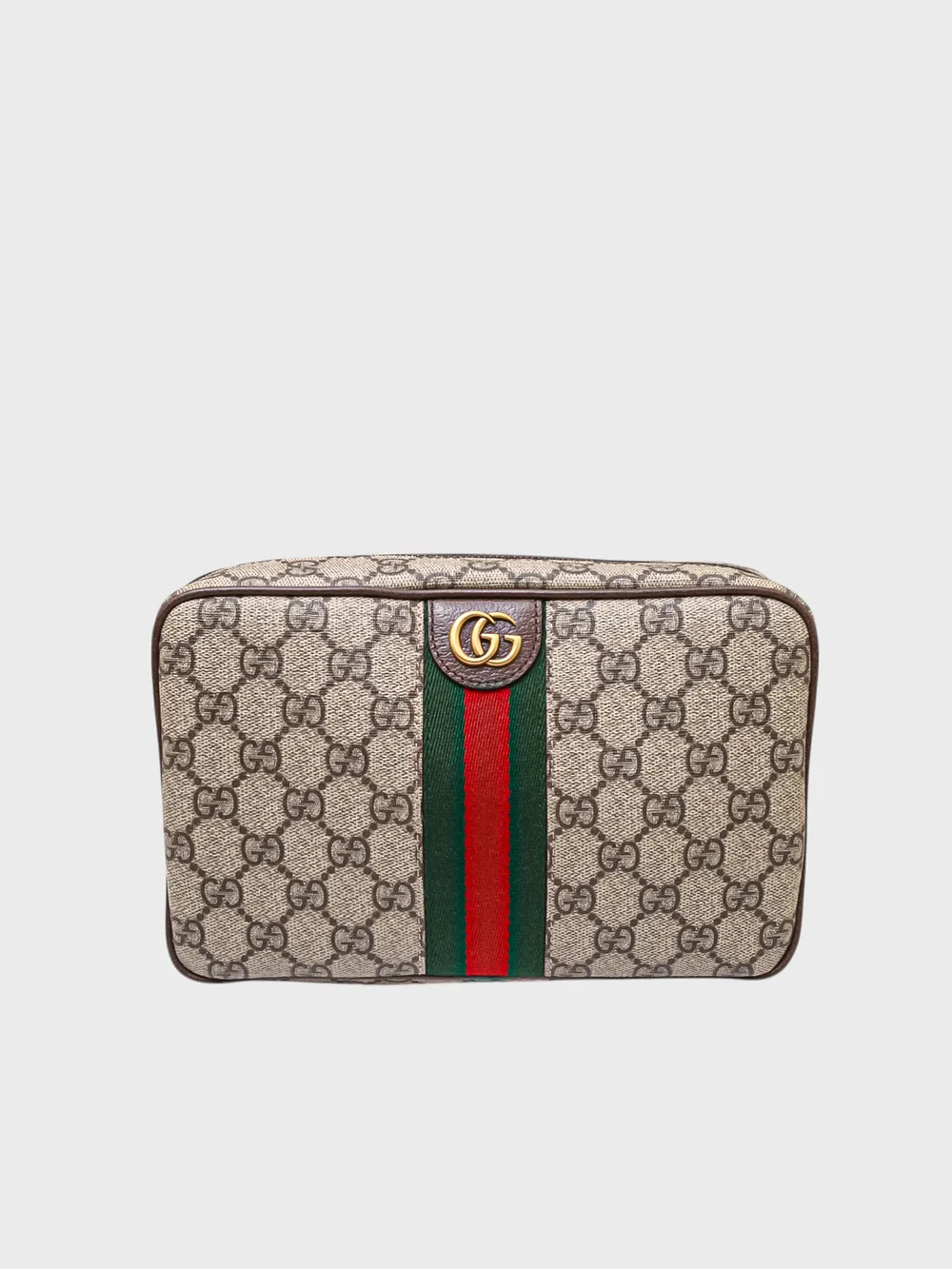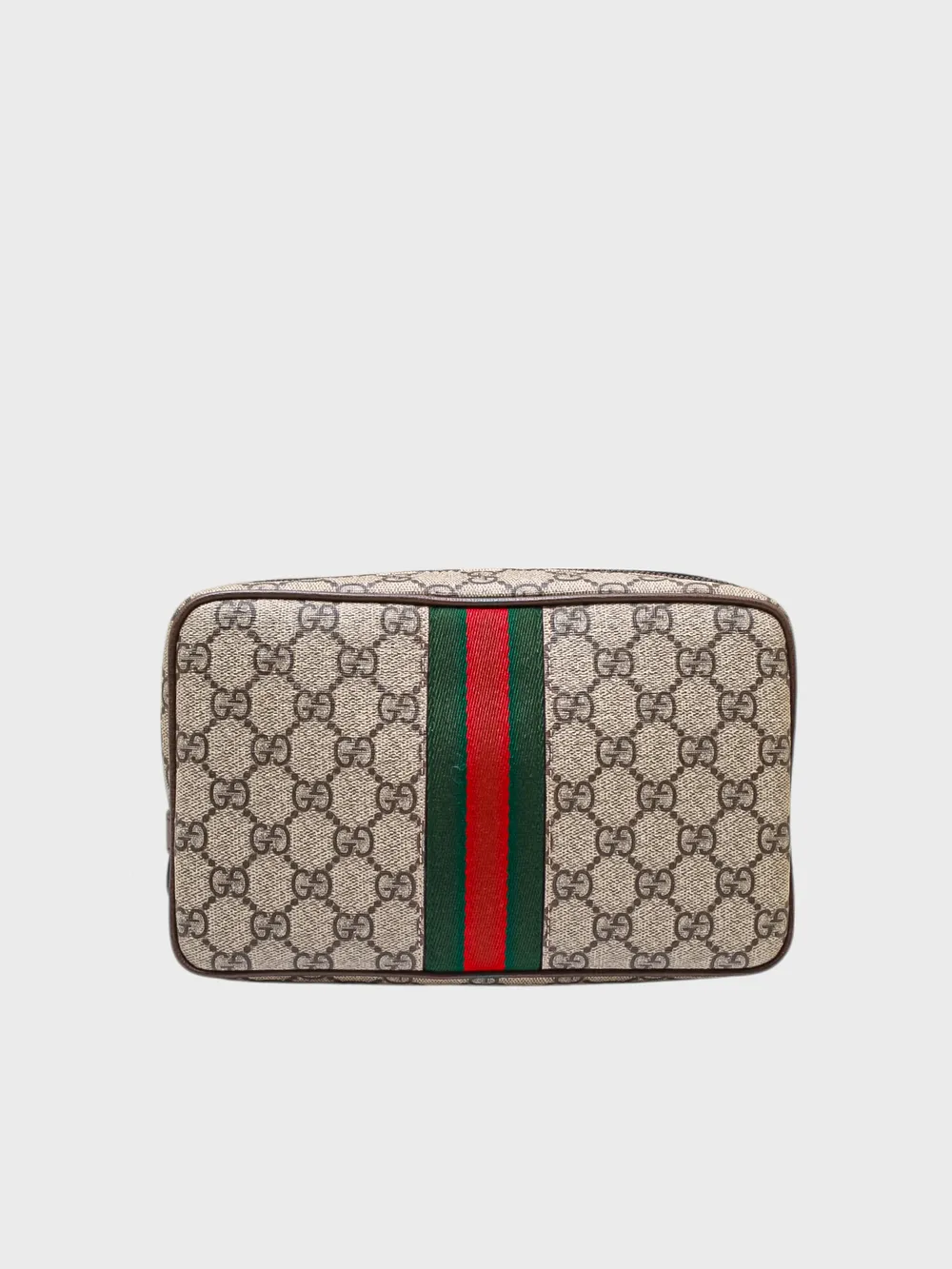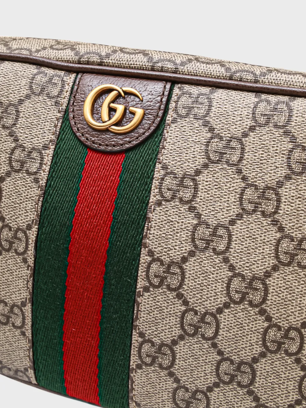 Сумка Gucci выполнена из высококачественного GG Supreme канваса с фирменным принтом и контрастными деталями. Модель дополнена классическим золотым логотипом "G" на кожаной подкладке, красно-зеленой полосой по бокам и молнией для удобного доступа к содержимому. Комбинация текстуры ткани и натуральной кожи создает роскошный премиальный вид, идеально подходящий для повседневного использования или деловых встреч.