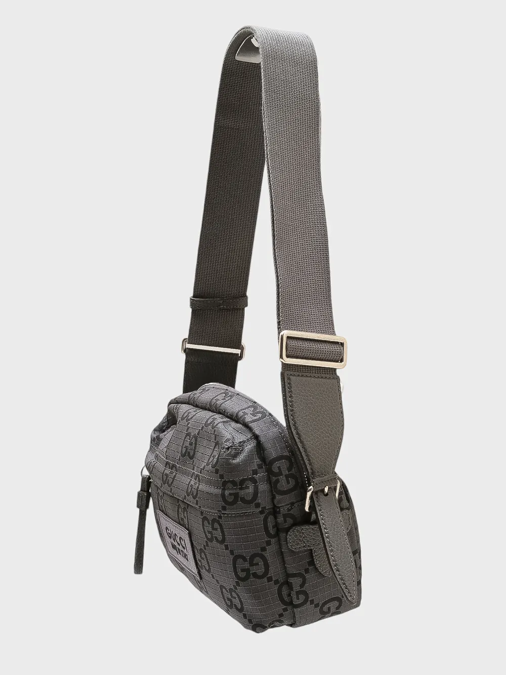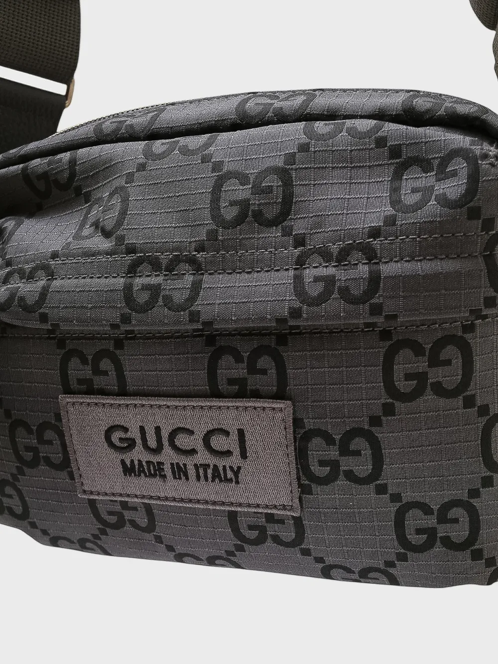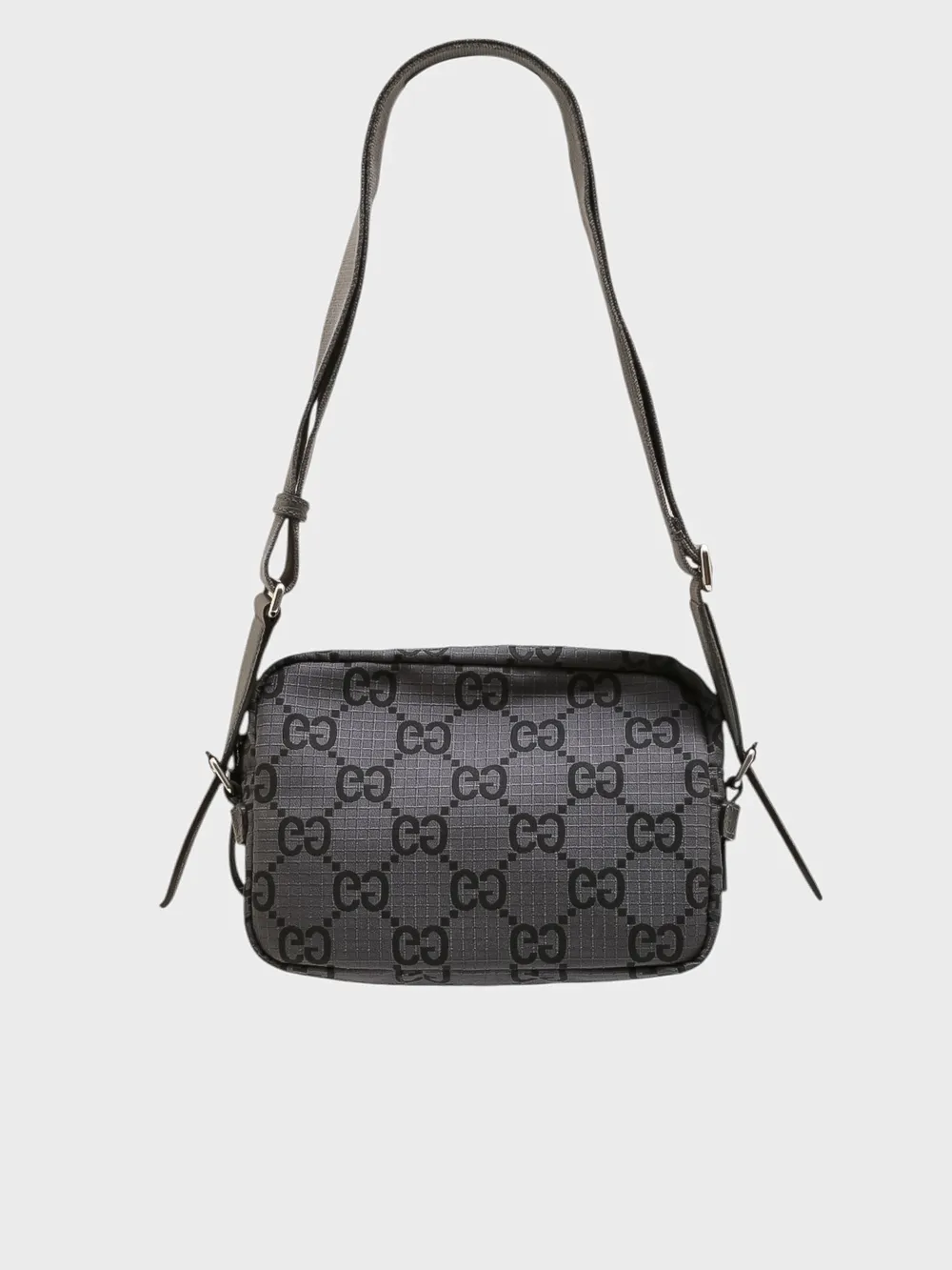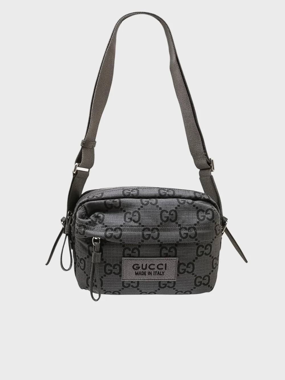 Сумка Gucci выполнена из высококачественного текстиля темно-серого цвета с фирменным принтом "GG Supreme", который сочетает черный и серый цвета. Дизайн акцентирован металлической застежкой-молнией и небольшим кожаным логотипом на передней части, что придает изделию узнаваемый и элегантный стиль. Модель дополнена регулируемой плечевой лямкой для удобства ношения. Классический дизайн и премиальное качество делают эту сумку универсальным аксессуаром, подходящим как для повседневного, так и для делового стиля.