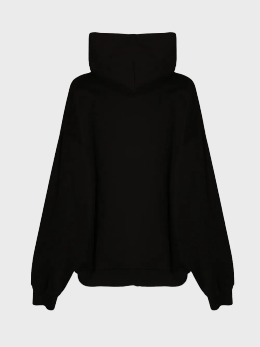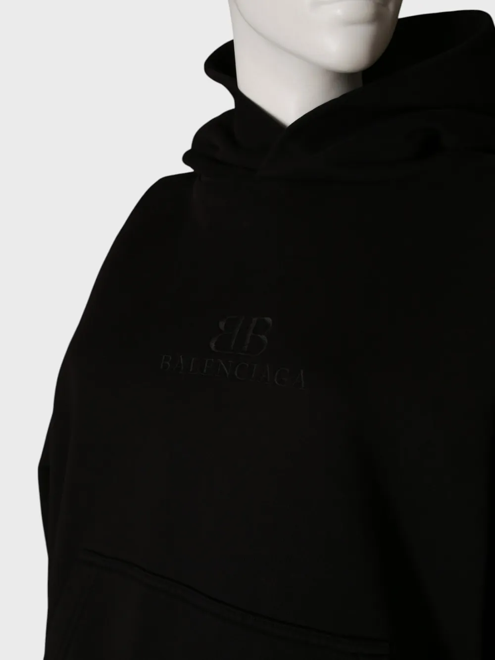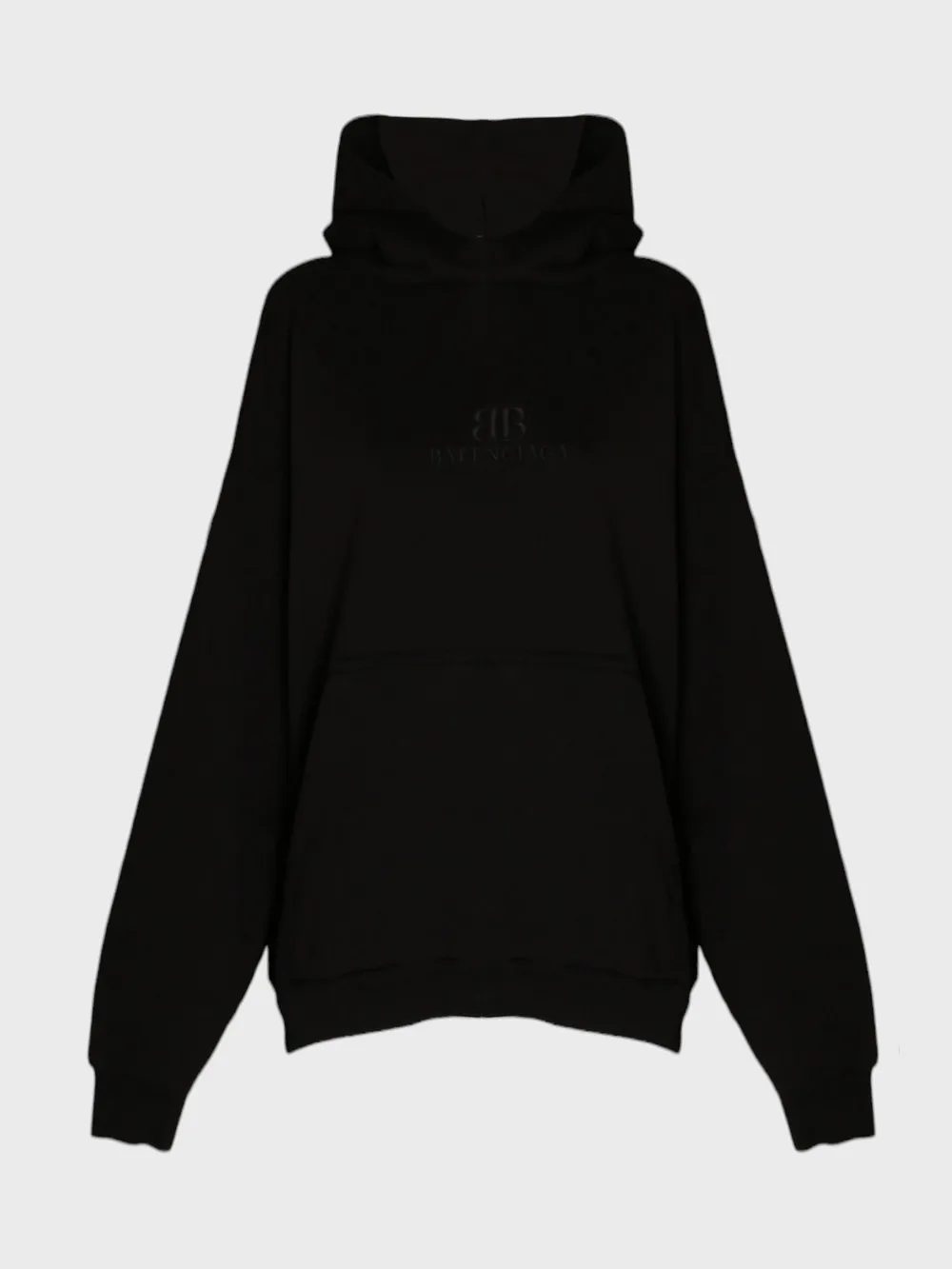 Худи Balenciaga выполнено из мягкого черного хлопка с комфортным свободным кроем. Модель дополнена капюшоном и небольшим логотипом бренда на груди, выполненном в виде фирменной надписи и монограммы. Простой дизайн и высокое качество материалов делают худи идеальным выбором для повседневного стиля.