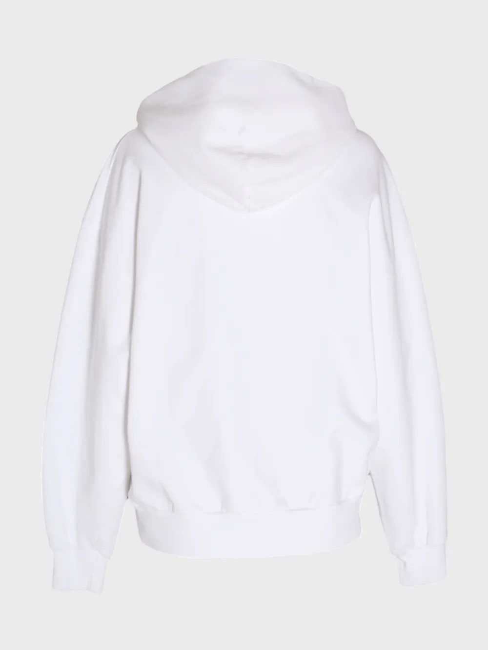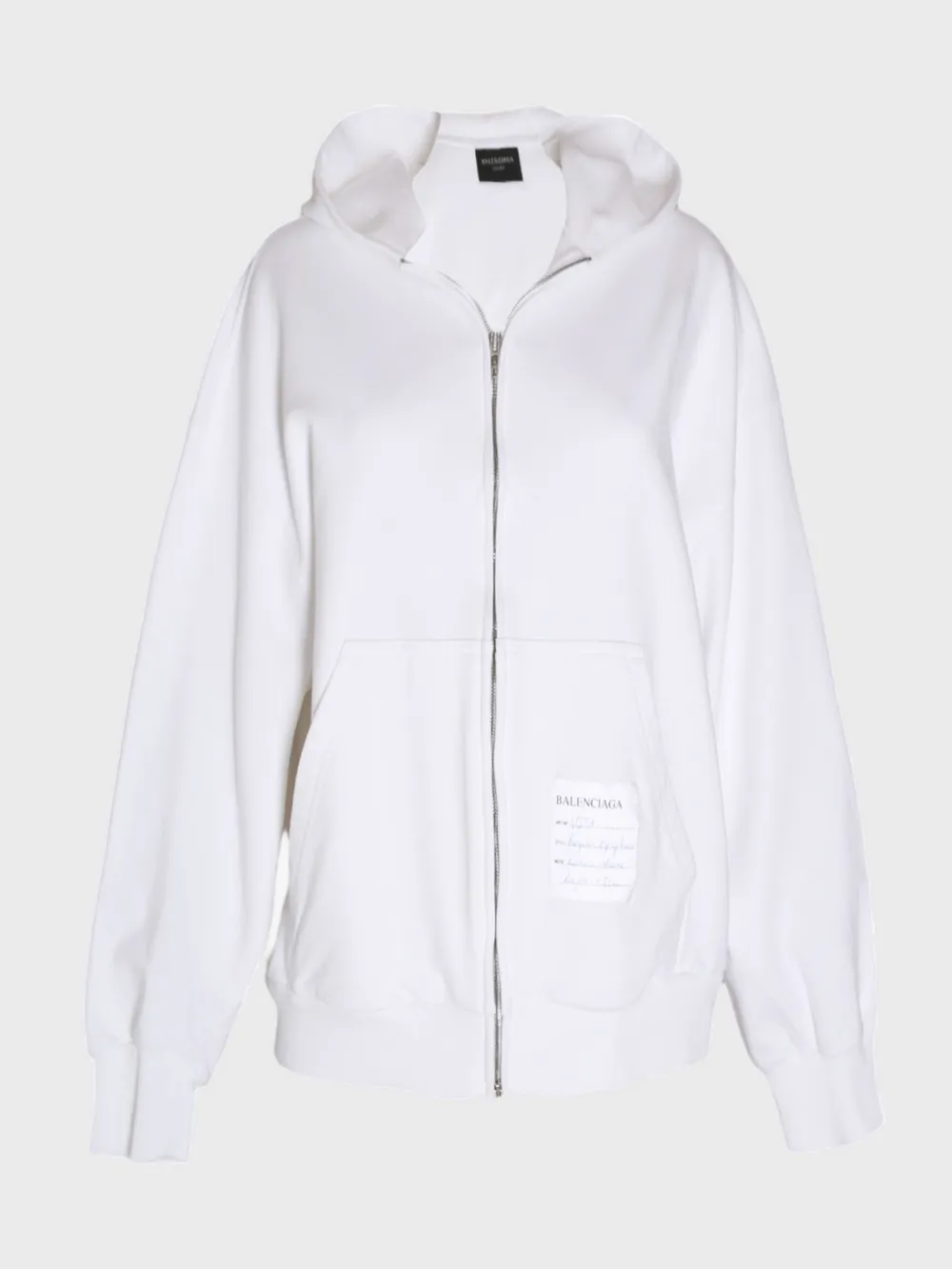 Худи Balenciaga выполнено из белой ткани с молнией спереди. Модель имеет капюшон, длинные рукава и два кармана на груди. На одном из карманов размещена наклейка с текстом в стиле ручного письма, добавляющая уникальность дизайну. Спинка оформлена минимально, сохраняя чистоту линий. Комфортный крой и простой дизайн делают худи идеальным для повседневной носки.