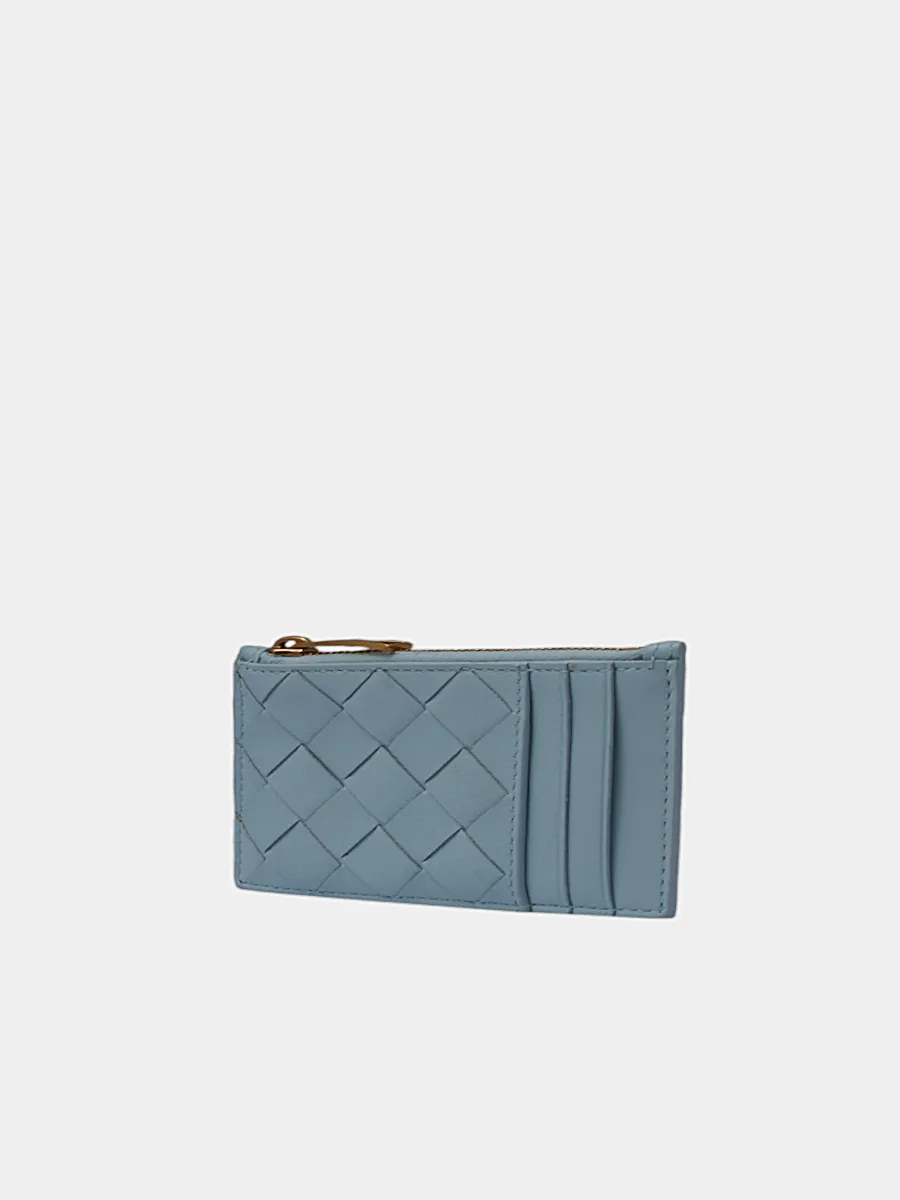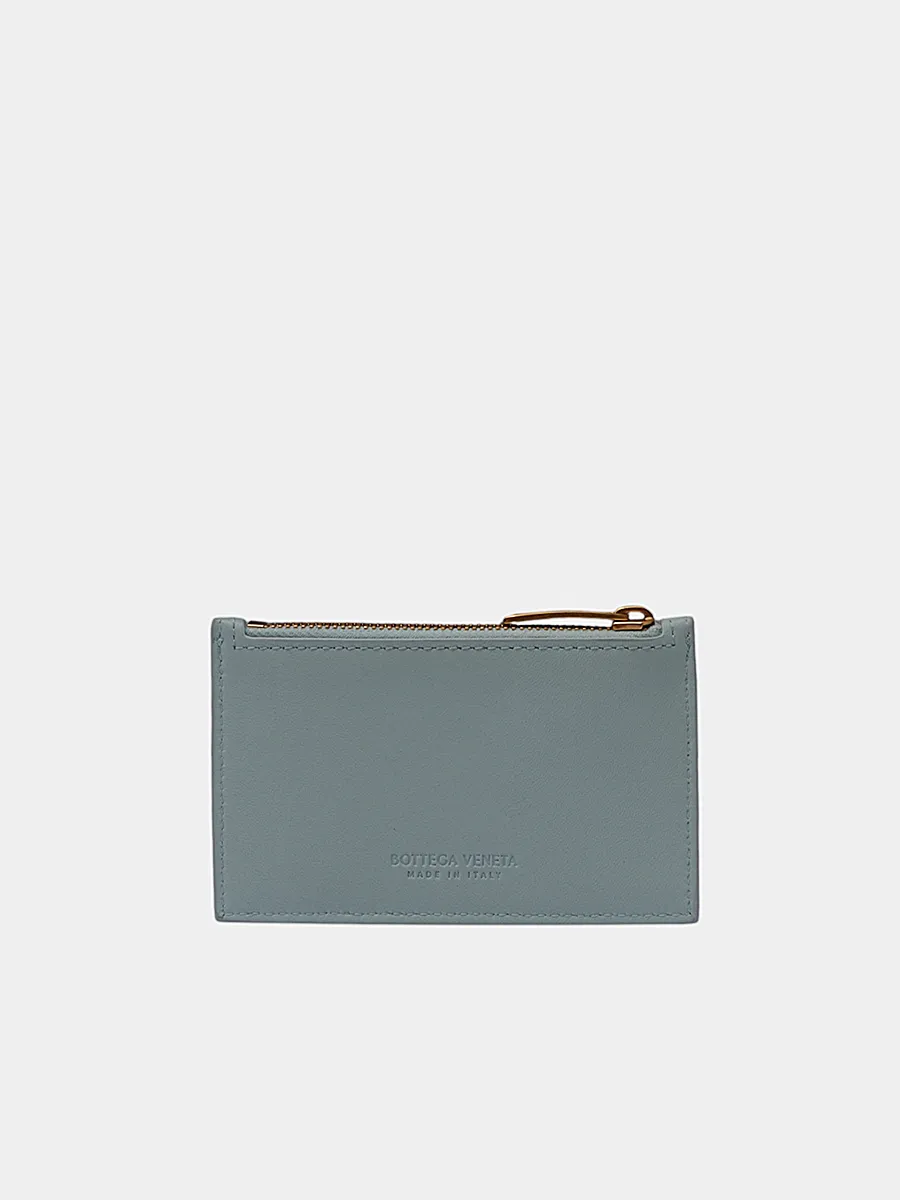 Портмоне Bottega Veneta выполнено из гладкой кожи светло-серого цвета с фирменной плетёной текстурой Intrecciato и контрастной полосатой вставкой; застёжка-молния, внутренние карманы для карт и логотип «Bottega Veneta Made in Italy» подчёркивают качество и элегантность — минималистичный аксессуар премиум-класса.