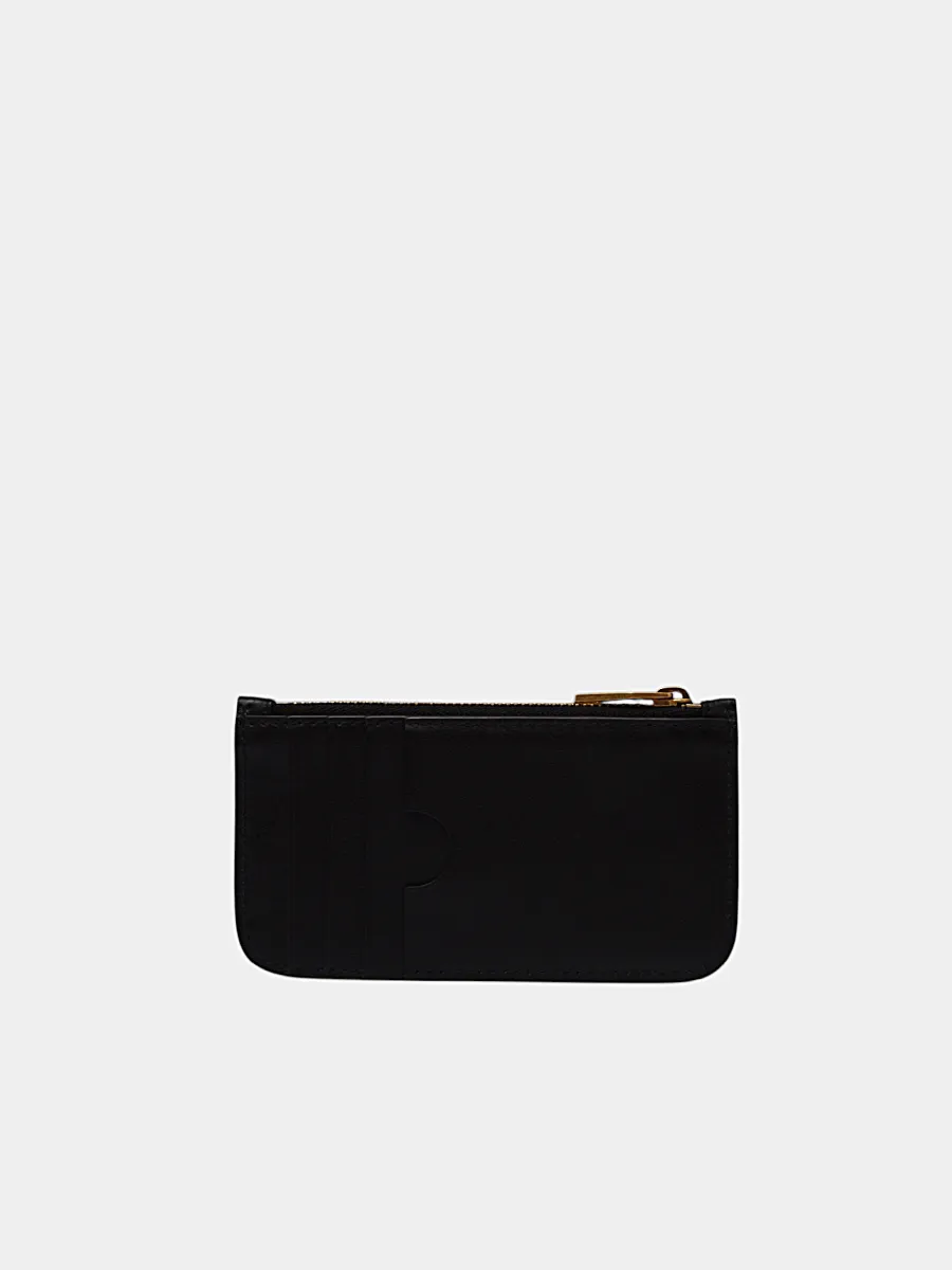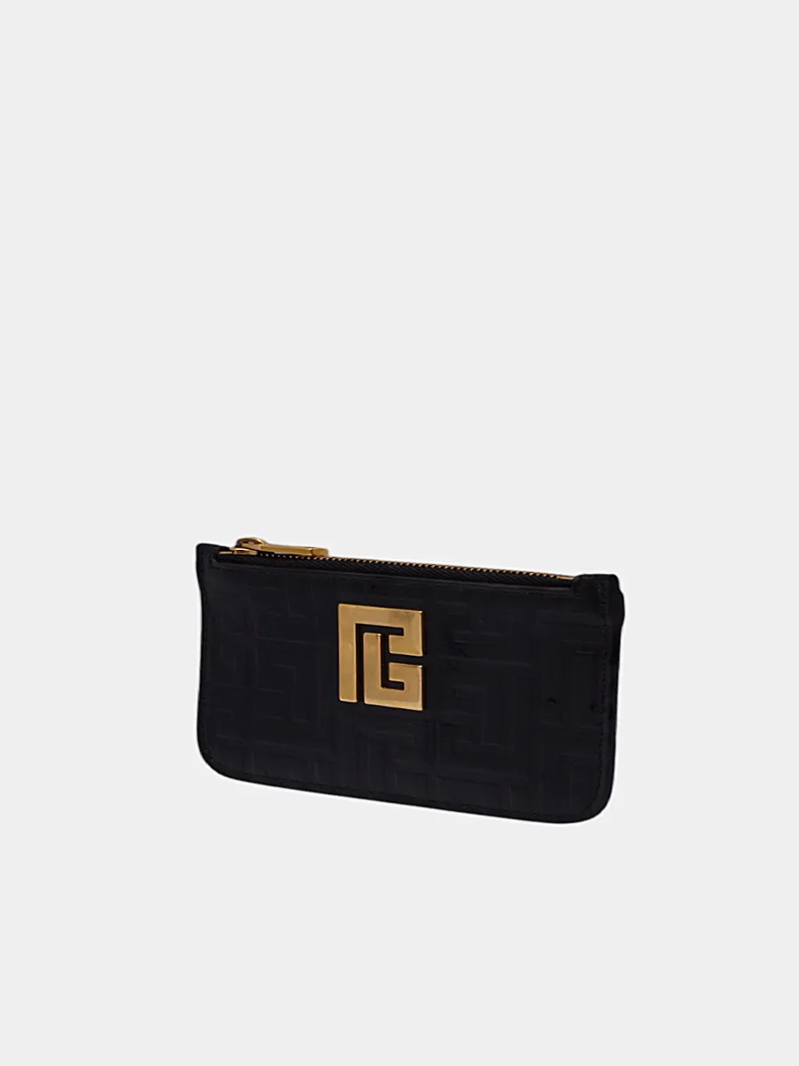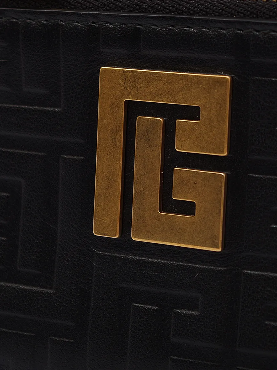 Портмоне Balmain выполнено из гладкой черной кожи с тисненым узором в виде повторяющегося логотипа — сочетание строгости и узнаваемости бренда. Модель с застежкой-молнией, золотистой фурнитурой и крупным металлическим логотипом на передней стороне подчеркивает роскошь и современный стиль. Внутреннее пространство оснащено карманами для карт и монет, а безупречная отделка делает его идеальным аксессуаром для повседневного использования. Истинное воплощение эксклюзивности и мастерства бренда.