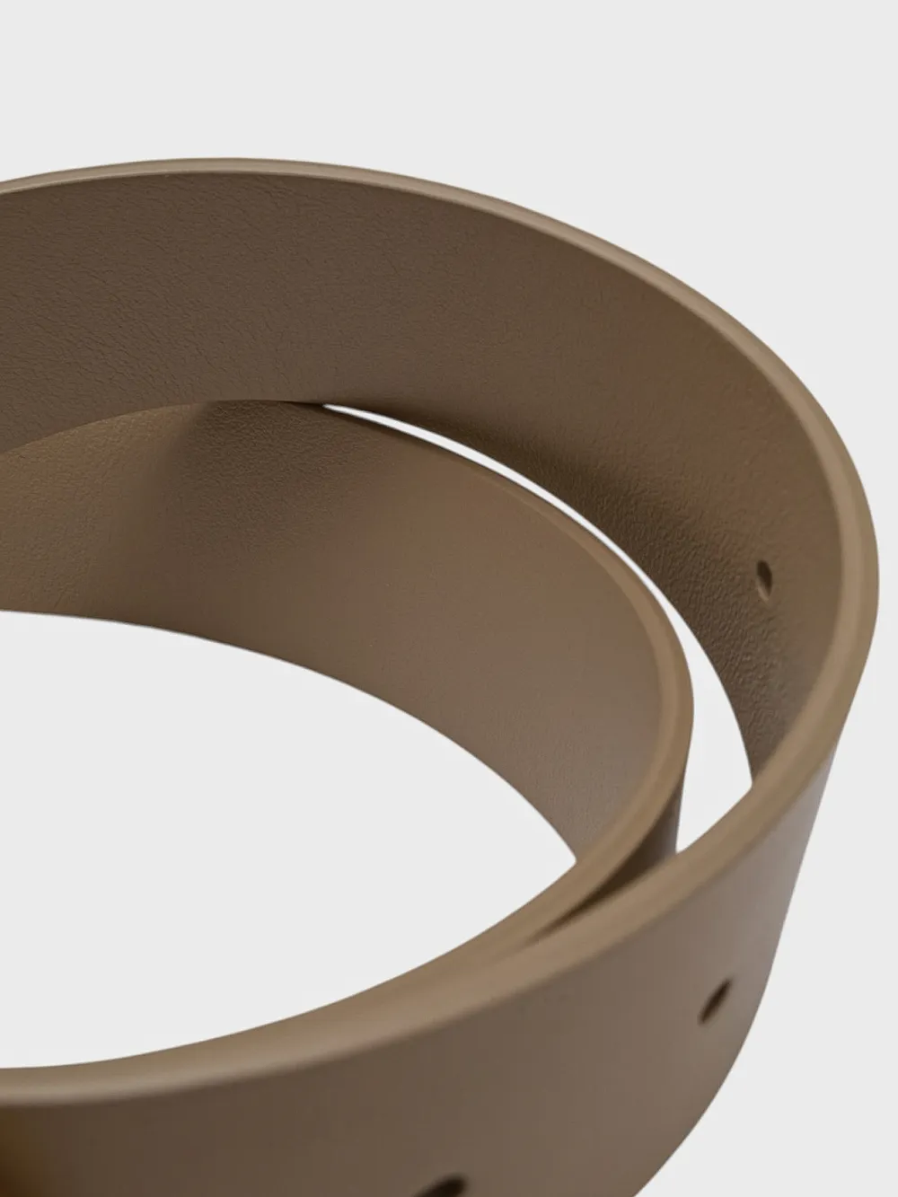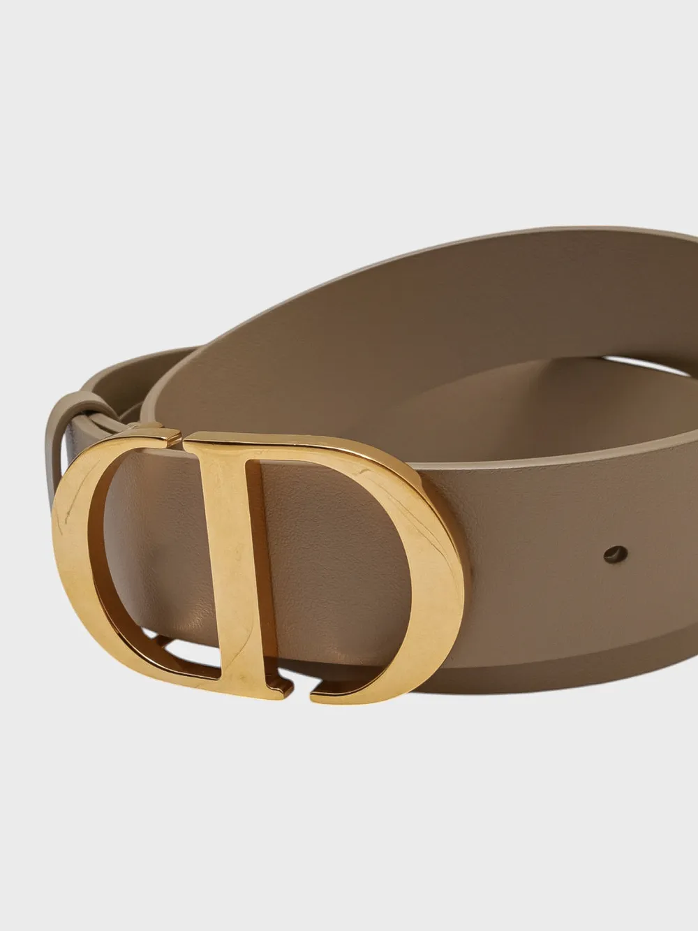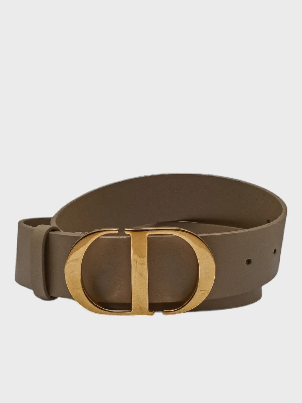 Пояс выполнен из качественной фактурной кожи в нейтральном бежевом цвете, дополненный крупным золотым пряжкой с логотипом. Модель сочетает классический дизайн с современными элементами, идеально подходящая для делового и повседневного стиля.
