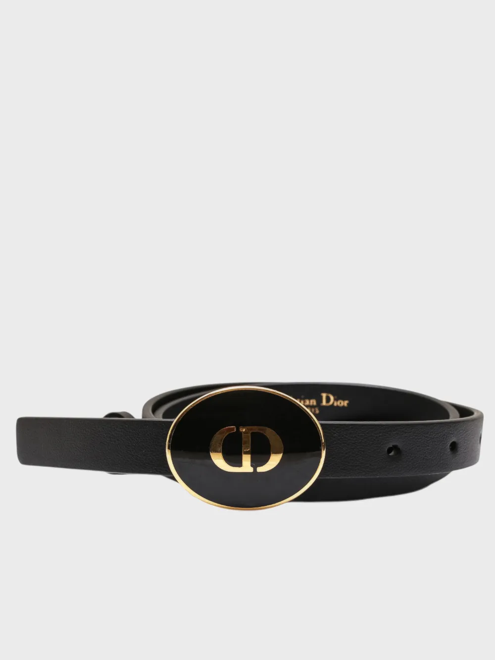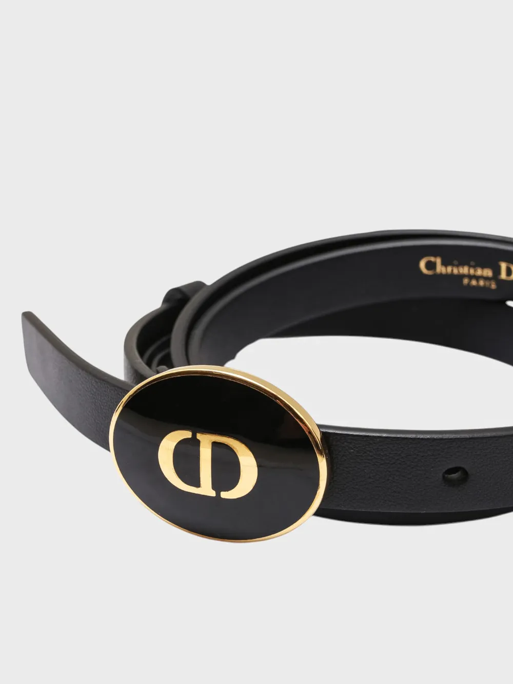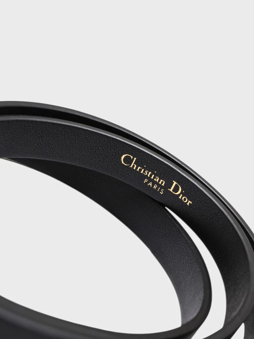 Пояс выполнен из черной кожи с текстурой, напоминающей граненую поверхность. Модель дополнена металлической пряжкой золотого цвета в виде буквы "D", которая служит как декоративным элементом, так и функциональной застежкой. На внутренней стороне пояса размещено название бренда "Christian Dior" золотым шрифтом. Дизайн сочетает классику и современность, идеально подходящий для различных случаев.