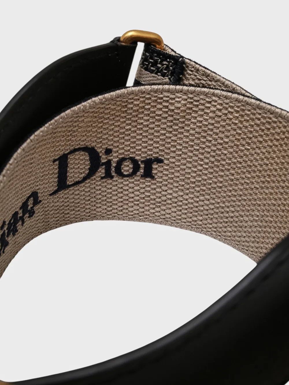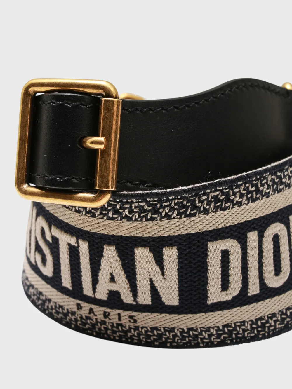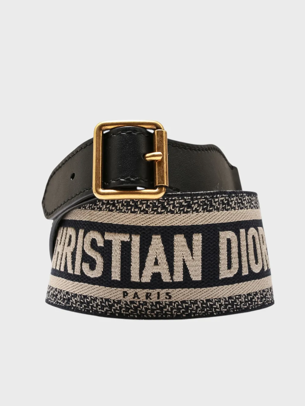 Пояс выполнен из прочного текстиля с крупным логотипом "CHRISTIAN DIOR PARIS" в контрастных тонах. Модель дополнена металлической пряжкой золотого цвета и черной кожаной отделкой, придающей поясу современный и элегантный вид.