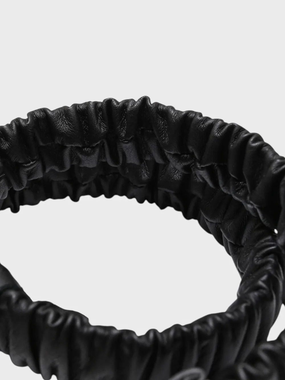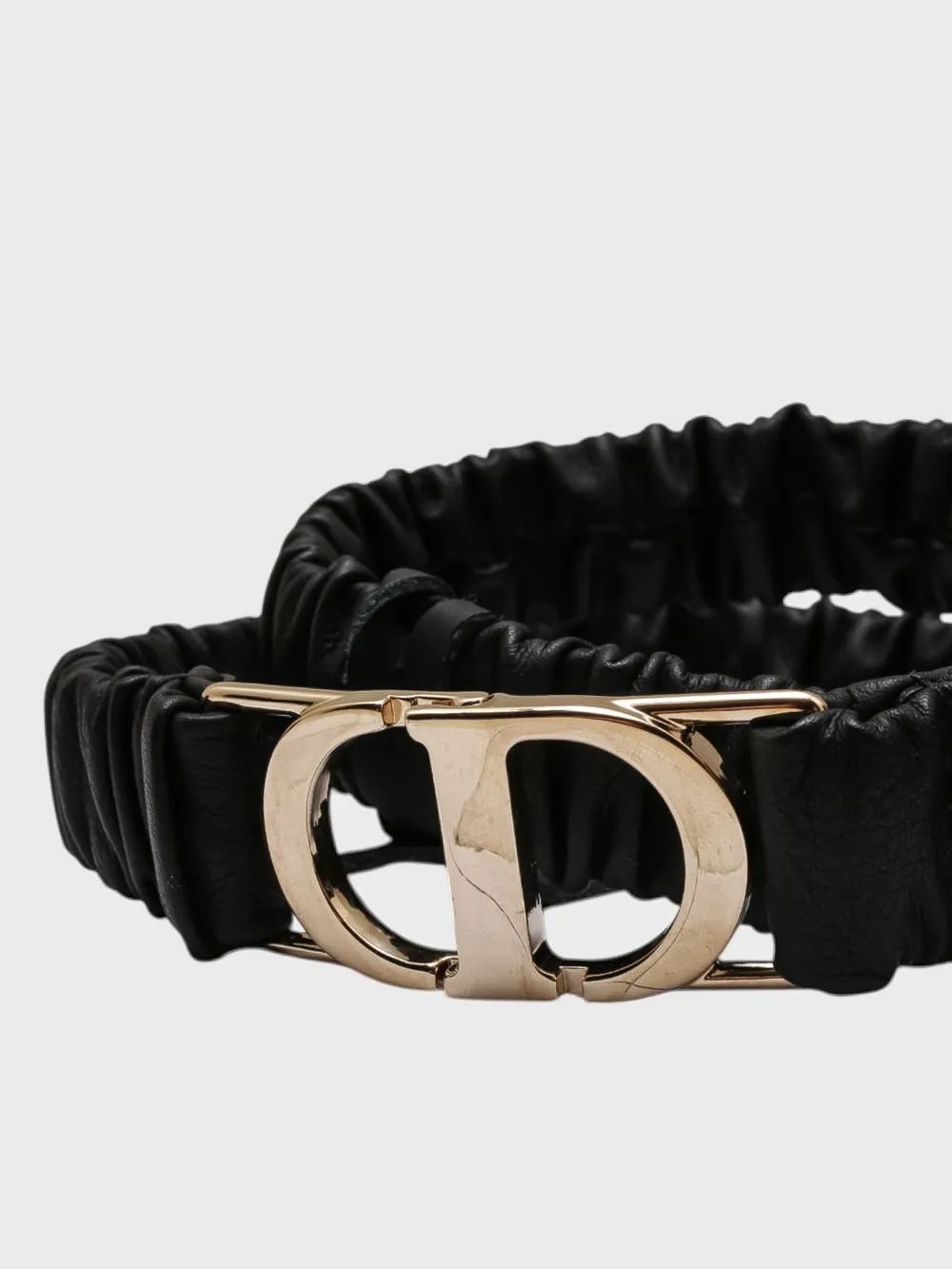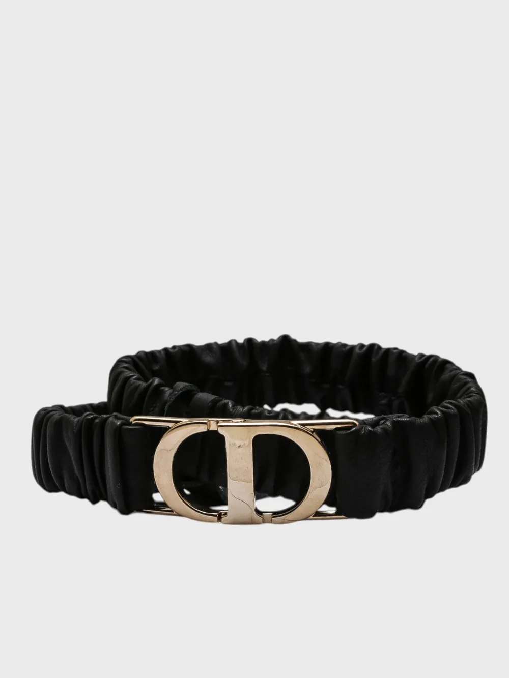 Ремень выполнен из черной фактурной кожи с крупными складками, придающими ему объемный и текстурированный вид. Модель дополнена металлической пряжкой золотого цвета в виде буквы "D", которая служит как декоративным элементом, так и функциональным застежкой. Ремень сочетает современный дизайн с классическим стилем, идеально подходящий для различных случаев.