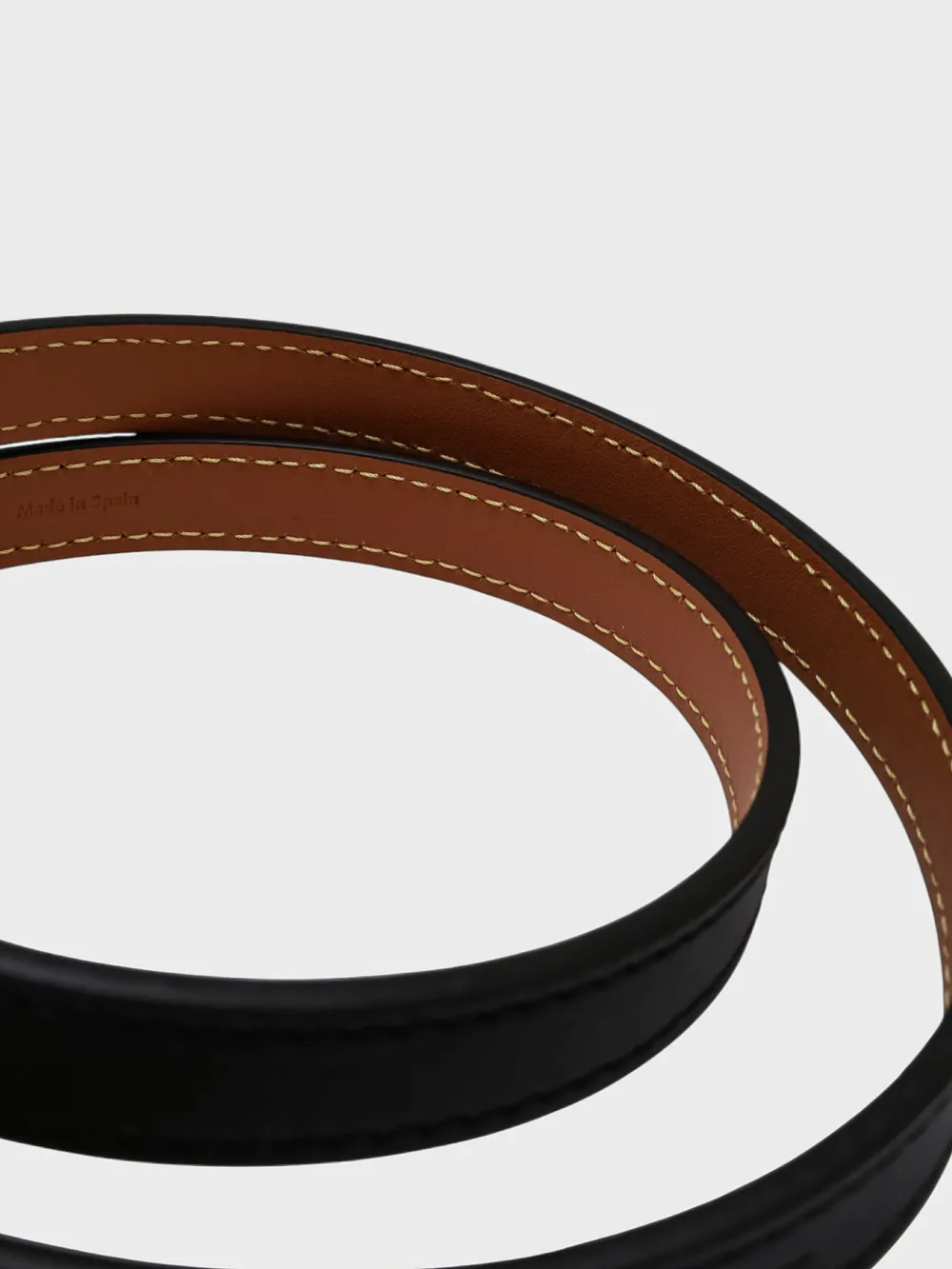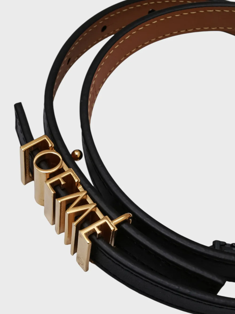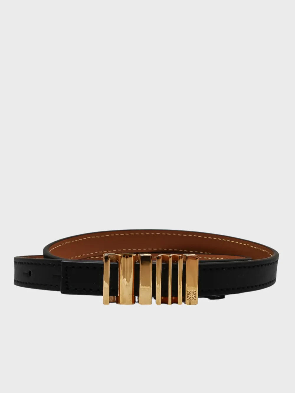 Пояс Loewe выполнен из качественной кожи в комбинации черного и коричневого цветов. Модель дополнена золотой металлической пряжкой с уникальным дизайном, состоящей из вертикальных прямоугольников, каждый из которых содержит элемент логотипа бренда. Тонкая отделка по краям и контрастные швы добавляют изысканности дизайну. Пояс сочетает классический стиль с современными деталями, идеально дополняя как деловые, так и повседневные образы.
