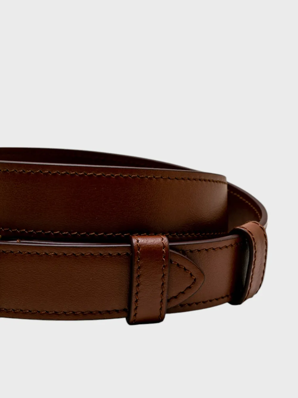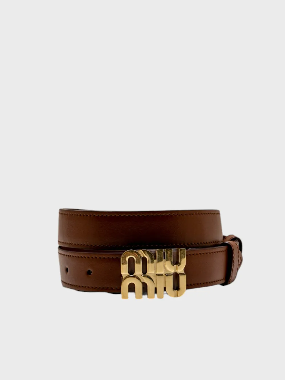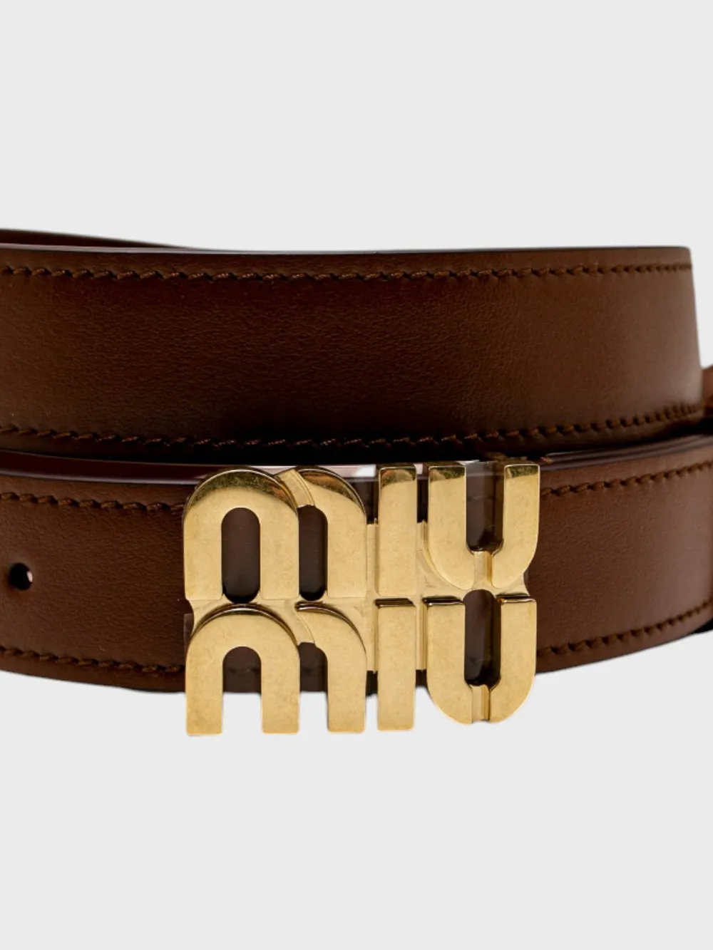 Ремень Miu Miu выполнен из качественной коричневой кожи с гладкой текстурой, придающей ему элегантный и классический вид. Модель оснащена золотым металлическим пряжкой с фирменным логотипом "MM" в виде крупных букв, которая добавляет узнаваемость бренда. Ремень имеет регулируемую длину для комфортного использования. Простота дизайна и качество материалов подчеркивают современный стиль бренда.